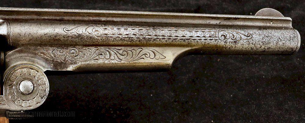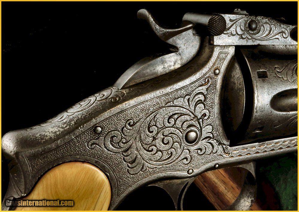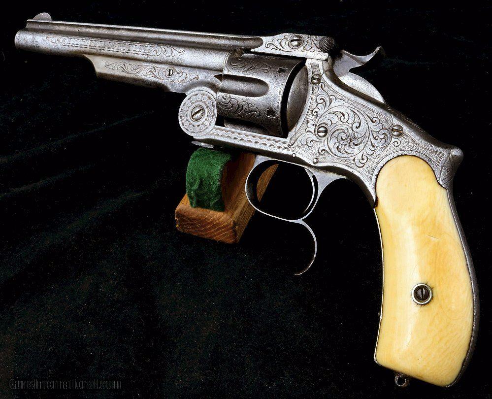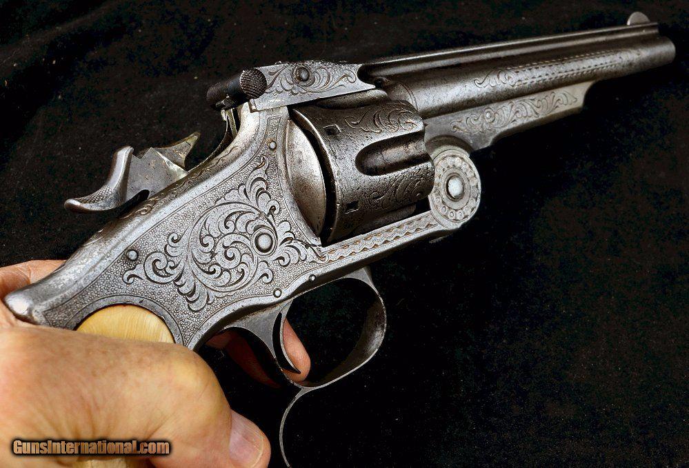 Description: SCARCE ENGRAVED SMITH & WESSON NO. 3, 2ND MODEL RUSSIAN SINGLE ACTION REVOLVER. 44 Russian caliber. An ORIGINAL Period of use New York style scroll engraved Russian, with a very attractive uncleaned patina finish... Has the standard 7 inch barrel. Mechanically this S&W Russian is in fine working order. ALL parts are original to this revolver. ... including the Ivory Grips... On his visit to America in 1874, the Grand Duke Alexander Alexandrovich of Russia, along with George Custer, and Bill Cody, went on a "Royal Buffalo Hunt"... The Grand Duke carried a Smith Second Model RUSSIAN in his belt sash, and when trying to shoot a Buffalo with it, "he accidentally shot the horse he was riding on." Very handsome, honest, and affordable Wild West cowboy gun... These have always been hard to find. ANTIQUE Circa 1873 SOLD Antique: Yes |