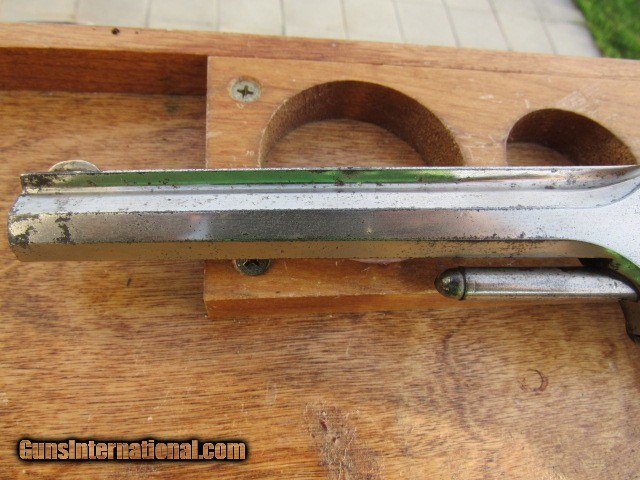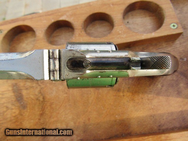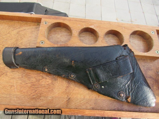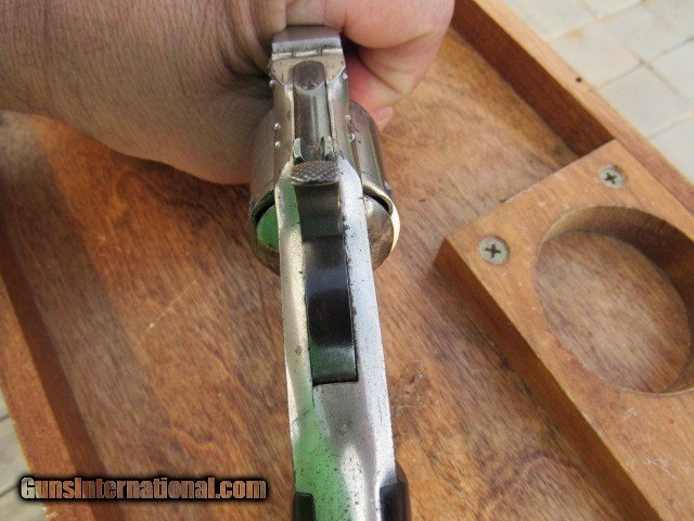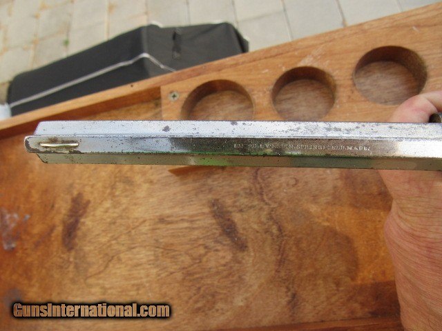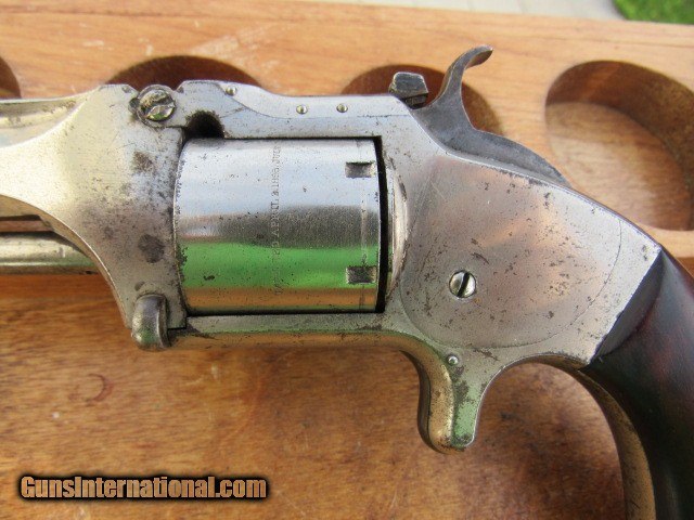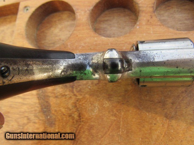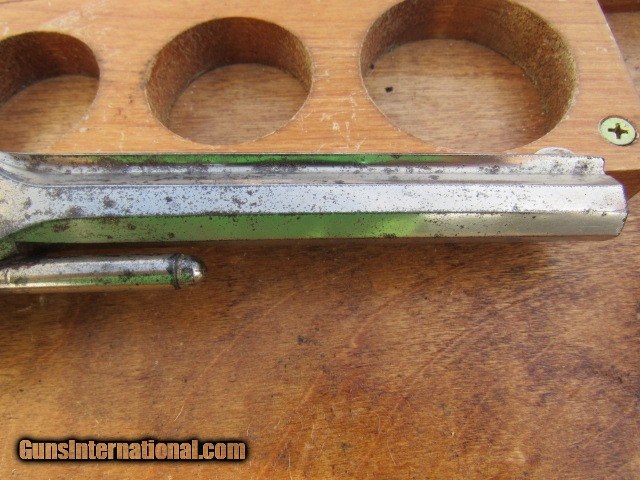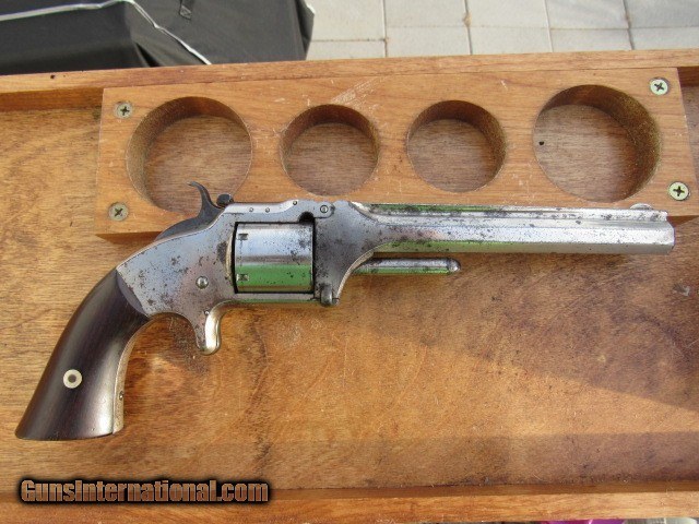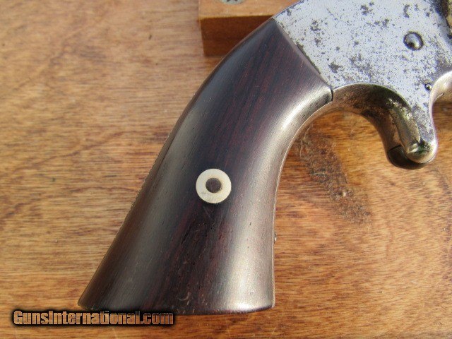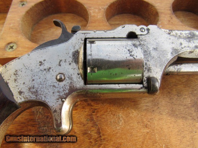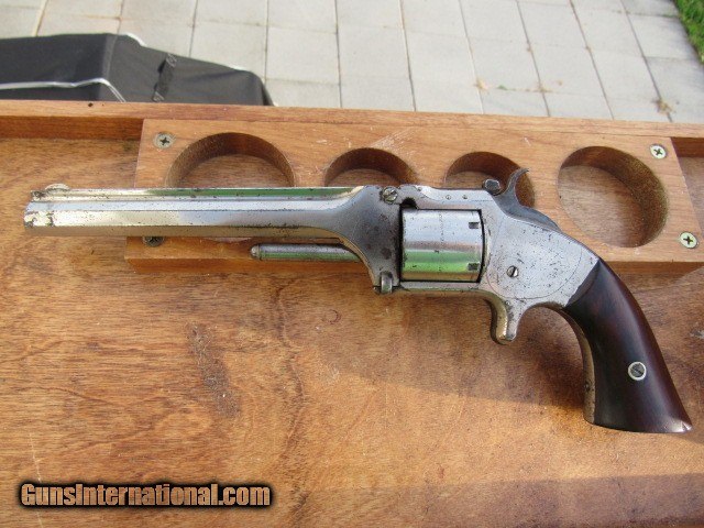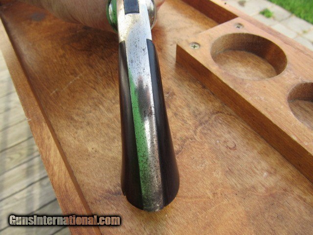 Description: DESCRIPTION: Smith & Wesson #2 Old Model Army 6-shot revolver in caliber 32 Rimfire Long, 6" octagon barrel, full nickel finish, rosewood grips, square butt design, single-line barrel address on top rib and single-line patent date on the correct unfluted cylinder, half-moon brass front sight, rear sight notch integral with cylinder catch, top-hinge with barrel catch at bottom, single action, correctly lacking a half cock or safety feature, smooth spur trigger, serial # 19342, made 1864, was a popular backup gun for many Civil War participants. Comes with a correct black leather holster in which the revolver fits perfectly. CONDITION: Retains 90% original thinning nickel plate over the blued barrel and brass frame, with the loss being spotty, especially in the high-traffic areas. Original rosewood grips are in near new condition, having only one ding at bottom left. Serial # matches on bottom of grip and inside of left grip wood. Assembly number matches on left lower frame, cylinder and barrel at breech. Bore is very good with sharp rifling and just minor scattered black powder fouling. Action is very tight and cylinder indexes perfectly every time. Just a hint of play in the top hinge. Holster is not marked anywhere that I can find and shows much cracking from age/drying but all rivets intact as well as brass flap catch. Hard to find a 155-year-old gun in this condition so don't pass this one up!! TERMS: No international sales. Antique, so it can ship directly to you assuming your local laws allow it. Payment by bank check, money order, personal check, or all major credit cards with 3% surcharge. 3 day non-firing inspection. Buyer pays return shipping. Layaway available with 25% down and equal payments over 90 days. Offers considered. Thanks for looking. SOLD Antique: Yes Manufacturer: Smith & Wesson Model: #2 Old Model Army Serial Number: 19342 Caliber Info: 32 Rimfire Long Condition: Excellent Metal Condition: Excellent Wood Condition: Excellent Bore Condition: Very good Barrels: 6" octagon Action: Revolver Triggers: Spur style Stock: Rosewood Manufacture Date: 1864 Extras: Holster Item Location: New York |