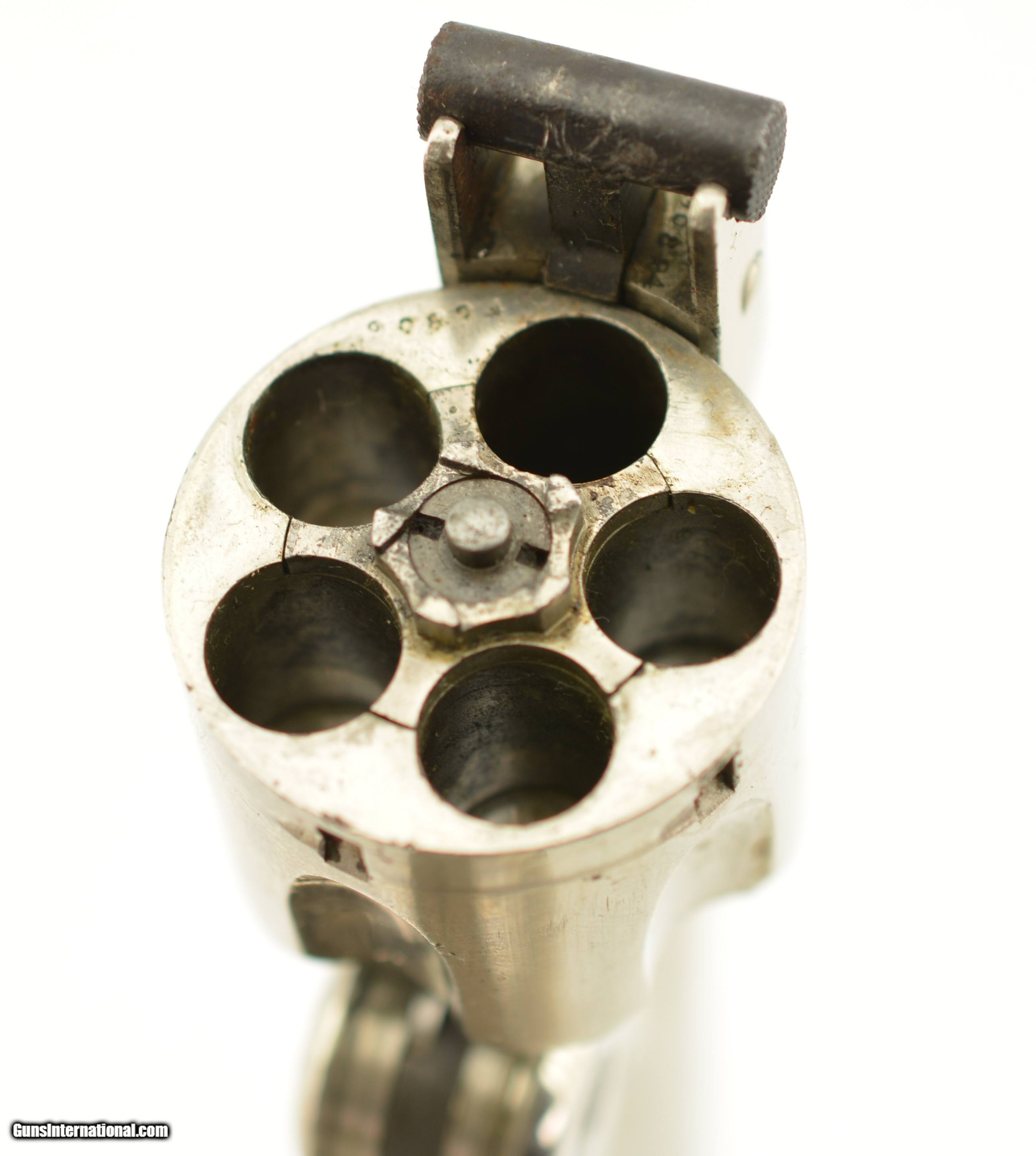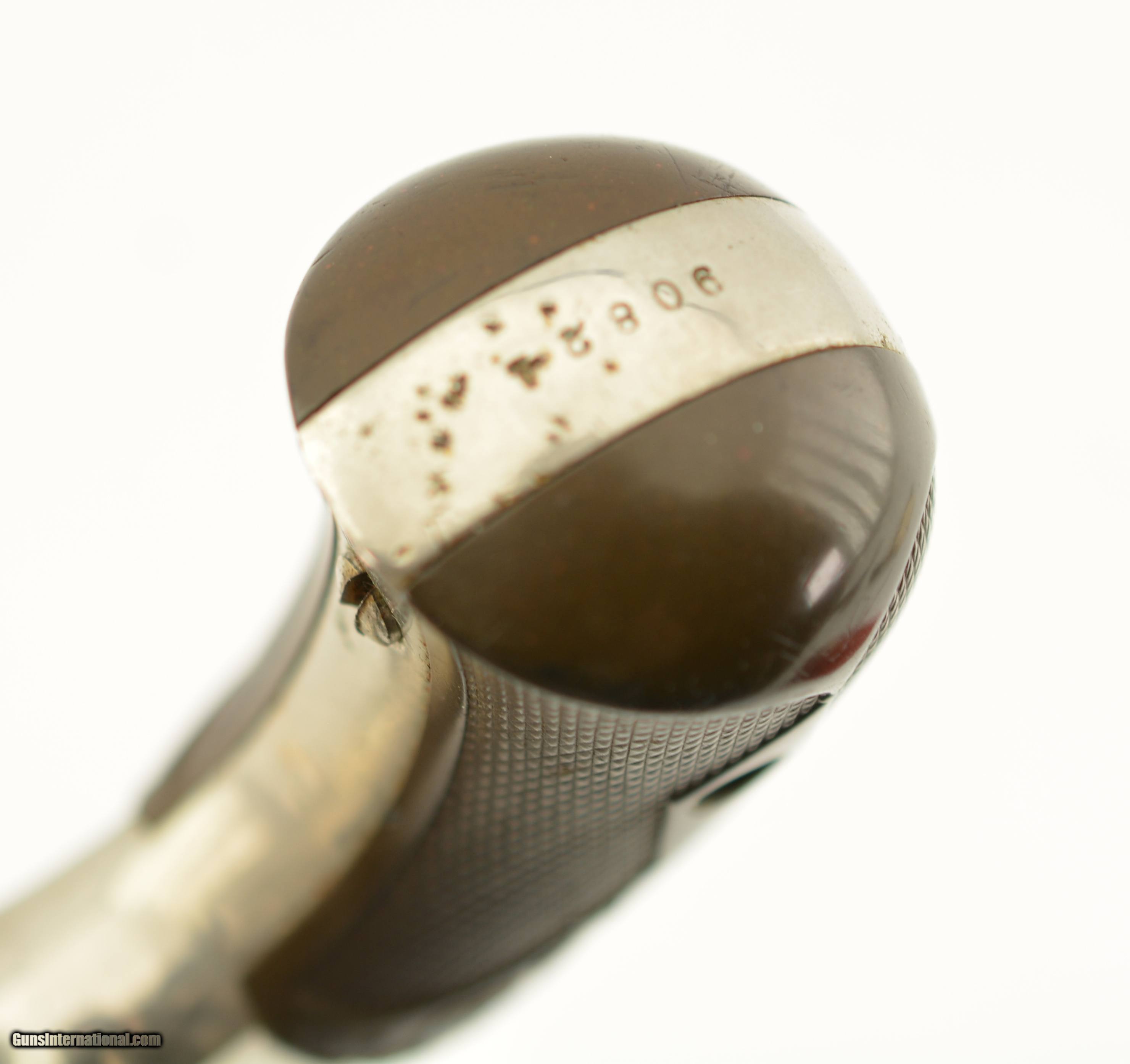Description: Serial #90824, .32 S&W (Black Powder), 3 inch barrel with a fine dark bore with scattered light pitting and strong rifling. This is a later Model One-and-a-Half Centerfire, top break revolver manufactured by Smith and Wesson from 1878-1892 with this example having the later reissue “July 25, 1871" patent date on the barrel. It is in excellent condition retaining about 90-93% of the original nickel plating finish with scattered small areas of flaking. The later style Brown checkered hard rubber grips with fancy intertwined S&W logo are likewise excellent without any cracks or chips and slight wear to the high points. Mechanically the single-action, rebounding hammer revolver functions properly with a slight hesitation when cocking on some cylinders but does time and lock up tight. Antique SOLD Antique: Yes Manufacturer: S&W Model: 1 1/2 Caliber Info: .32 S&W Gauge Info: .32 S&W |