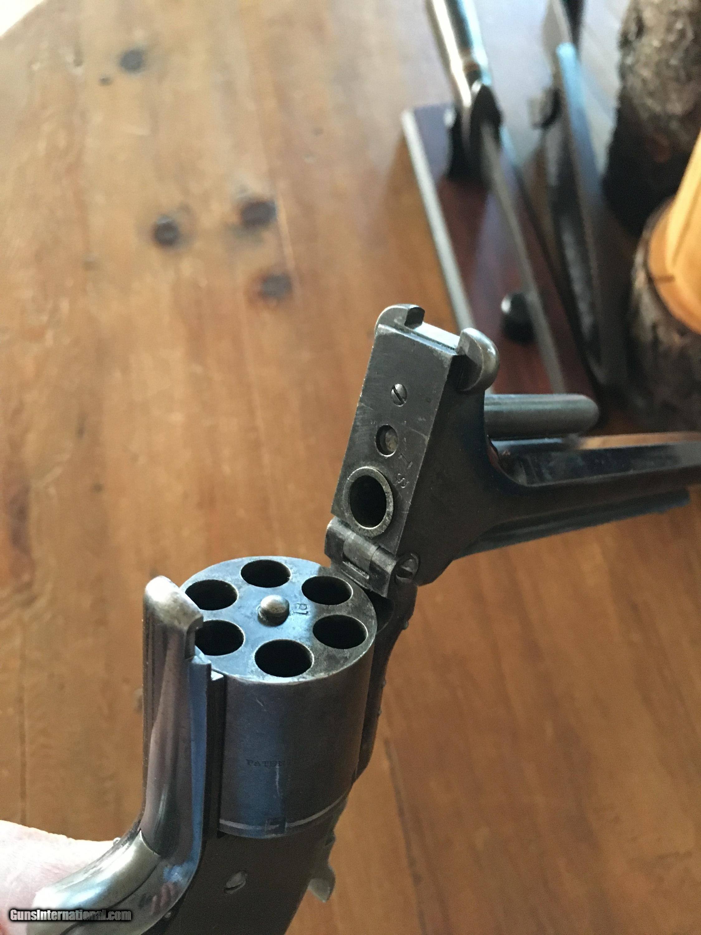 Description: Cal. 32 RF. SN 40123. Bbl. 5" oct. w/ rib & semi-circular German silver front sight. 6 Shot fluted cyl. Blue finished spur trigger, tip up action w/case colored hammer & trigger. 2 Piece rosewood grips. Estimated 77,155 manufactured 1861 - 1864. UNATTACHED ACCESSORIES: unmarked leather belt holster w/ leather stitching. CONDITION: 70% lightly faded original blue showing minor scatches. Original grip finish slows light wear. Sound mechanics and tight hinge! Lightly pitted bore retains intact rifling. SOLD Antique: Yes Handgun Caliber: .32 Rimfire Manufacturer: Smith & Wesson Model: Model 2 Old Army Serial Number: 40123 Bore: Good Chambers: Good Ejectors: Good Condition: Good to Very Good Metal Condition: 70% blued Wood Condition: Light Wear Bore Condition: Light pitting Barrels: Good Action: SA |