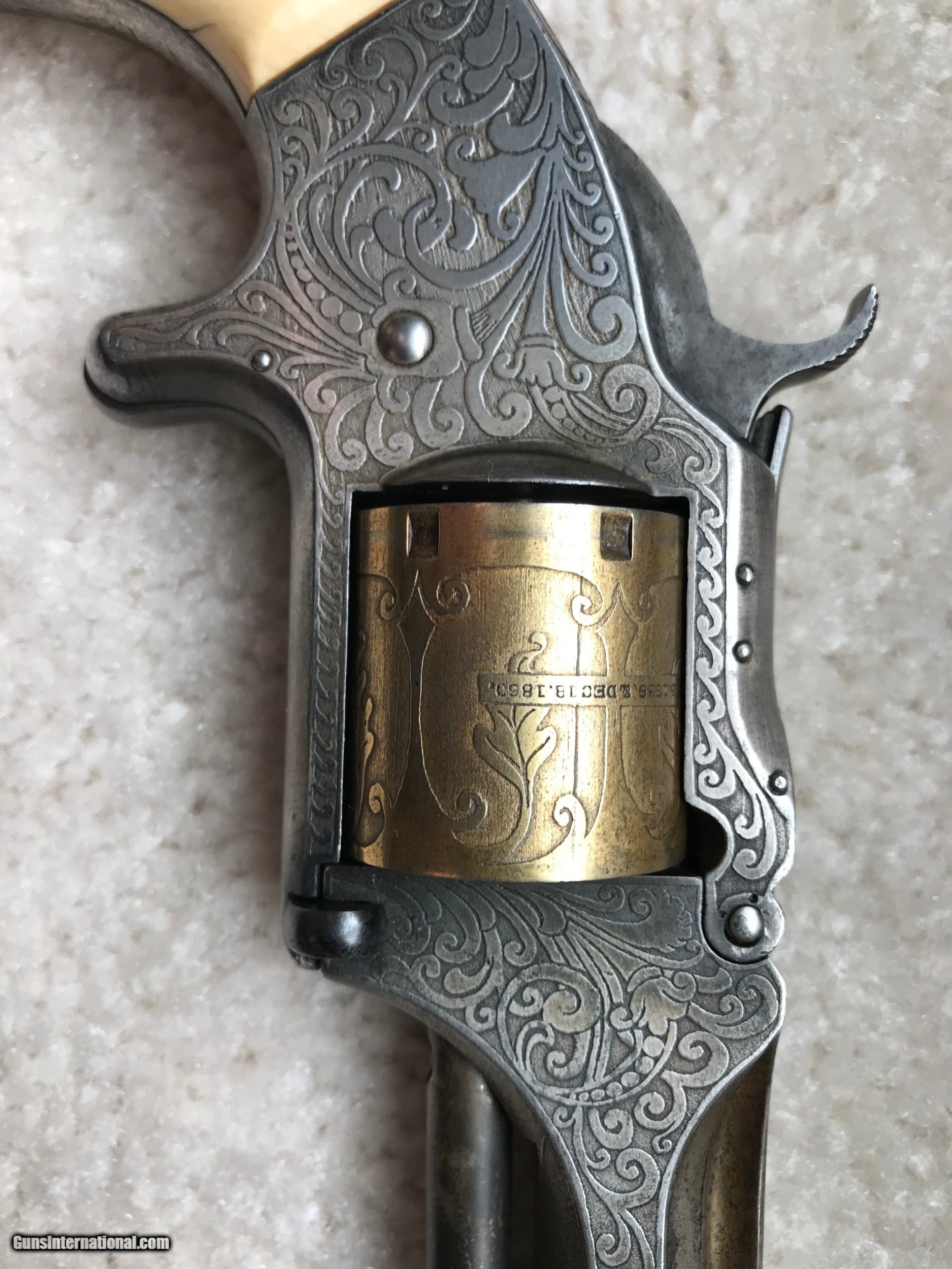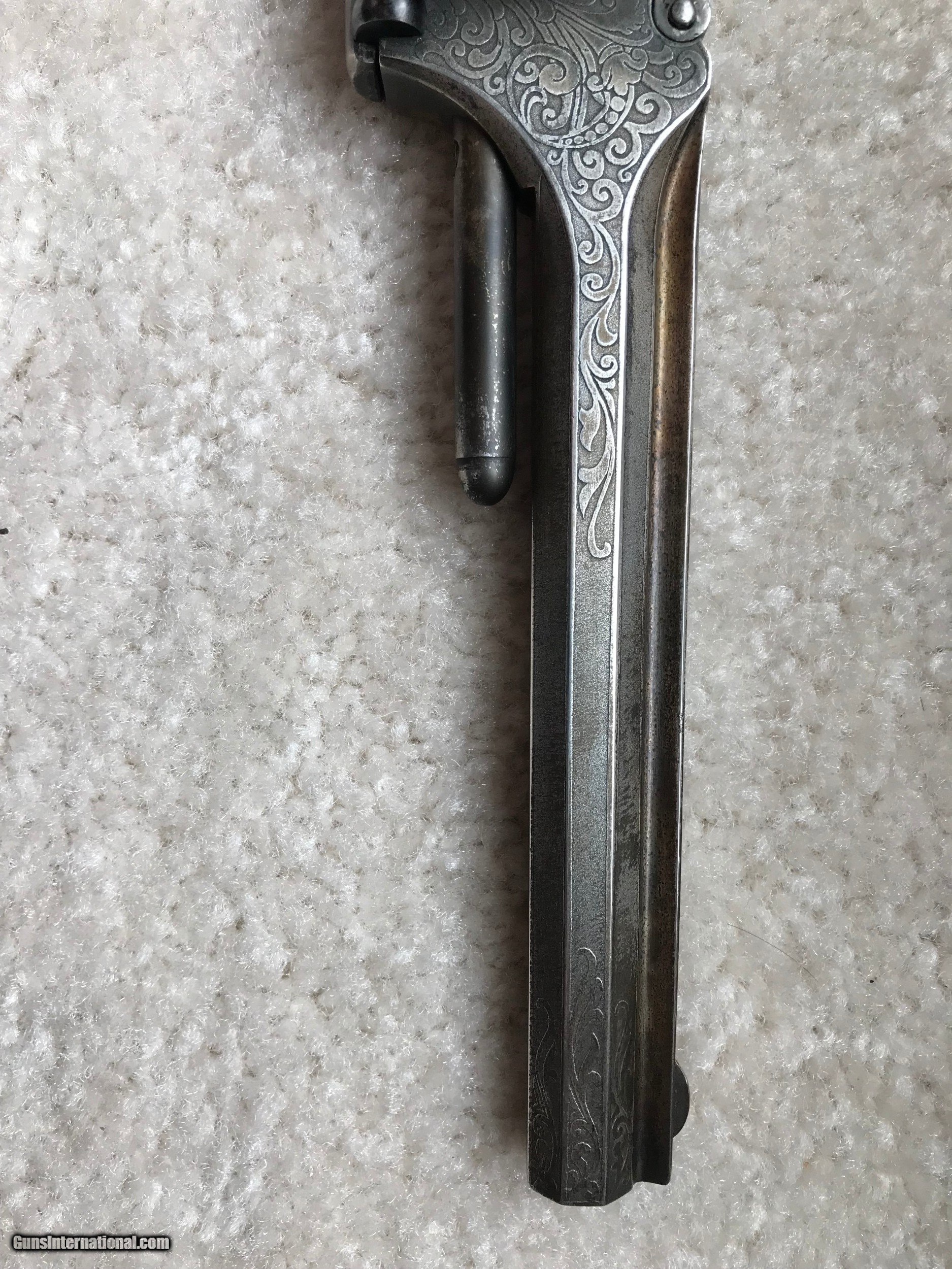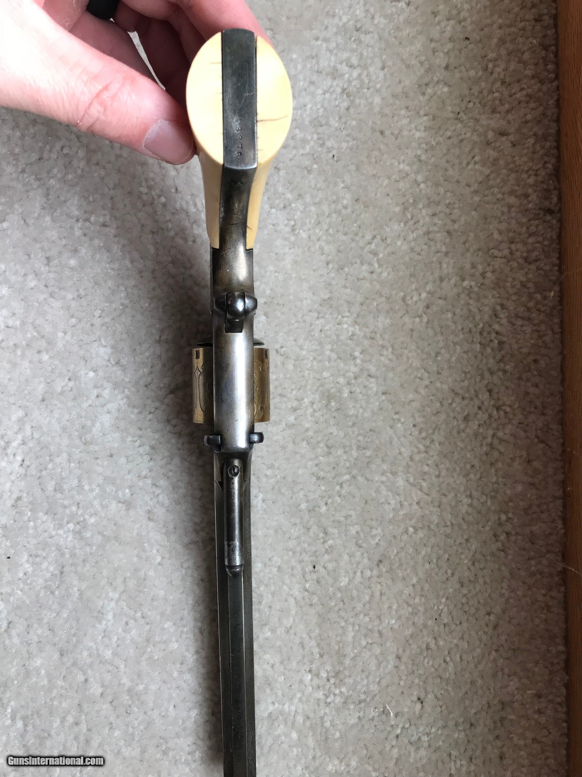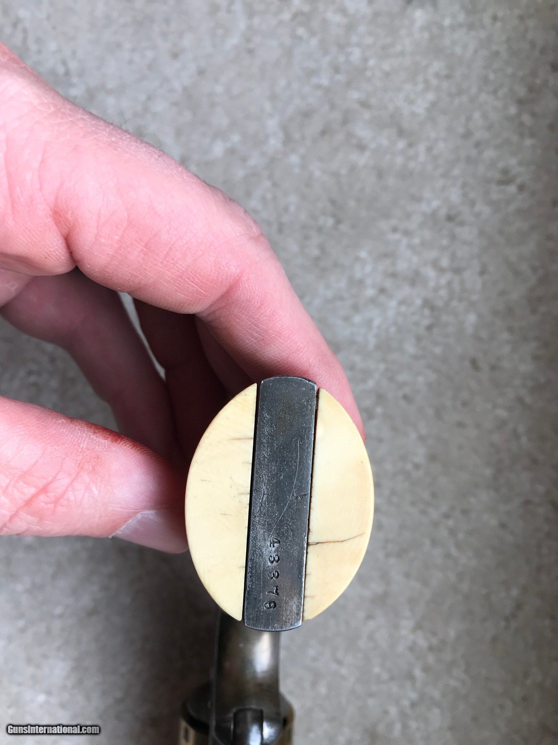 Description: Smith & Wesson Model 2 Old Army 6" Barrel Silverplated Etched Revolver with Gold Cylinder Ivory Grips in excellent condition. Retains nearly all the silverplated finish and it has tarnished in some areas. Matching assembly numbers. Early smith and wesson etched revolvers are very rare. See ://rockisland/detail/77/1140/acid-etched-engraved-sw-model-no-2-old-army-revolver-with-case for a similar example. I have multiple smiths listed, discounts can be given for multiple purchases. SOLD Antique: Yes |