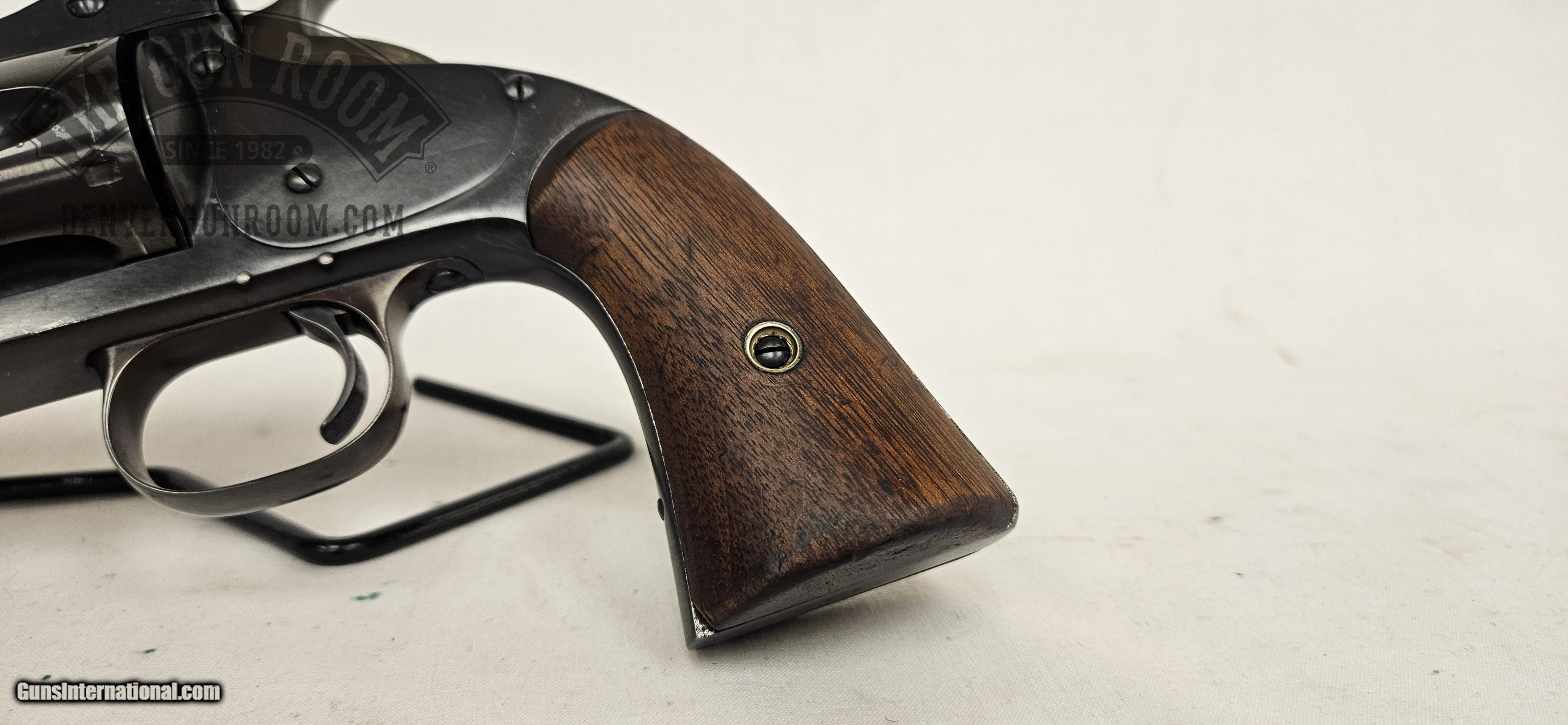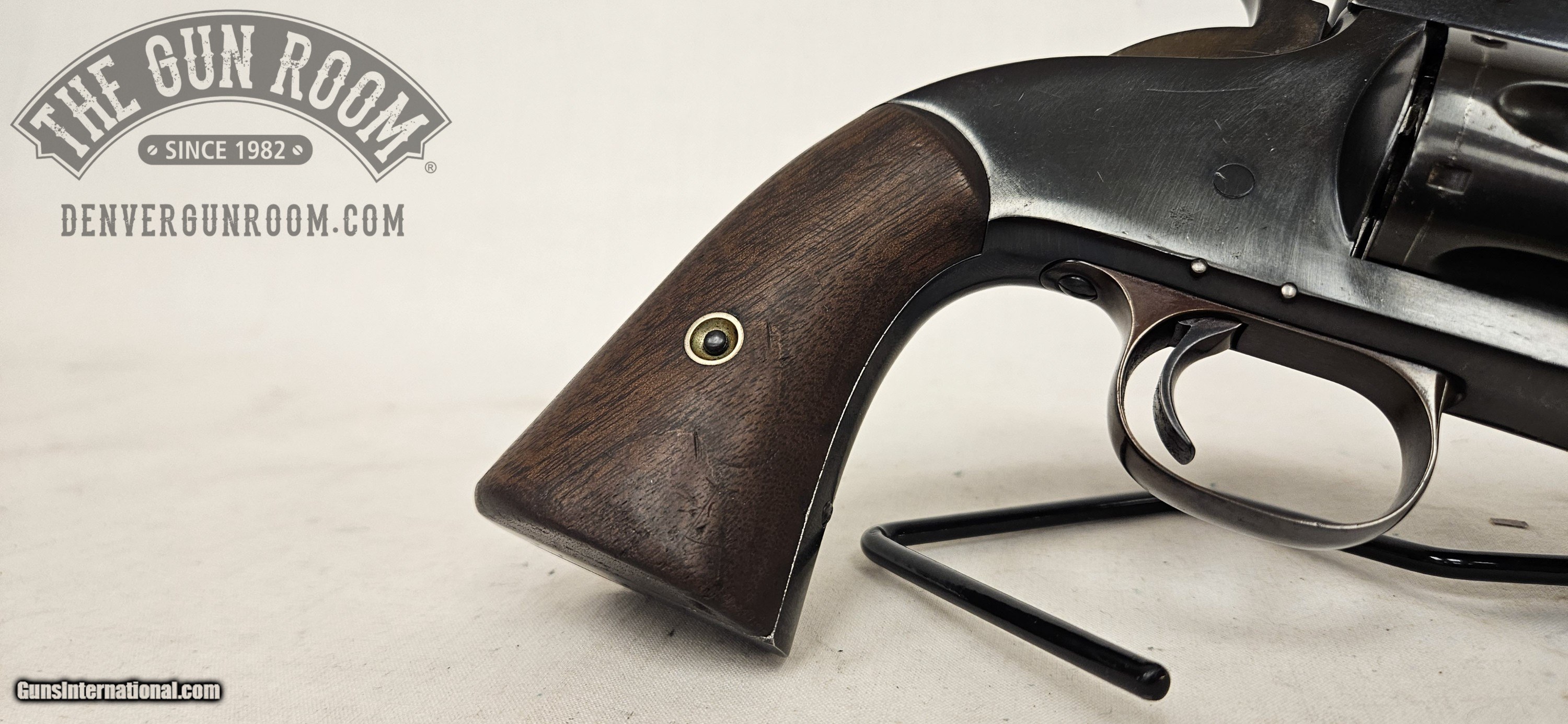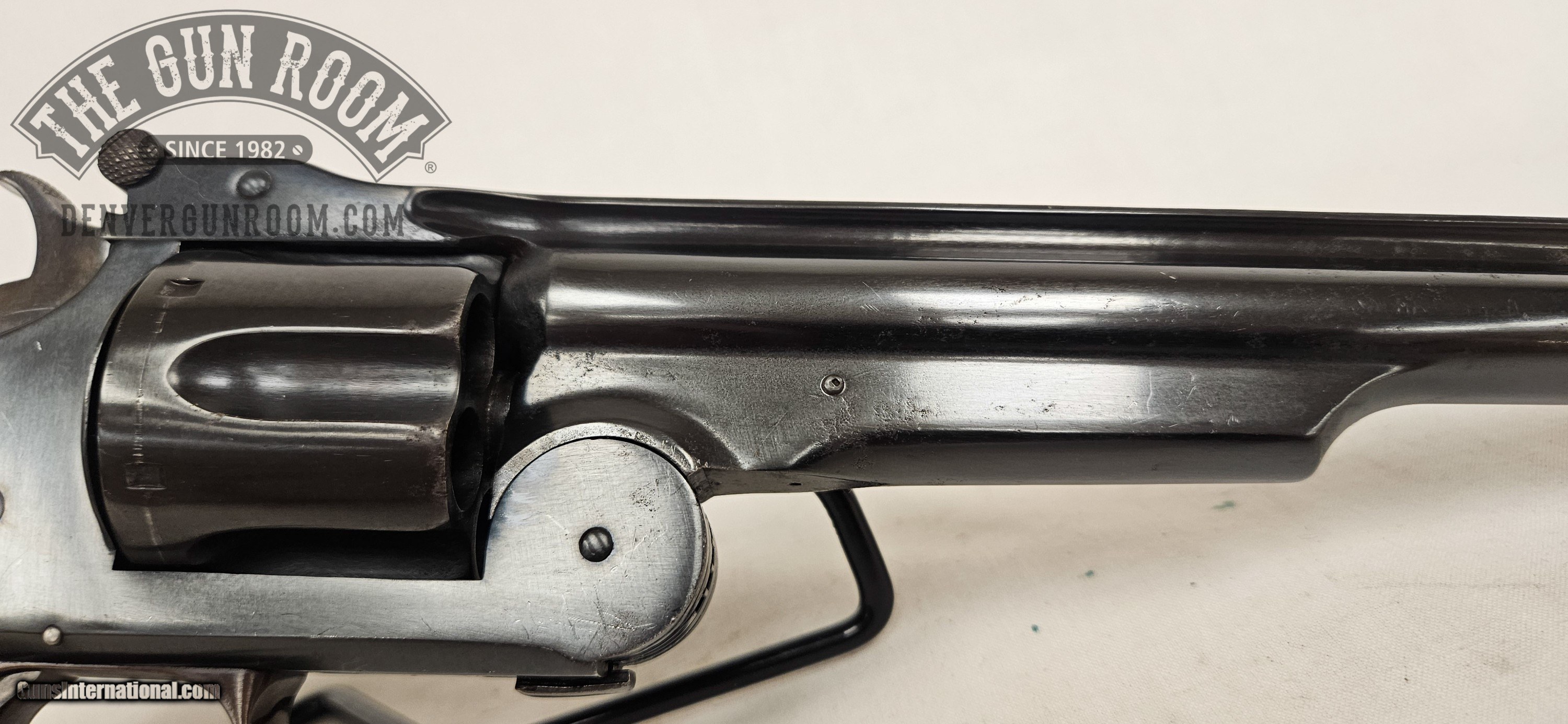 Description: Up for sale is a Smith & Wesson Model 3 American chambered in .44 S&W. This revovler has a 8" barrel, with strong rifling and good shine, but the bore is pretty well pitted. The top latch spring is missing. "...butt serial number 316 was shipped from our Stockbridge Street factory on February 19, 1871. It was delivered to M W Robinson, New York City our largest distributor at the time. The records indicate that this revolver was shipped with a blue finish with an 8-inch barrel with a German silver round blade front sight inserted and pinned in the barrel rib. The rear sight was a notch cut in the in the stop lug of the barrel catch, with smooth walnut square butt stocks. It was part of a large order to Robinson. Antique: Yes Handgun Caliber: .44 American Manufacturer: Smith & Wesson Model: 3 American Barrel Length: 8 Bore Condition: Very Good Item Location: Lakewood, CO Price: $4,995.00 Buy Now Contact Seller |
