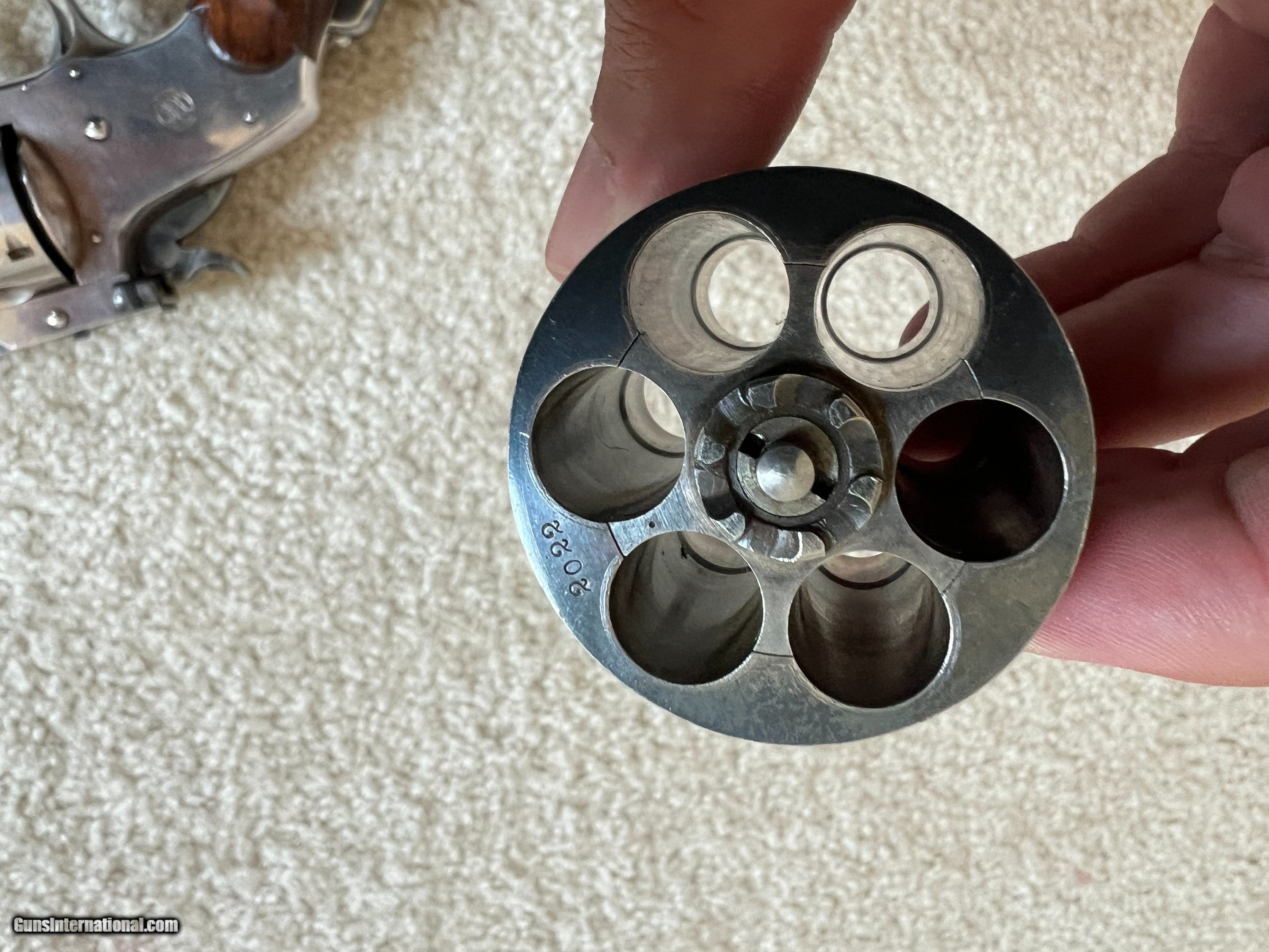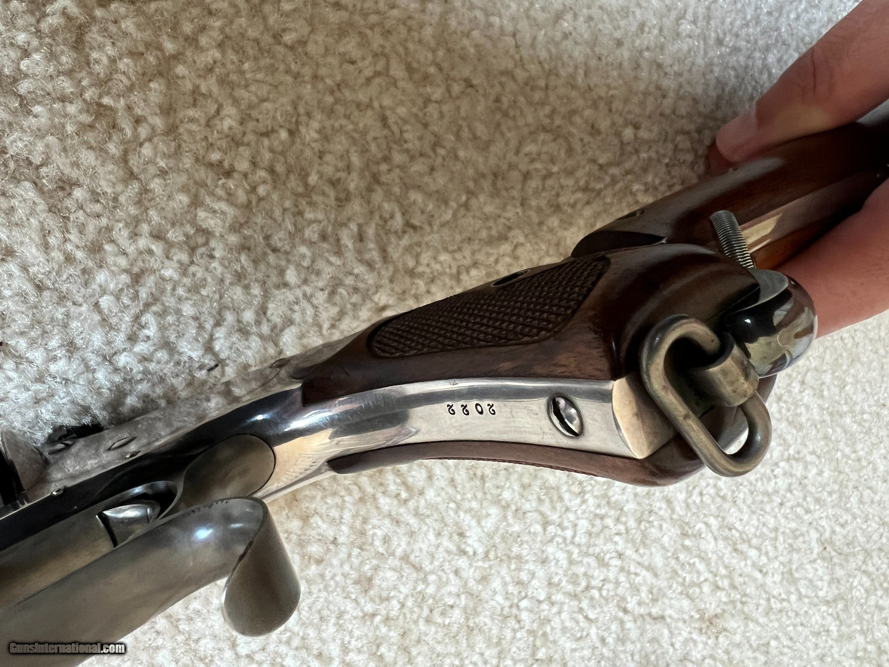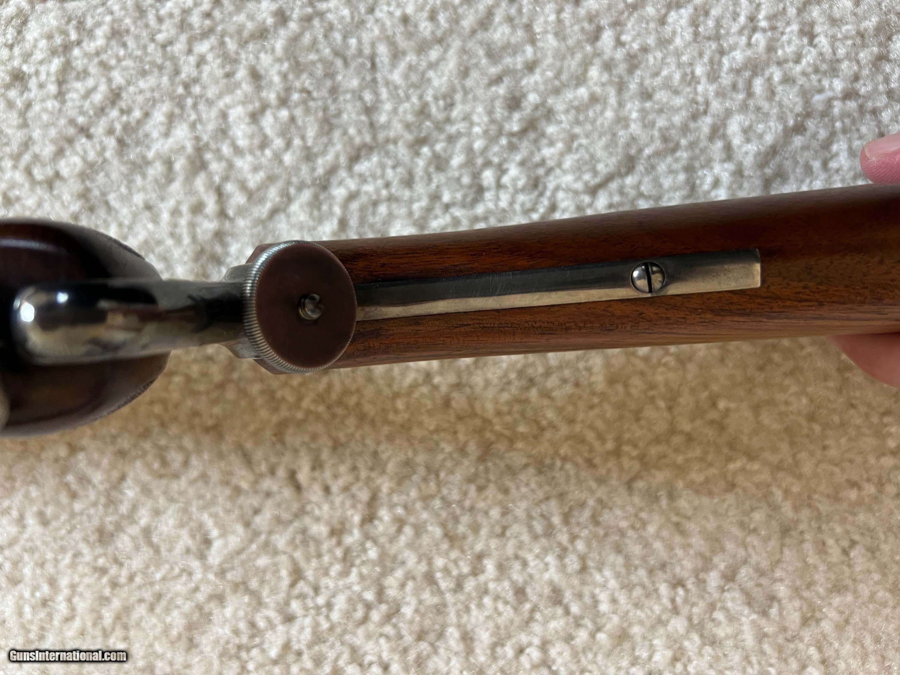Description: Smith & Wesson New Model 3 Frontier with 98% Factory original Silver Plate and Shoulder Stock (silver plated) 44-40 and extra 44 Russian cylinder. This gun is in excellent factory original condition including excellent bore and mechanics. Letter states Shipped 1903 with all extras listed, Adjustable signts, russian trigger guard, silver finish, checkered wood grips, extra cylinder in 44 russian and shoulder stock. Exceptional set. Silver has tarnished and needs polished on extra cylinder and shoulder stock. All serial numbers match. SOLD Antique: Yes |