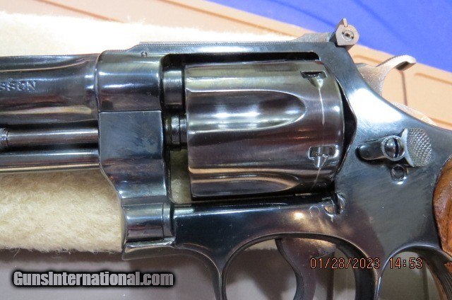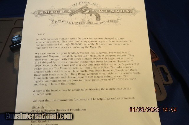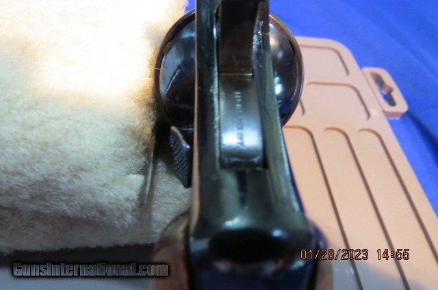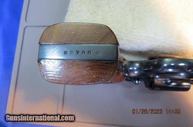 Description: ATTENTION SMITH & WESSON COLLECTORS, RARE, RARE TRUE REGISTERED MAGUM 357, 4 INCH BLUE PRE WORLD WAR II REGISTERED MAGNUM SIX SHOT, SERIAL NUMBER 59700, WITH REGISTRATION NUMBER 5115. MANUFACTURED SEPTEMBER 7,1939, RECORDS SHOW PART OF A 250-UNIT ORDER AND DELIVERED TO THE DEPARTMENT OF POLICE, KANSA CITY MISSOURI, ATT; L. REED CHIEF OF POLICE. THE ORDER SHOWS IT WAS SHIPPED WITH A 4-INCH BARREL, BLUE FINISH, HUMPBACK HAMMER, BRAUGHMAN QUCK DRAW REAR SIGHT BLADE ON A PLAIN KING RAMP, ADJUSTABLE REAR SIGHT WITH A SQUARE NOTCH, HUMPBACK HAMMER AND CHECKERED SQUARE BUTT MAGNA WALNUT STOCKS. THE FACTORY STOCKS ON THIS REVOLVER ARE NUMBERED TO THIS REVOLVER. THIS IS A ALL MATCHING NUMBERS REVOLVER. THE REGISTRATION NUMBERS ON THE GUNS IN THIS SHIPPMENT WERE 4987 - 5236 INCLUSIVE AND THIS GUN FALLS IN THAT RANGE, IT IS BELEIVED BUT NO TRUE PROOF THAT THIS REVOLVER WAS CARRIED BY CHIEF L. REED OR ONE OF HIS ASSISTANT CHEIFS. THIS WAS A SPECIAL ORDER GUN OUT OF THE 250 UNIT PURCHASE. THIS IS A VERY RARE REVOLVER. THIS REVOLVER IS USED WITH NO BOX BUT IS IN 99% NO WEAR JUST A SLIGHT TURN LINE AS ON ALL USED SMITH & WESSON REVOLVERS. DOES NOT APPEAR TO HAVE BEEN SHOT VERY MUCH AT ALL. I am a private collector. . Due to new shipping rules and regulations it must go FFL to FFL dealer. Shipping will be a TOTAL of $95.00. I must have a copy of your FFL dealers license emailed to me for shipment. I will email shipping FFL information to them when they email theirs to me. Insurance will be avaliable for purchase at the rate of $1.80 per hundred if desired. Payment MUST be made by USPMO, BANK CERTIFIED CHECK OR BANK MONEY ORDERS ONLY. Payment must be received within 10 days of the closing or the item will be relisted. All items are being sold out of my private collection. All items sold as is no warranty or returns. PLEASE take a look at all of my listings.Go to top of page on far upper right side click on 1 st blue box SEE ALL LISTINGS FOR winchester51. NO OFFERS OR TRADES. SOLD Handgun Caliber: .357 Magnum Manufacturer: SMITH & WESSON Model: REGISTERED MAGNUM Serial Number: 597XX Barrel Length: 4 INCH Condition: LIKE NEW Metal Condition: LIKE NEW Wood Condition: LIKE NEW Bore Condition: LIKE NEW |