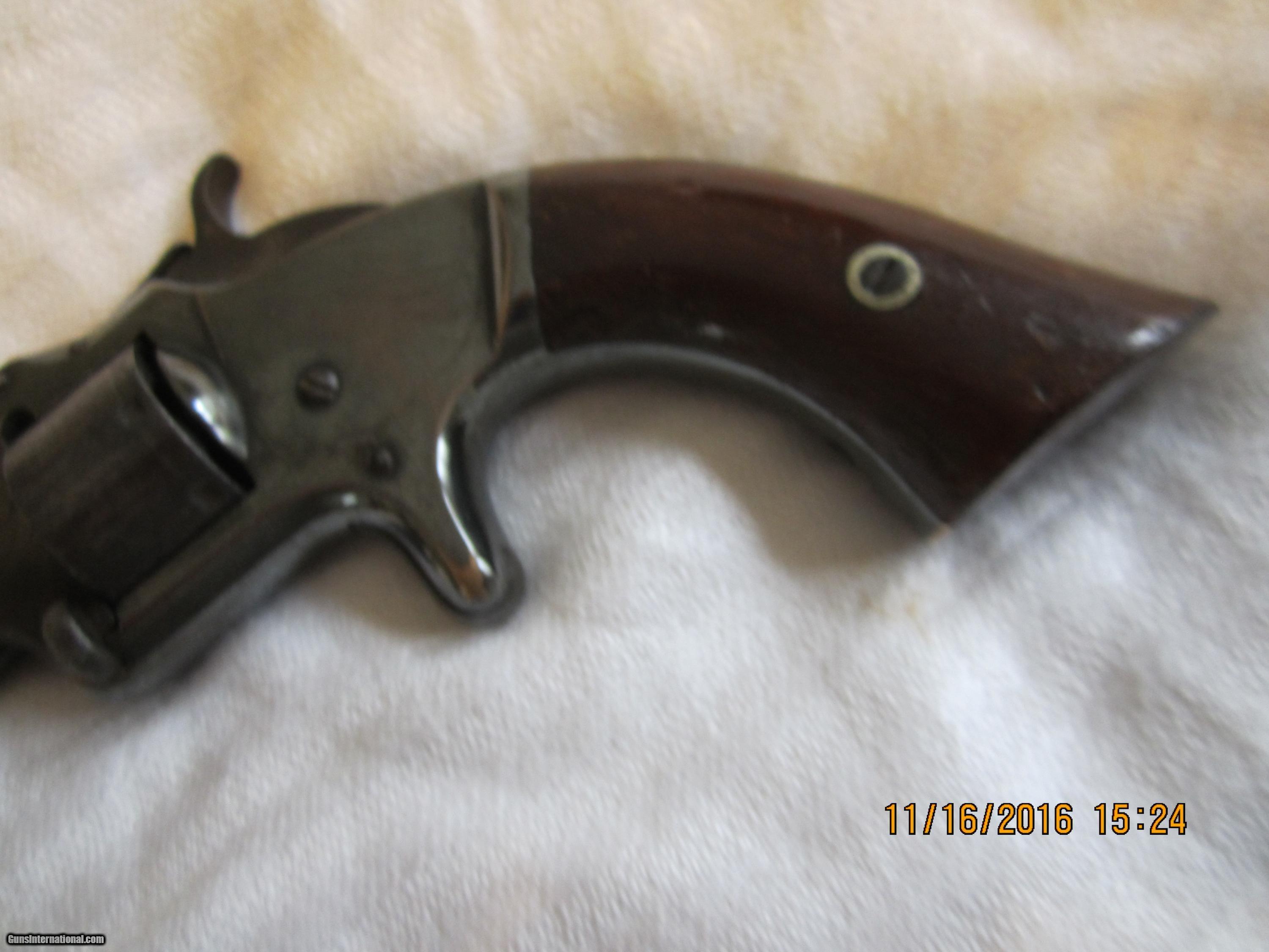 Description: The Model 1 was the first firearm manufactured by Smith & Wesson. This is a nice example. The caliber is .22 short and the octogon barrel is 3 & 3/16" long. The barrel tips up to allow the cylinder to be removed and loaded with 7 cartridges. The action is strong and the hinge is tight. Everything works as designed. 30 to 50% of the blueing remains. The grips are in good condition with only minor scratches. The serial # is 57227. The cylinder is markd: :Patented April 3, 1855, July 5, 1859, and Dec. 18, 1860. 117,000 of these were made between 1860 and 1868. ALSO SEE another Smith & Wesson at listing # 100430539. SOLD Antique: Yes Manufacturer: Smith & Wesson Model: 1st Model--2nd Issue Serial Number: 57227 Caliber Info: .22 short Bore: good-rifled Chambers: 7 cartridges Condition: Good Metal Condition: Good Wood Condition: Very Good Bore Condition: good Barrels: one Barrel Type: octogon Action: revolver Triggers: one Stock: Rosewood Finish: blued Sights: front Manufacture Date: 1860-1868 Engraving: no Item Location: California |