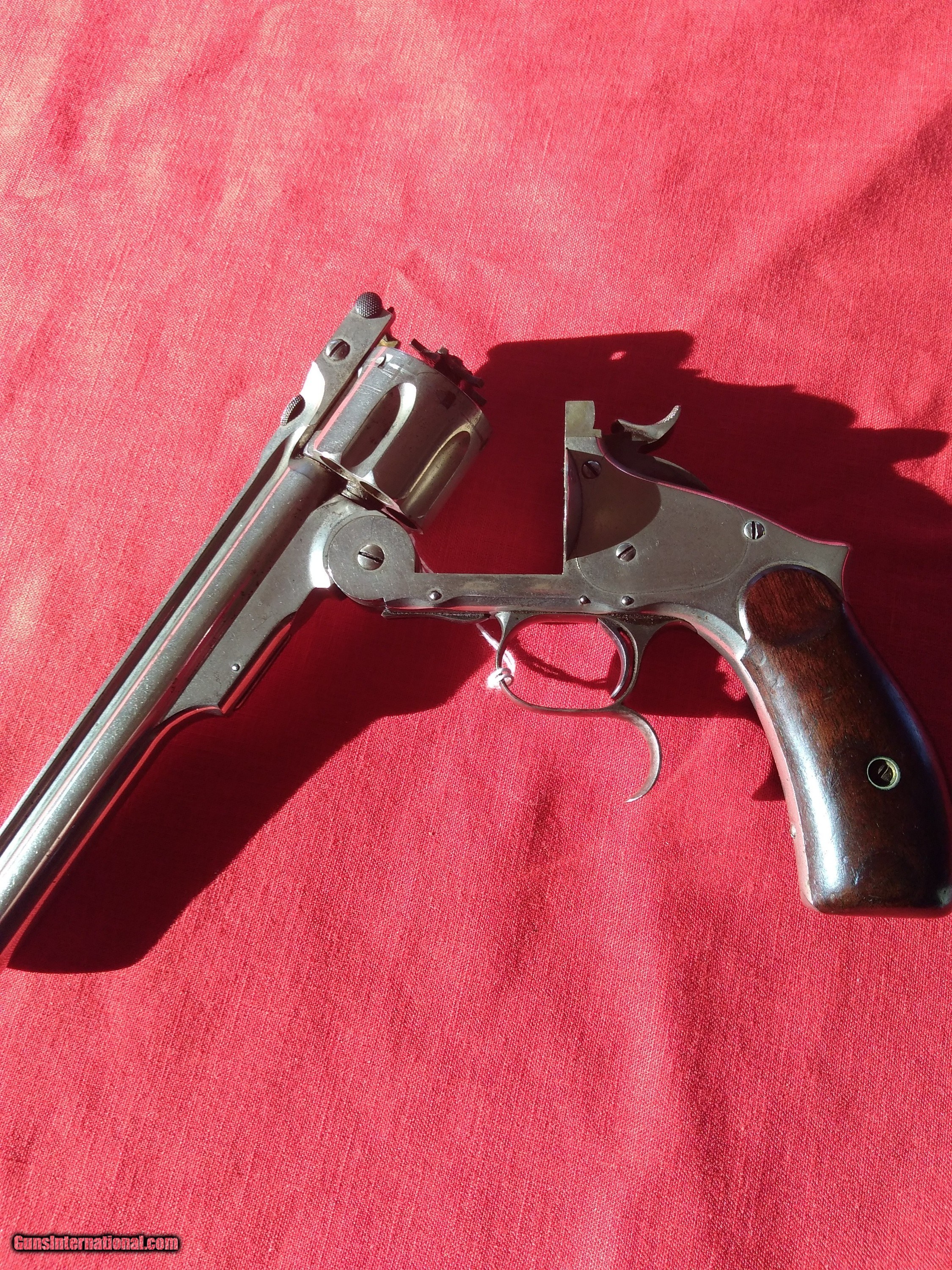 Description: Smith & Wesson Russian Serial #46715 44 Caliber 6 1/2" Barrel Nickel Bore Very Good Lanyard Swivel Missing 1874 Stamp on Butt S&W Star on Butt $2200.00 Shipped Now offering display case with our S&W Russian SALE PENDING SOLD |