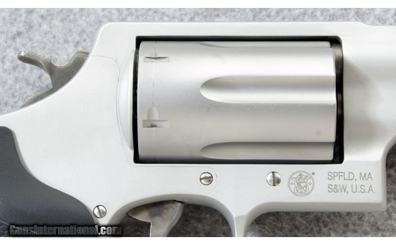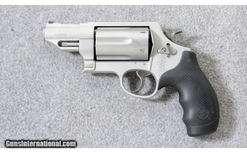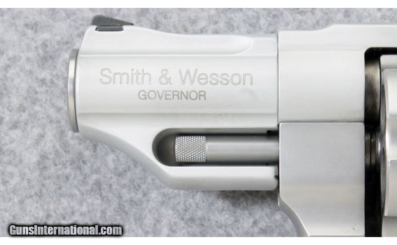 Description: The Smith & Wesson® Governor® Centerfire Revolver is a versatile, lightweight revolver, built for everyday carry and home defense. Featuring a 6-round, stainless steel cylinder and a 2.75" stainless steel barrel, this revolver boasts a scandium alloy frame. A black ramp front sight, and a fixed rear sight offers rapid, intuitive sight acquisition. A rubberized, overmolded, synthetic grip reduces felt recoil for improved control and comfort. Manufactured 2014. .45 Colt/.410 Bore SOLD Metal Condition: Excellent with a turn line on the cylinder Bore Condition: Excellent Barrels: 2 3/4 inch barrel Triggers: Double action Weight: 31 Oz. Sights: Square notch rear sight with blade front Item Location: Lehi, UT |