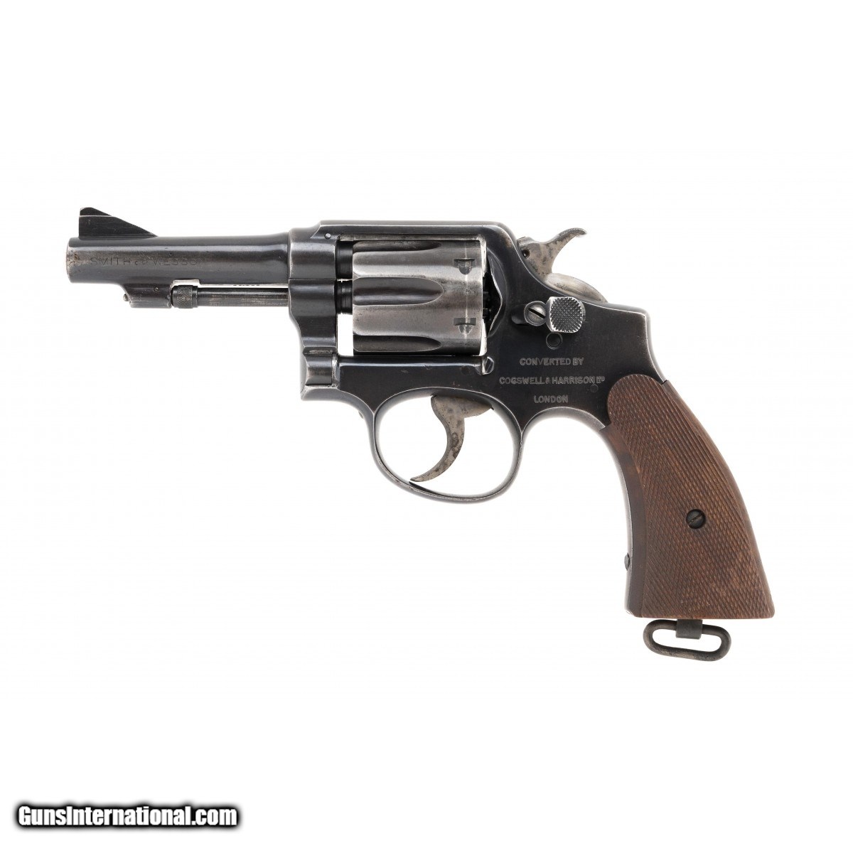 Description: " Pre-war 4"" blue M&P revolver made for England in .38 S&W caliber. Was converted and ""updated"" after the war by Cogswell & Harrison to shoot .38 Special. Very good condition overall. SOLD |