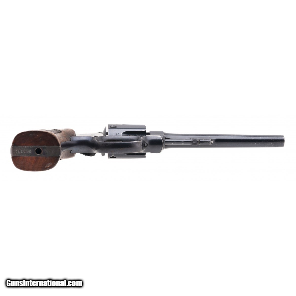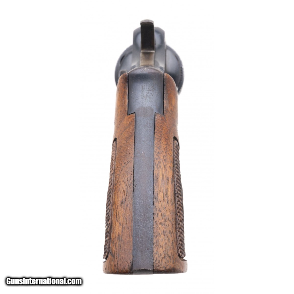 Description: " Serial No. 738815, circa 1906-1908, .38 S&W, 6"" round British proofed marked barrel. Serial numbers are matching, 95% blue remains with light scratches visible, mostly right side barrel. Bore is bright with scattered areas of light frosting visible in the grooves, rifling remains strong. Brown checkered grips have minor wear noted at the bottom, lanyard loop has been removed. Action indexes correctly with a tight lock up. CONSIGNMENT SOLD Curio/Relic: Yes |