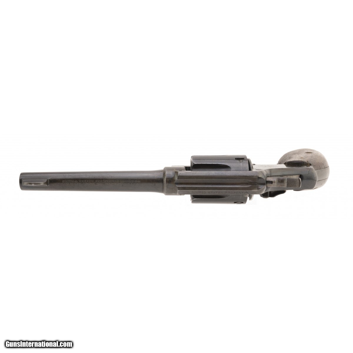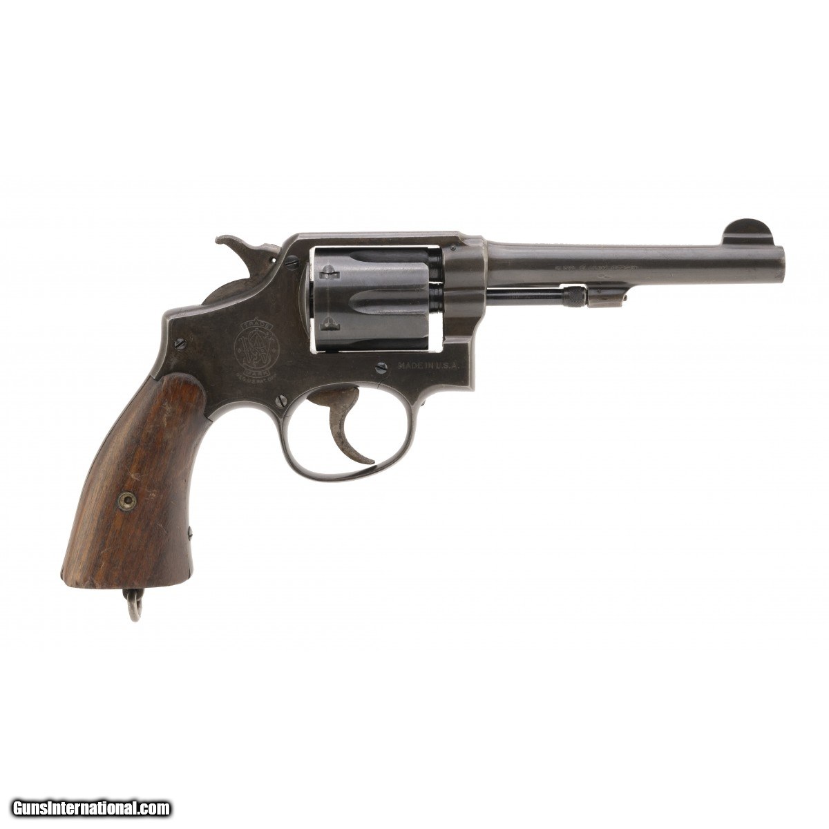 Smith & Wesson M&P .38 S&W caliber. Top strap marked “United states Property". According to their very fine book “Standard catalog of Smith & Wesson 4th edition" Supica and Nahas the .38/200 British Service Revolver (Model K 200) Square butt is a K frame with 5screws., Identical to the .38 Hand Ejector 1905, 4th model. This revolver has a 6 inch Barrel. ‘‘United States property’’ and is military inspected “WB" on the bottom of the butt. They go on to say that early Lend Lease guns were marked as mentioned with the United States Property on the top strap. This revolver is not marked with a V or SV and is not a Victory model! This revolver has no British Proof marks. The butt also has an ordnance bomb next to the WB inspectors markings. The grips are not correct and should be S&W medallion and checkered. We do not have the correct grips but they should be easy to find!. Neat revolver that is correct and an early Lend-lease variant . Bore is perfect and action indexes and locks up perfectly. The hammer has very good case colors. Barrel address and caliber markings are sharp and clear. The revolver has approximately 80% blue with the rest being some patina from fading. This is a .38 S&W cartridge, not 38 Special! See page 165 of the above mentioned book for expanded discussion of WWII Lend lease revolvers.