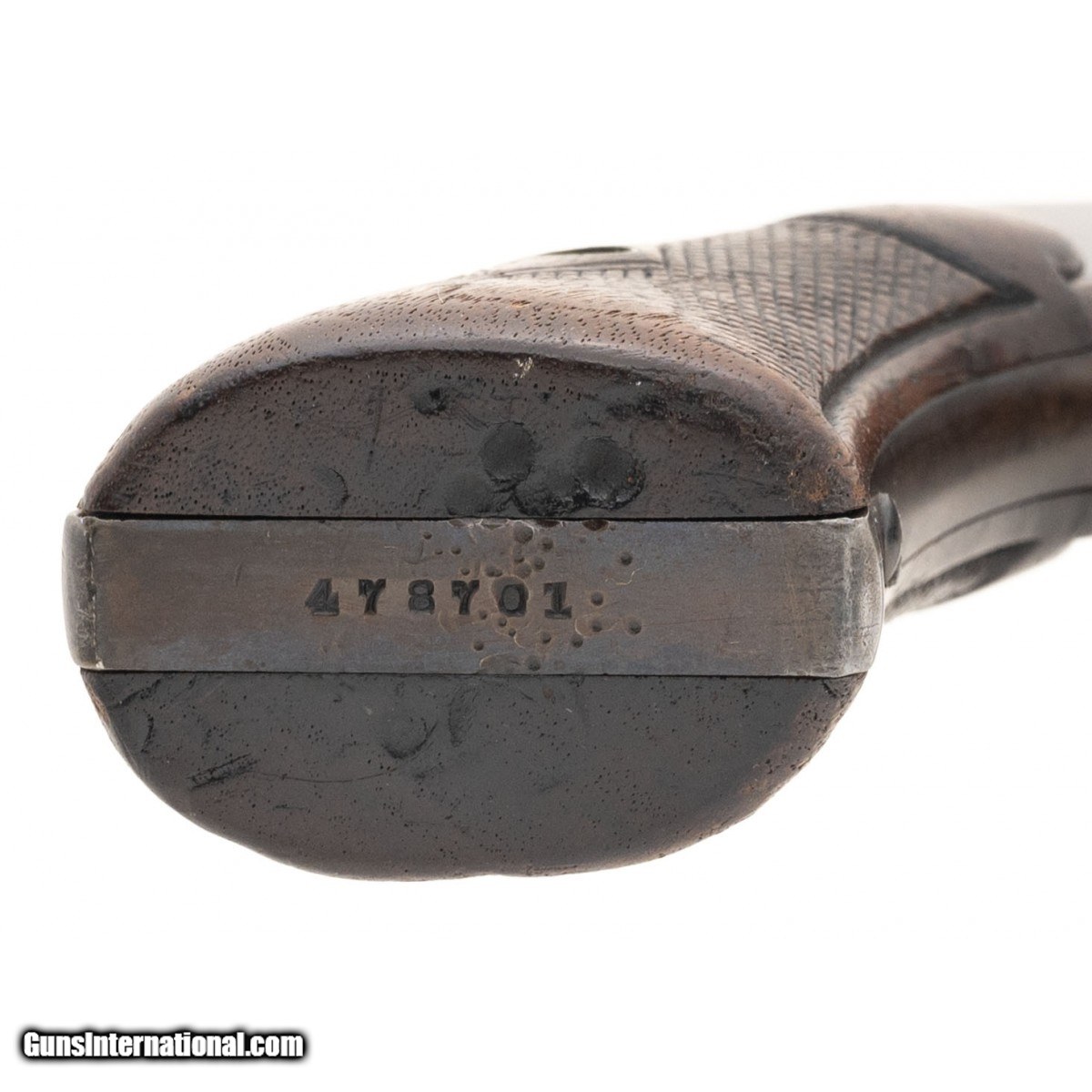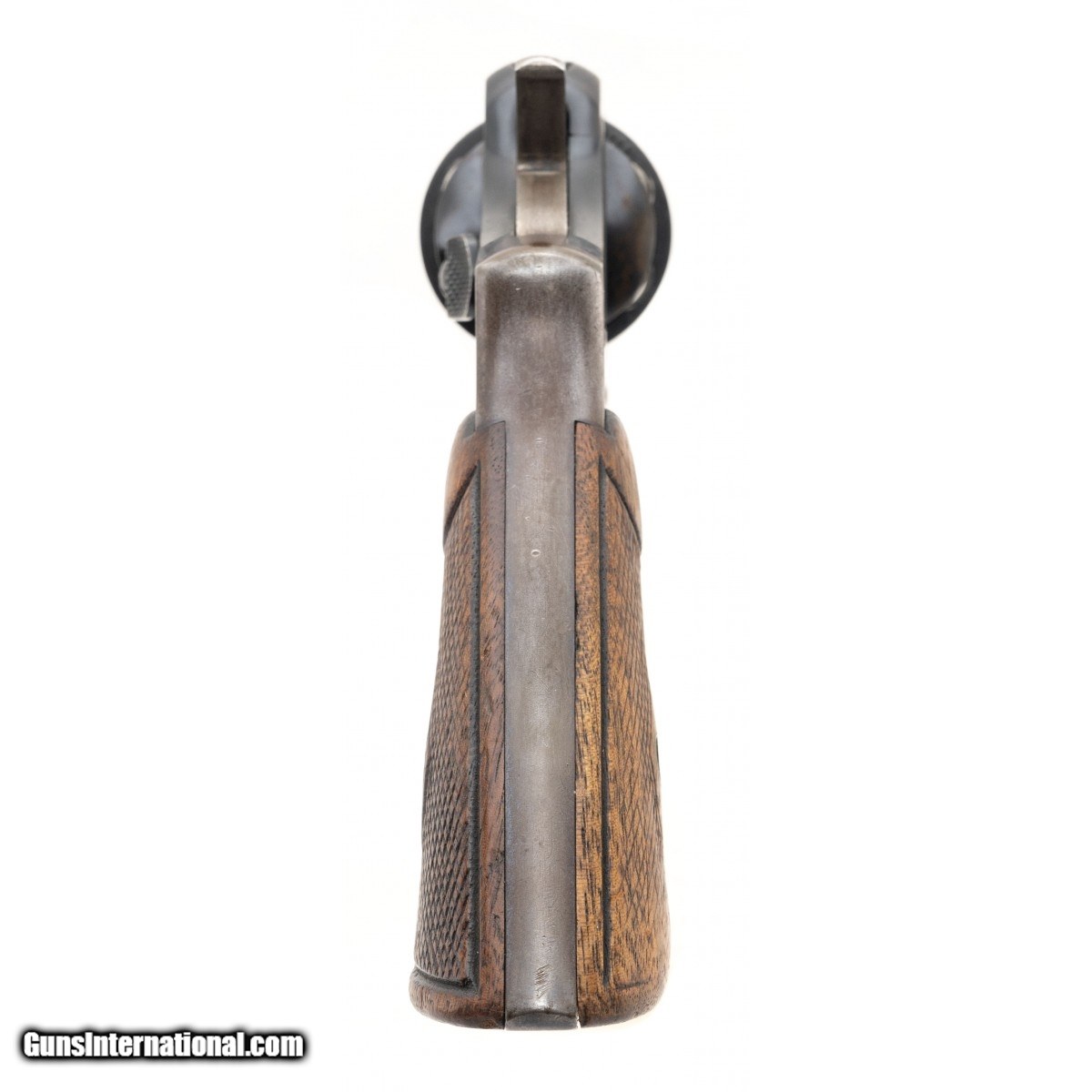 SN: 478701. 1920's production 38 Special with a 6"" barrel. Bore is very good. Blued revolver with about 80% original blue, with most of the wear on the grip frame. The hammer and trigger have excellent case colors. The grips are worn smooth on the right side, and the butt of the grip has some marks and wear. The rest of the gun is in very good condition.