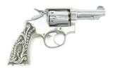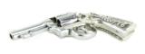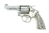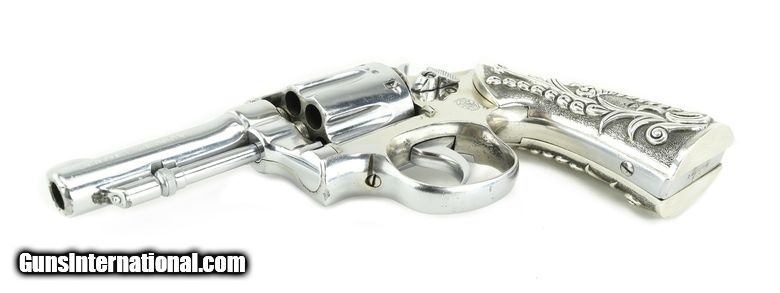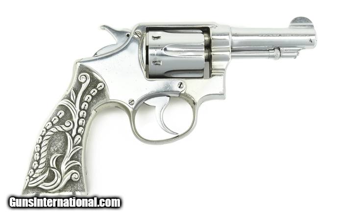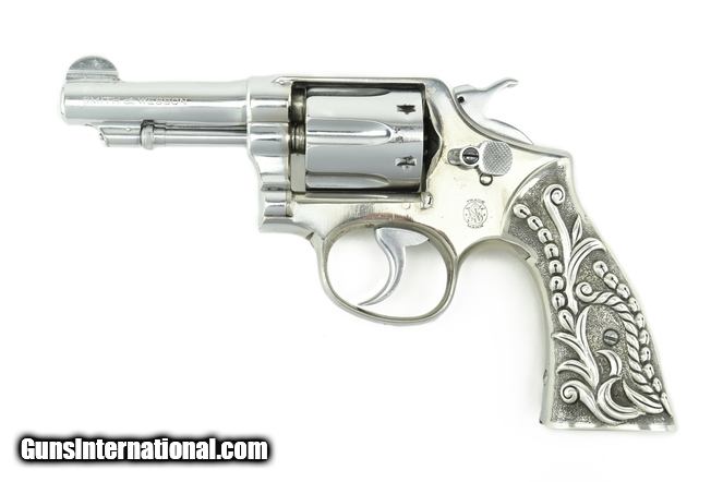 Description: Smith & Wesson M&P .38 Special caliber revolver. Pre-War revolver customized with fancy silver grips and chrome finish. The barrel has been cut to 3 ¼”, making it a neat carry gun.