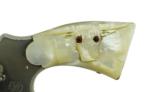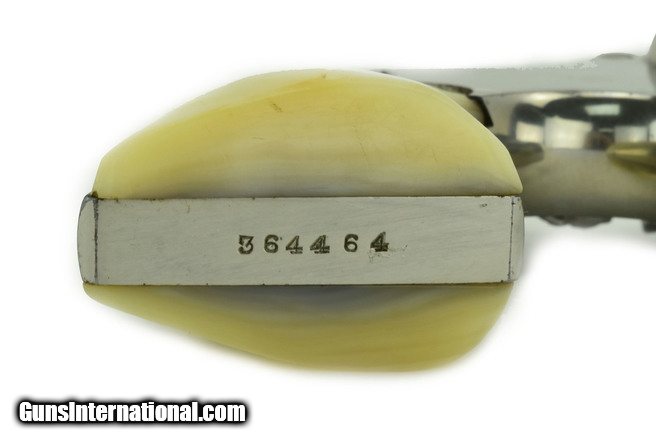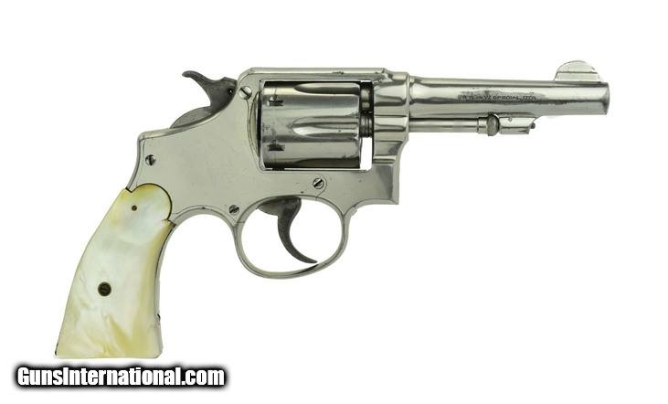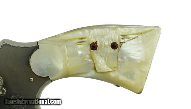 Description: Smith & Wesson M&P .38 Special caliber revolver. Pre-war 4” model with nickel finish and carved steer head pearl grips. Shows some light wear, has about 95% finish. Bore is very good. A great looking vintage wheel gun.