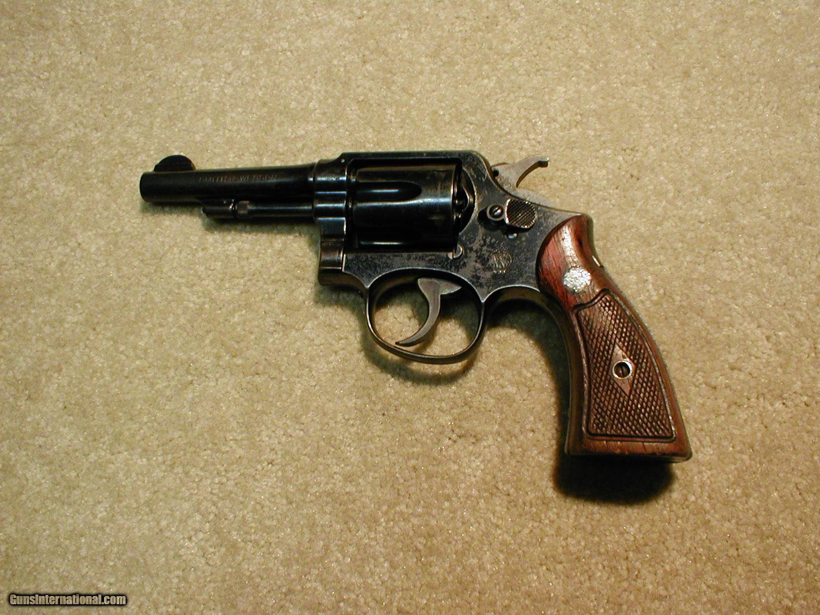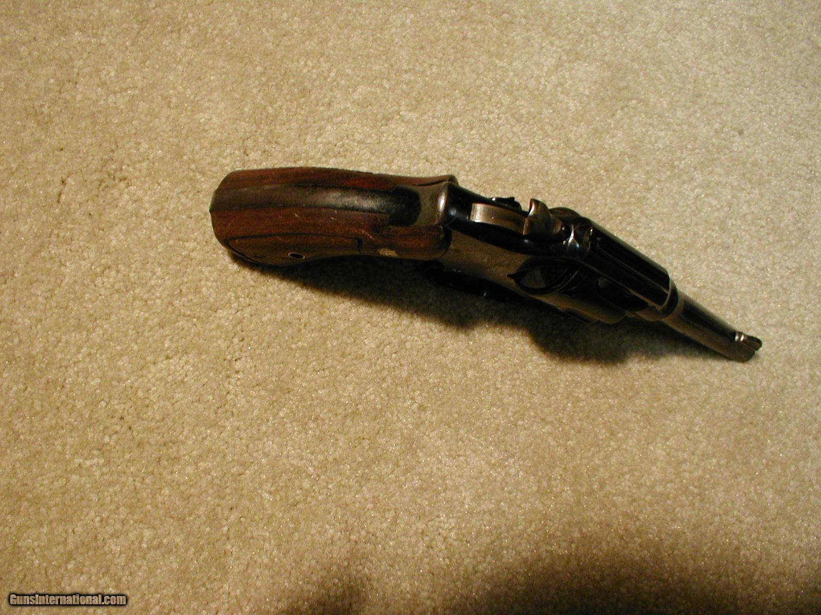 Description: ONE OF THE VERY LAST OF THE .32-20 HAND EJECTOR MODELS MADE! THIS IS A MODEL 1905 .32-20 H-E 4TH CHANGE #144296 WITH THE LAST ONE BEING #144694 IN 1940! This is a 4" example which is a little unusual as most in this caliber tend to be 6 or 6 1/2", last patent date is 1914, obviously a carried and used revolver as the blue is showing some age "flaking" to plum on the frame sides, but generally find deep blue overall, matching numbers except grips which are fairly heavily worn, good case color on hammer and trigger, exc. bore, exc action on double action, single action tends to stick a little- probably just needs a good internal cleaning and overhaul that any gunsmith can do, all these .32-20 S&Ws are getting hard to find SOLD Curio/Relic: Yes Manufacturer: Smith & Wesson Model: 1905 .32-20 4TH CHANGE Serial Number: 144296 Caliber Info: .32-20 Barrels: 4 Finish: BLUE |