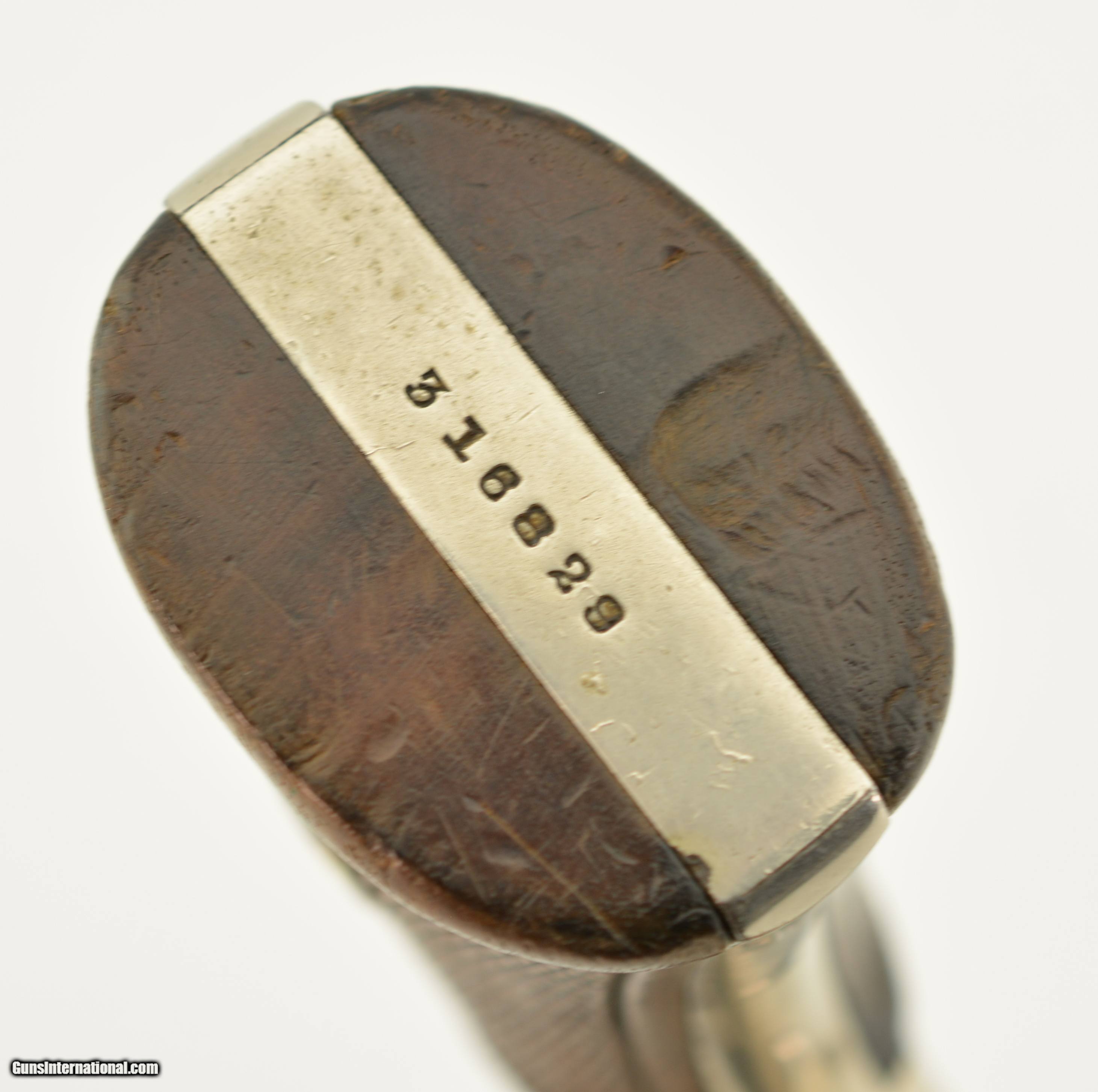 Description: Serial #316829, .38 Special, 4" barrel with a very good bore that has freckling within the grooves and at the breech. This is a nice looking revolver that has matching numbers on the frame, barrel, cylinder, yoke, and extractor. The metal retains 90-92% of the original nickel finish with some flaking at the muzzle, as well as spots of plum-brown freckling scattered about the frame and cylinder. There is a robust turn-ring on the cylinder, and some further spots of dark freckling along the gripstraps. The trigger and hammer retain about 70-75% of the original color case-hardening, with the balance turned to a lightly freckled pewter gray patina. The checkered, diamond-center grips are numbered to the gun on the interior, and are in good-very good condition with numerous small handling marks, and moderate flattening of the points. This is a very nice S&W .38 Hand Ejector, and rates very good overall. FFL or C&R SOLD Curio/Relic: Yes Manufacturer: S&W Model: M&P Serial Number: 316829 Caliber Info: .38 Spl Gauge Info: .38 Spl |
