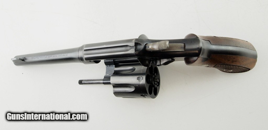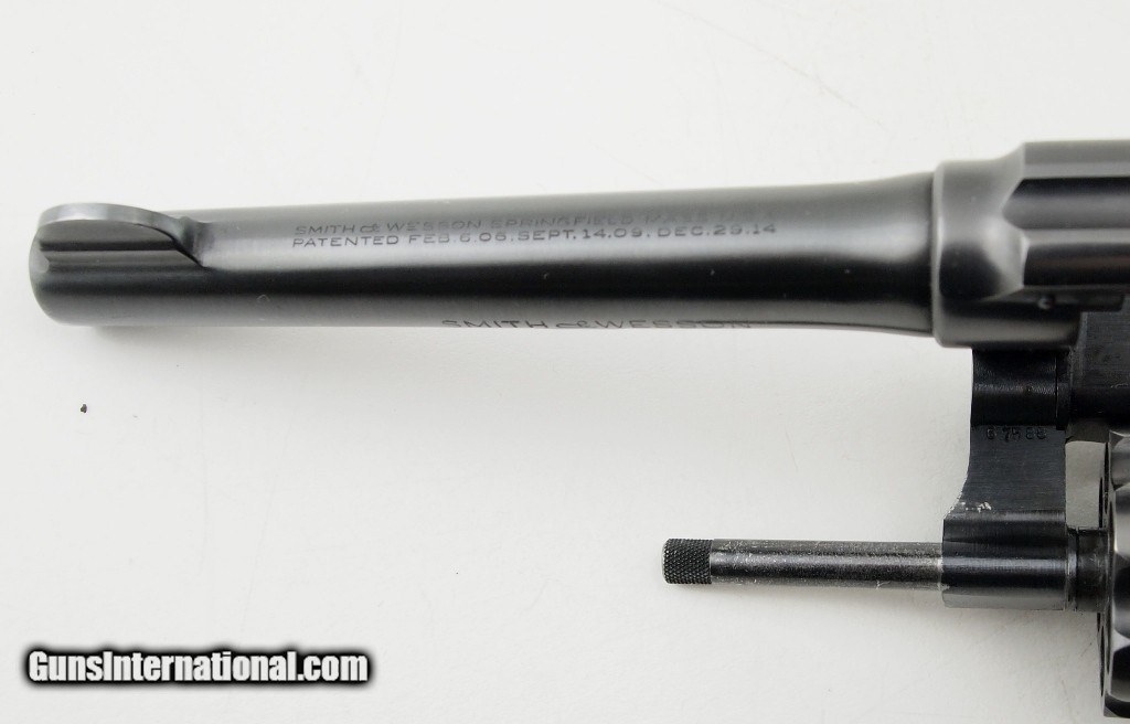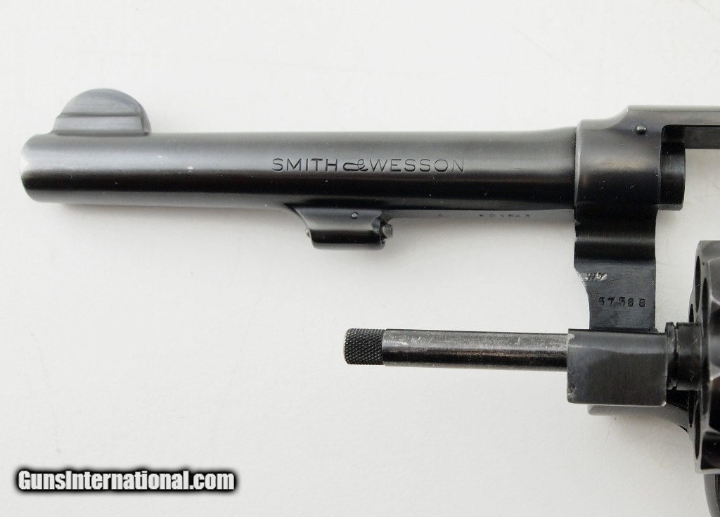 Description: S&W M&P Post War Pre M-10 .38 SPL, 5" bbl, bright shiny bore, good rifling, iron sights, blued finish, color case hardened serrated trigger - knurled hammer, and very nice diamond checkered walnut stocks with inset S&W medallions. Add 3% for Credit Card Shipping $25.00 SOLD |