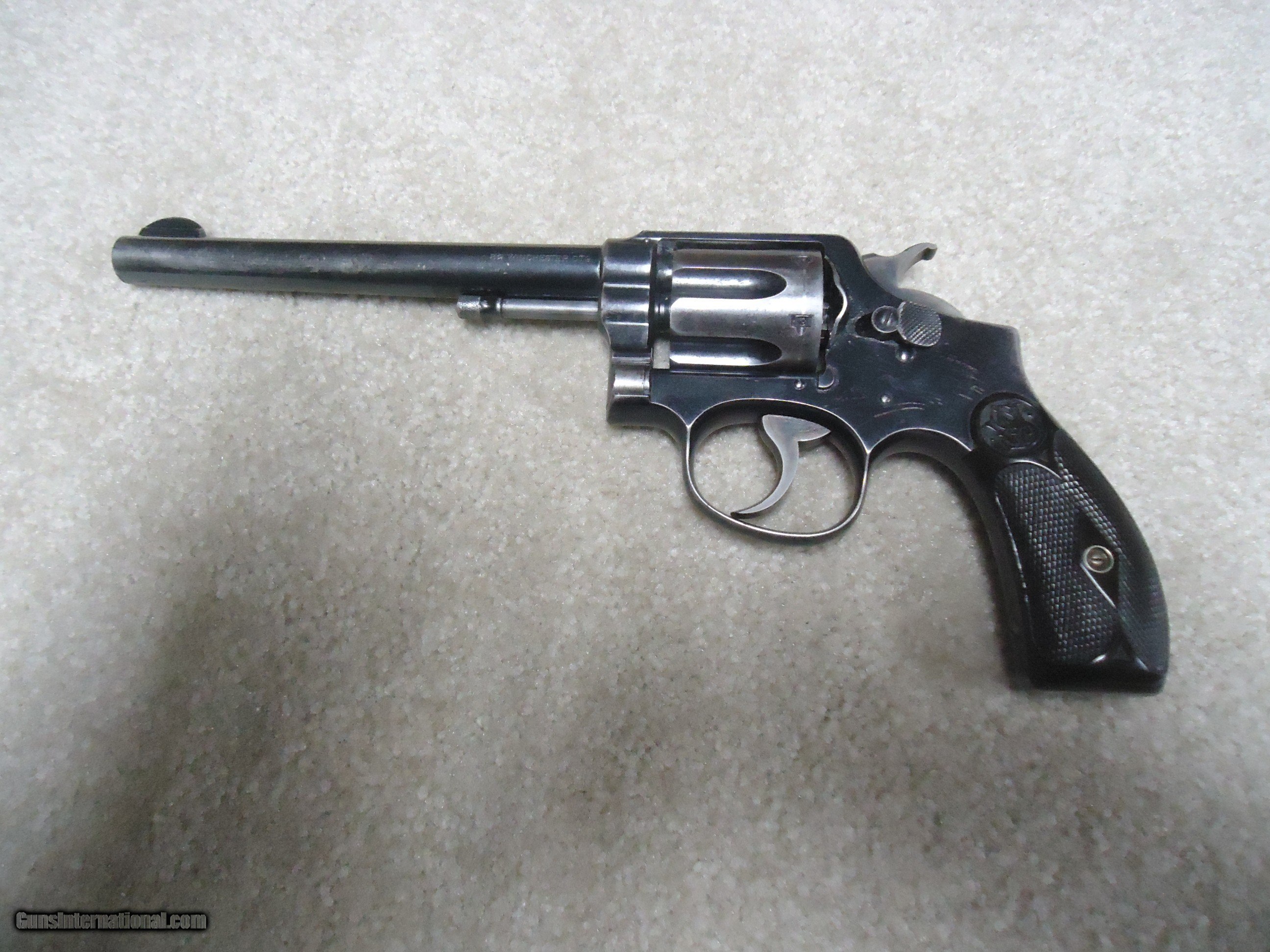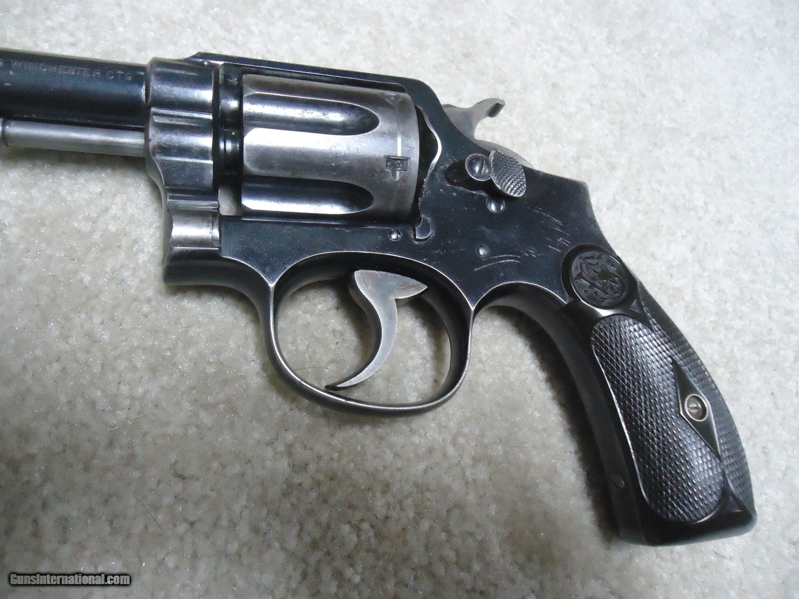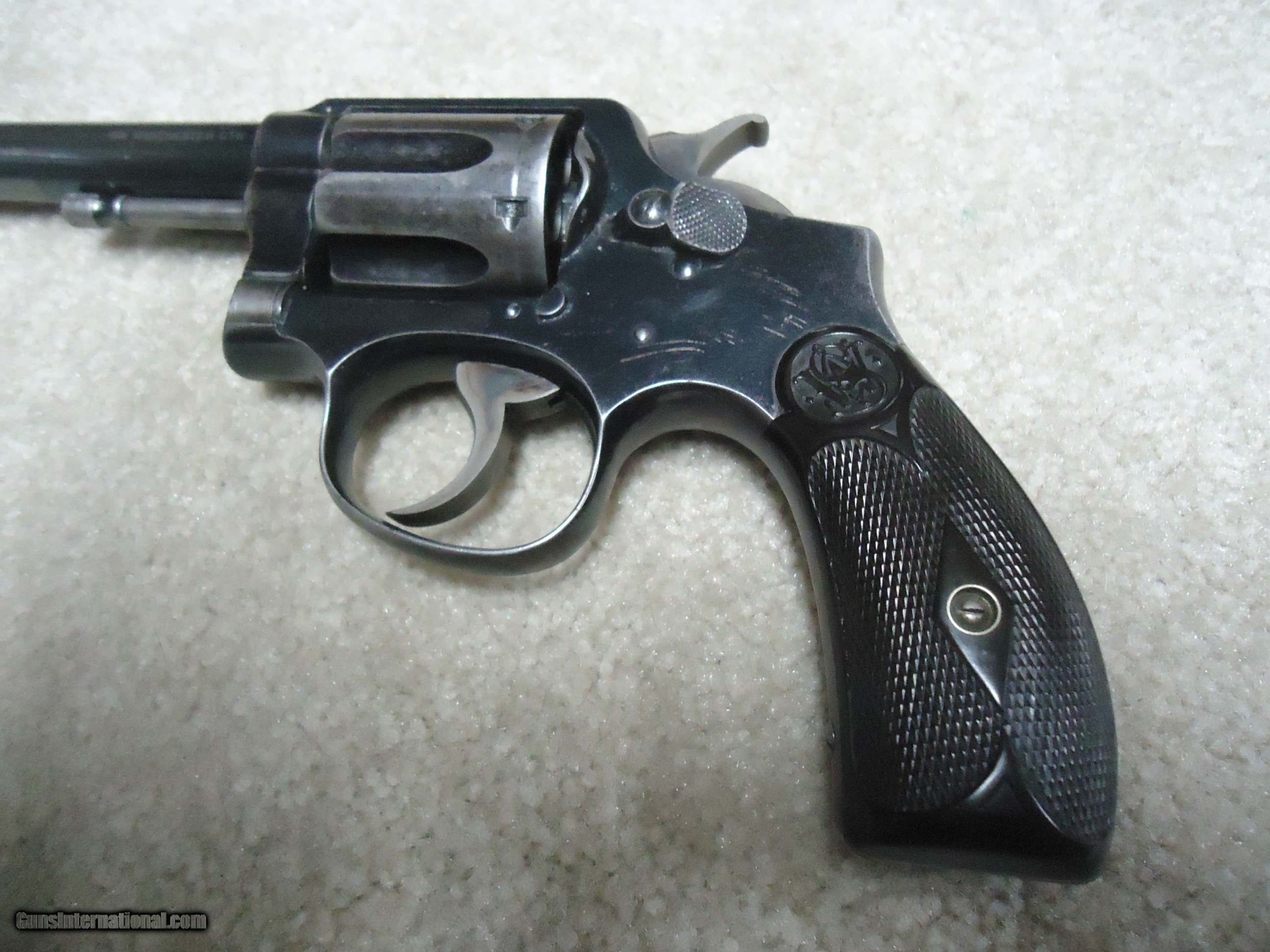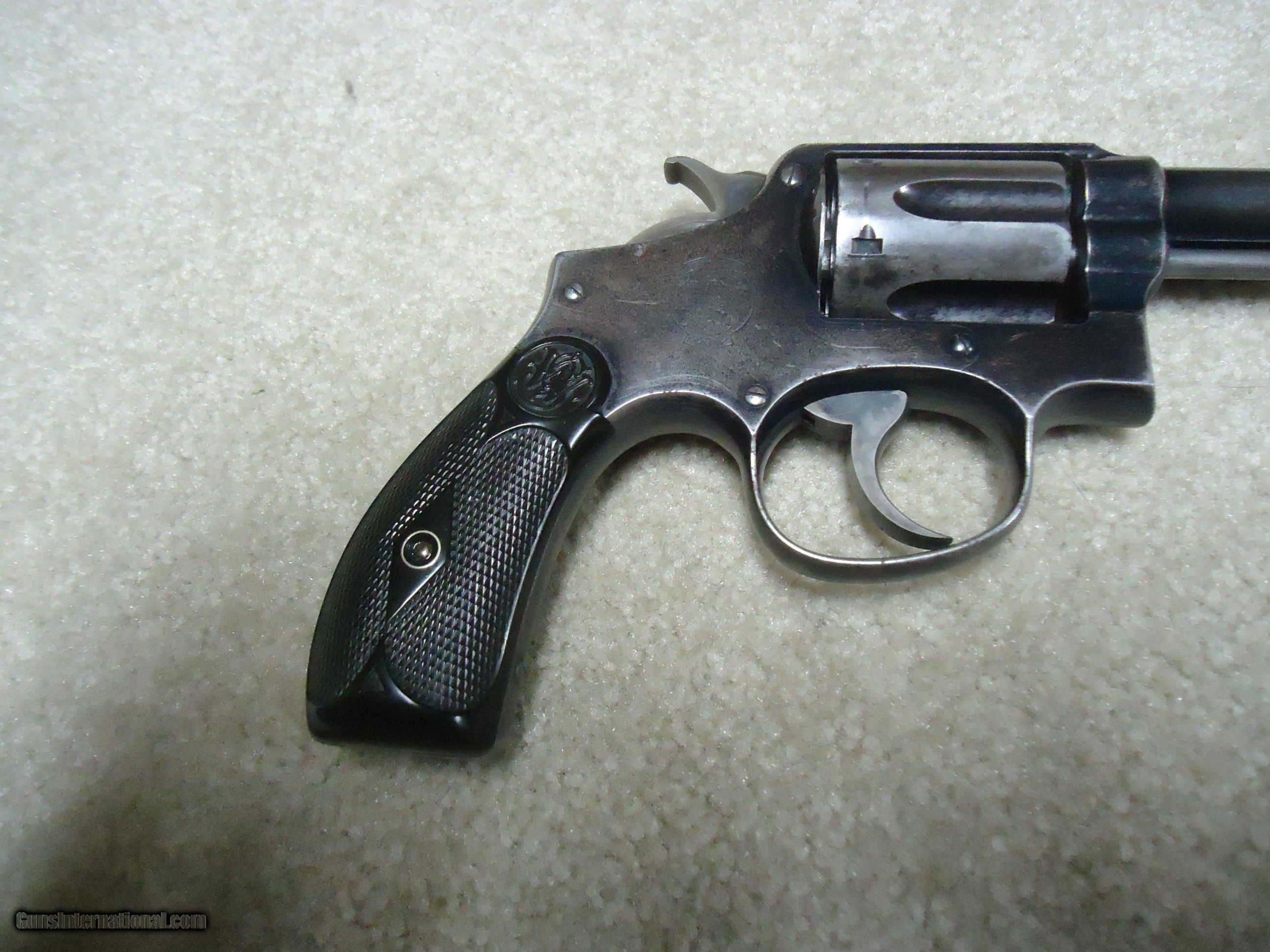 Description: SELDOM SEEN, EARLY MODEL 1899 .32-20 FIRST MODEL HAND EJECTOR, #11XX, MADE 1899-1902. This was the first of the famed Military & Police (M&P) line that continues to this day. Easily identified by the fully exposed and non-locking stud to the barrel ejector rod, the First Model was made in a quantity of only 5311 at which time the next model replaced it that did have the ejector rod connected to the barrel as on all models to the present time. The First Model was offered in .32-20 and .38 Special only. The .32-20 was mainly for outdoorsmen/frontiersmen who paired this revolver with an identically chambered rifle or carbine of the same caliber. As such, most of these early .32-20s saw some pretty heavy usage in the outdoors. When encountered, they often display hard use and often abuse. This example with 6 1/2" barrel and blue finish has matching numbers on the butt, cylinder, barrel and inside the right grip at the top portion. This model was only made in round butt configuration and the early hard rubber grips have a light and small patent merking at the lower edge on the left panel- with any wear this marking disappears. This example retains the grip patent marking. Overall, the blue is fine with thinning a little on the sides of the barrel, grip straps and on the outer portion of the cylinder- typical handling and holster wear. Exc. screws and markings including the top barrel address and correct patent date ending in '98 along with "32 WINCHESTER CTG" on the left side of the barrel. Nice case color on the hammer and trigger sides. Front sight has NOT been filed or altered. The action is excellent with very solid cylinder lock up. Bore is excellent and bright. One of the better ones I've seen in a long while. A difficult to find 120+ year old S&W and one of the most significant and historical introductory models. SOLD Curio/Relic: Yes Handgun Caliber: .32-20 Winchester (.32 WCF, .32-20 Marlin, .32 Colt Lightning ) Manufacturer: SMITH & WESSON Model: FIRST MOD. 32-20 H-E Serial Number: 11XX Barrel Length: 6 Condition: FINE Bore Condition: EXCELLENT |