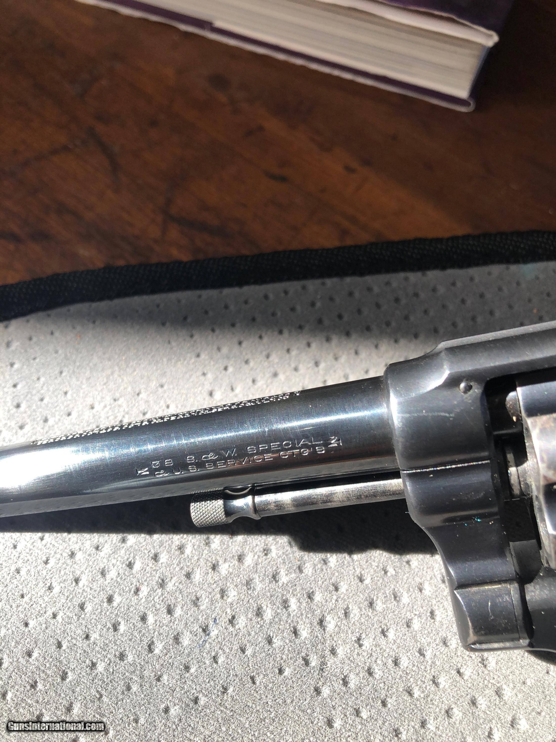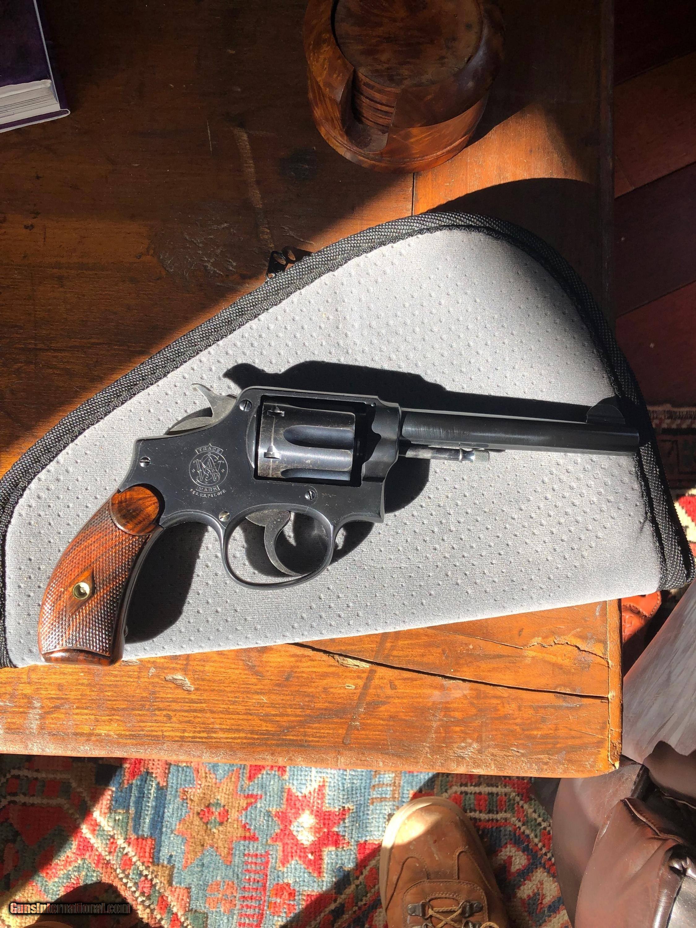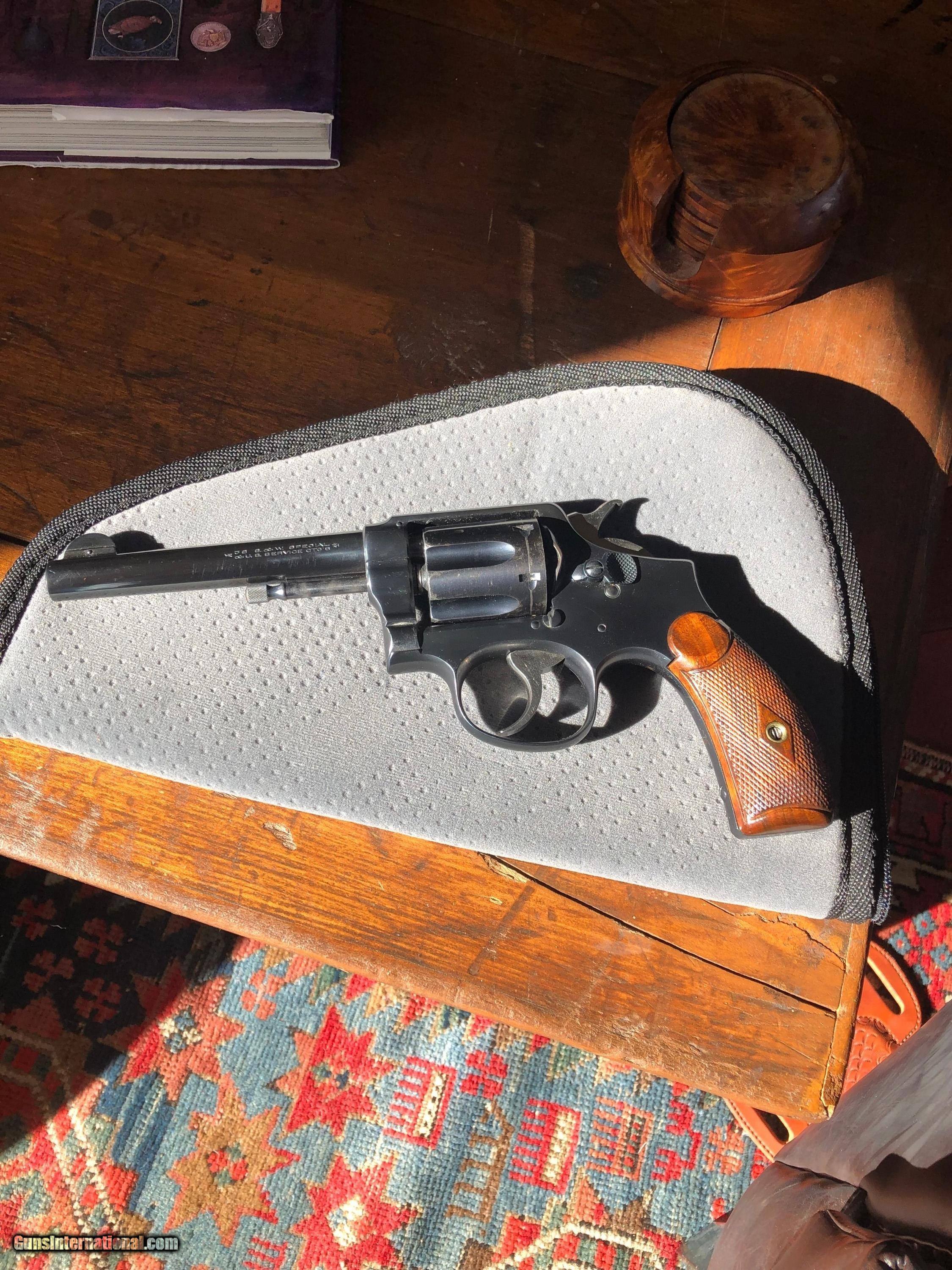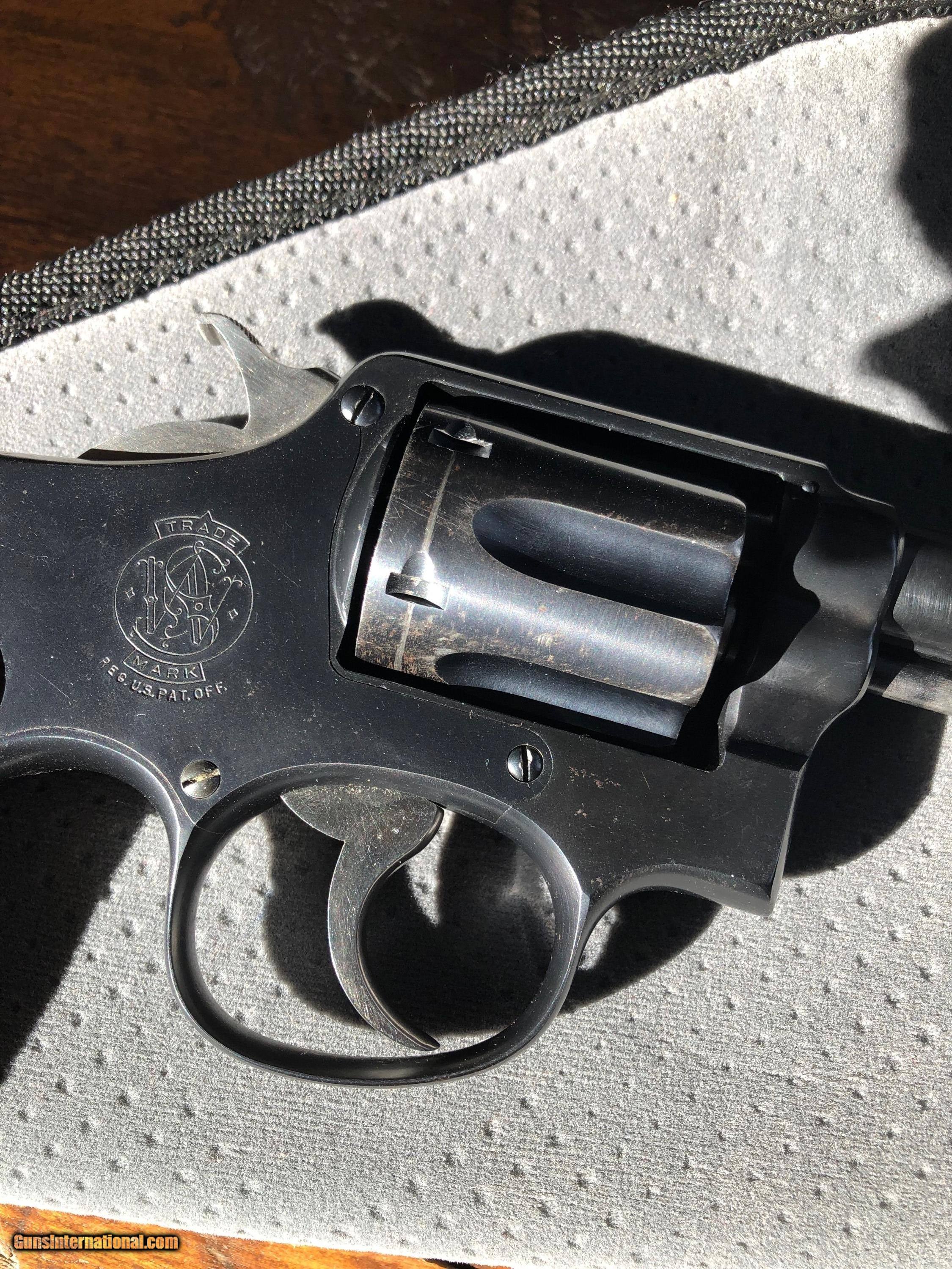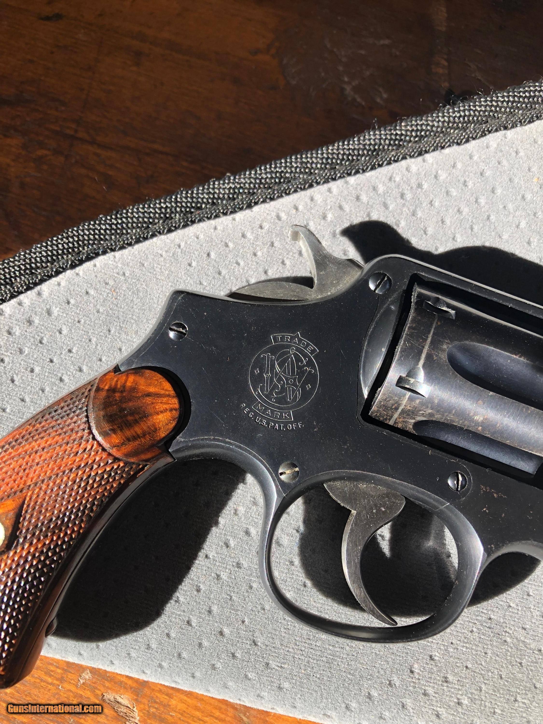 Description: Smith 1899 .38 Special fully restored at Smith factory in December 1947 ("12.47" and diamond B under grip; star on butt). 4"pinned barrel. Hammer and trigger in white. Only flaws in metal finish are wear on cylinder (see photos). Original pattern no medallion walnut grips, but these are not priginal. They're in new condition. All marks are sharp. ".38 Smith & Wesson Special and U. S. Cartridges" on left of barrel. Dates on top of barrel all sharp and clear. Puzzling is that last patent date is in 1903, while production of this revolver reportedly ended in 1902. It can't be a replacement barrel, though, because the 1902's that came after all had a lug ahead of the ejector rod, which this 1899 does not. Supica (p.137) describes this model as a "pre-5 screw four screw", which it is. It is Smith's first swing-out cylinder in .38 Special. Purchaser pays $50 shipping. SOLD Curio/Relic: Yes |