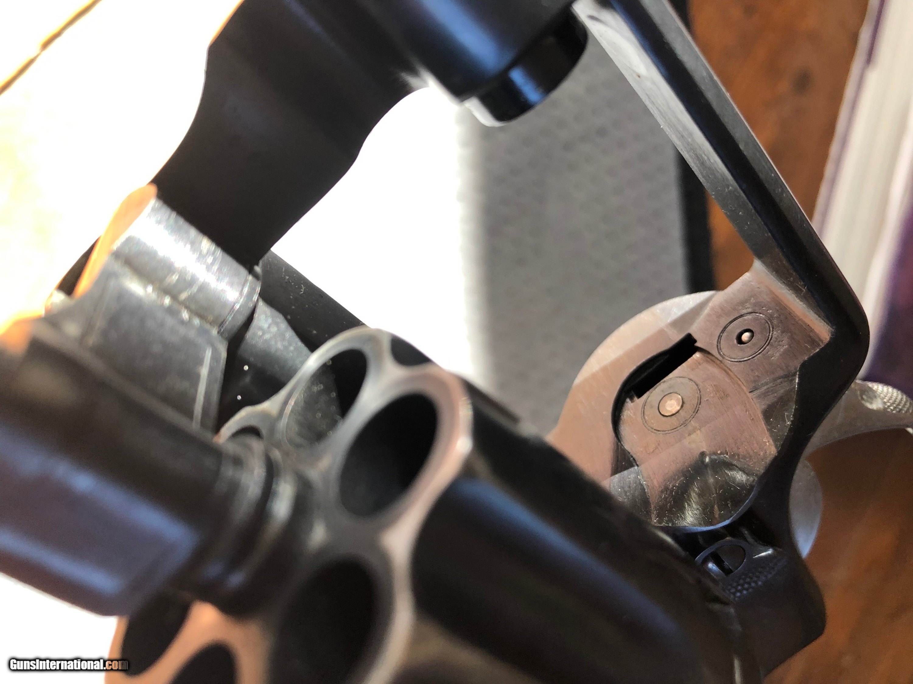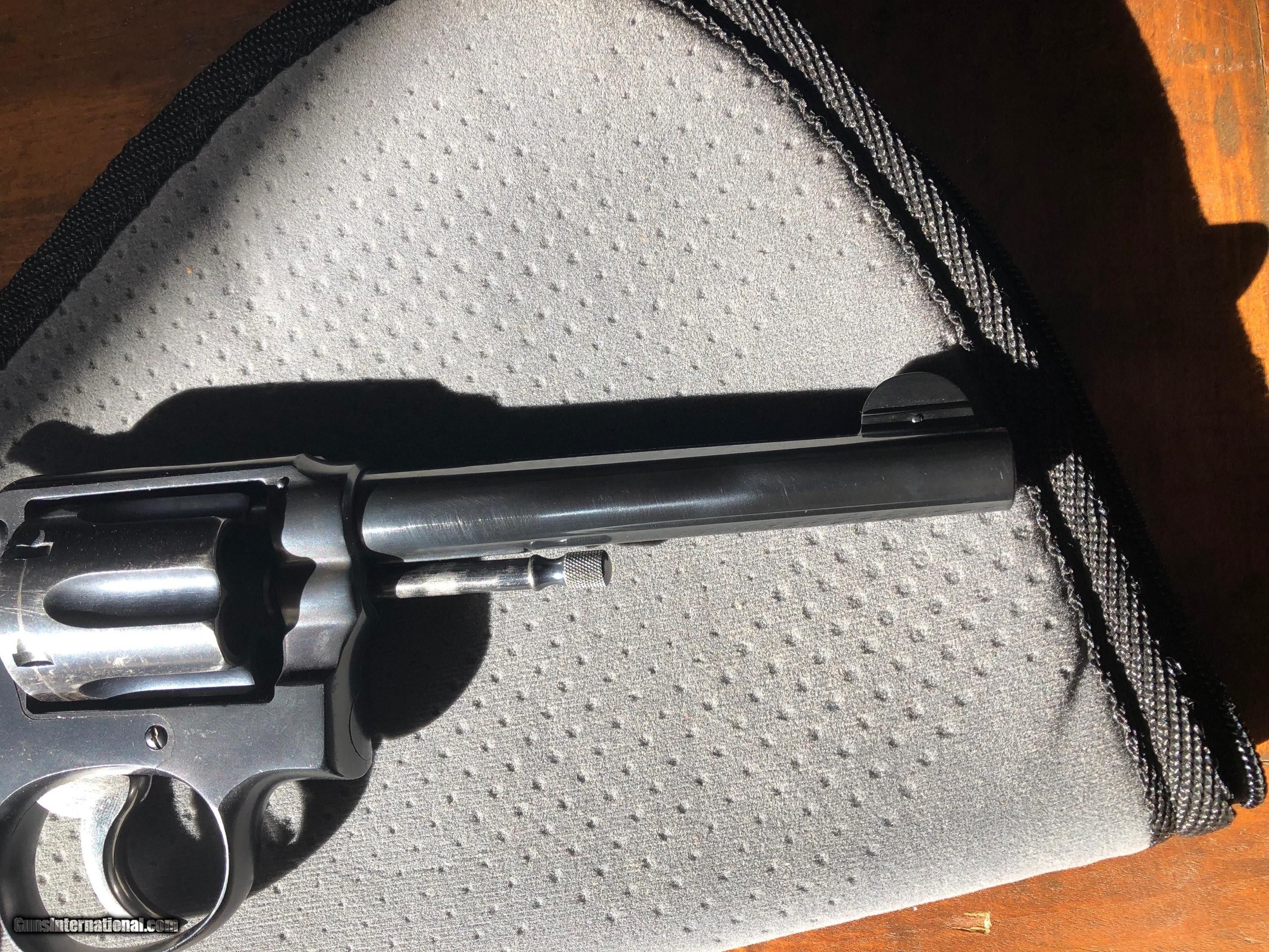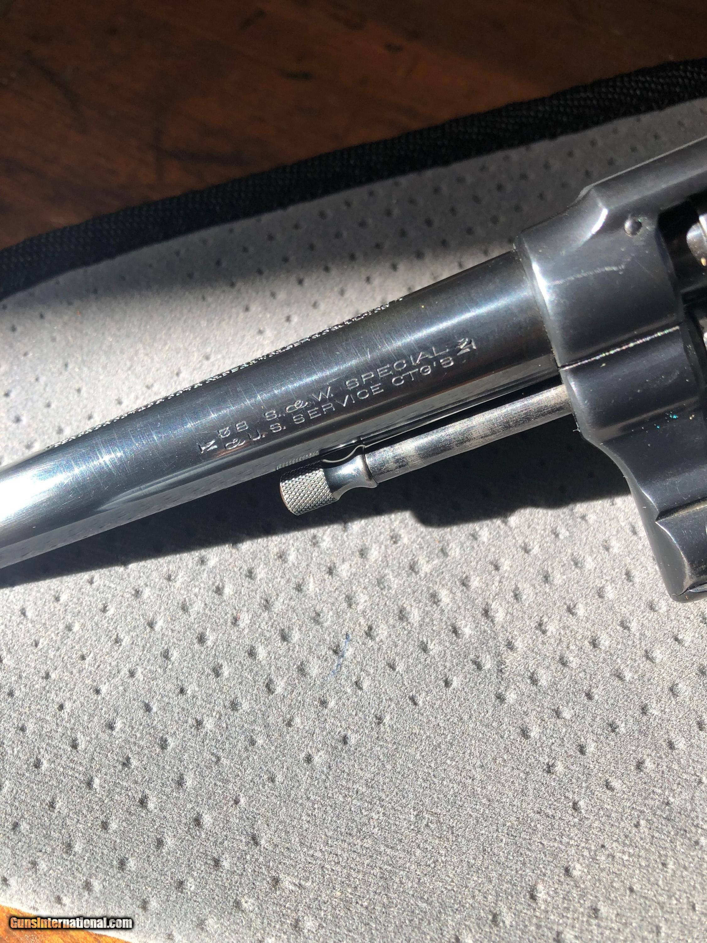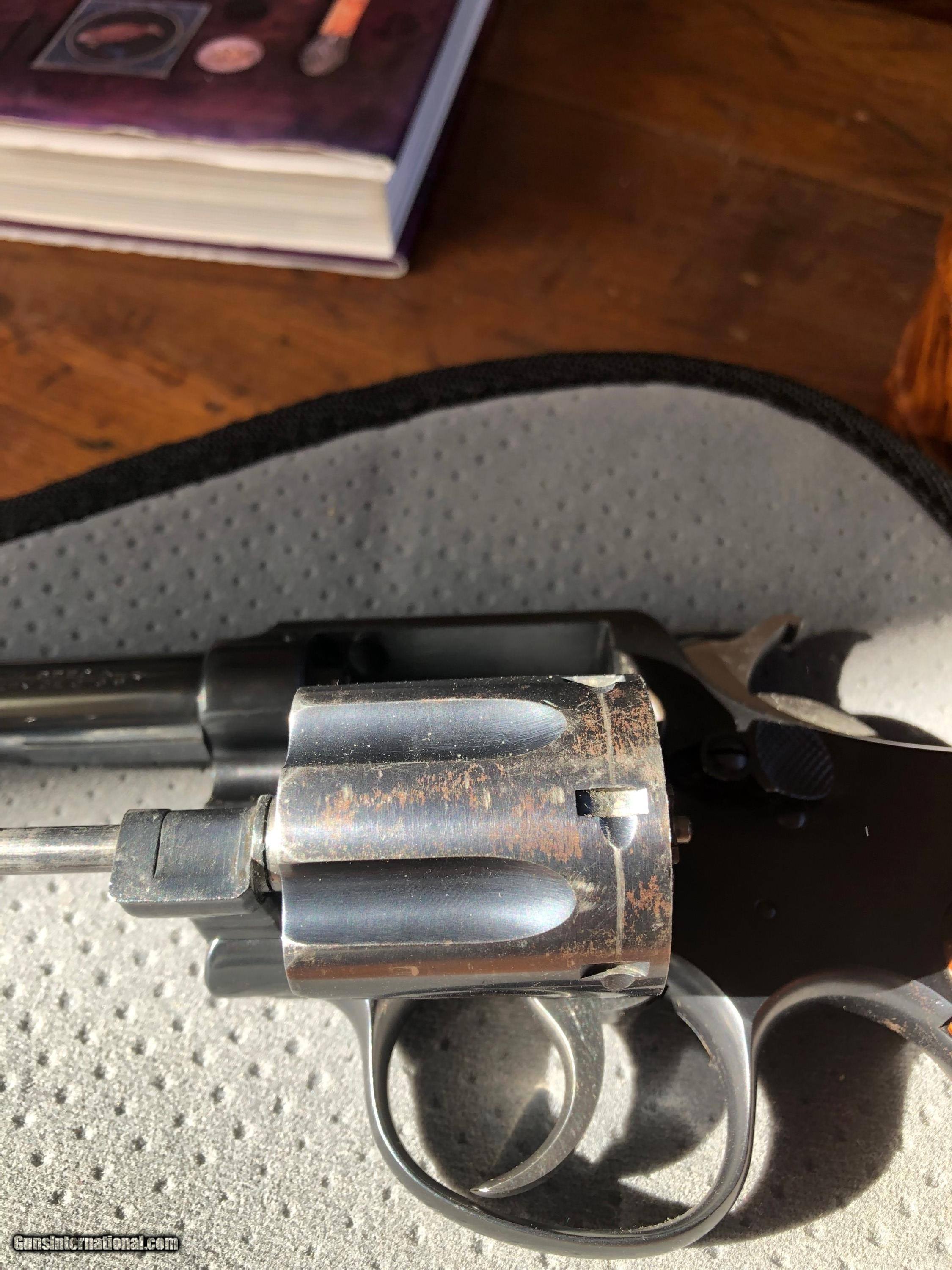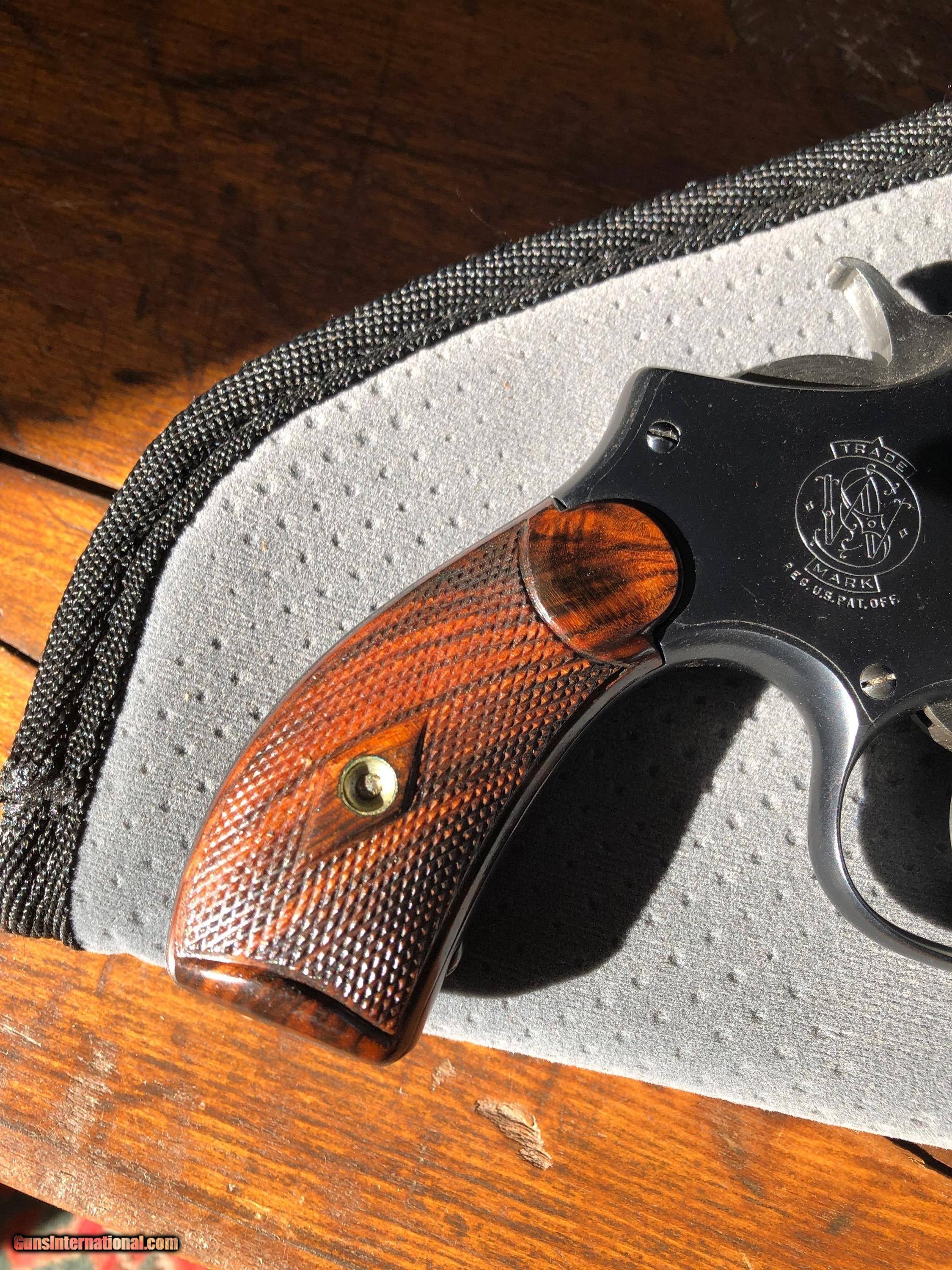 Description: Smith 1899 .38 Special fully restored at Smith factory in December 1947 ("12.47" and diamond B under grip; star on butt). 4"pinned barrel. Hammer and trigger in white. Only flaws in metal finish are wear on cylinder (see photos). Original pattern no medallion walnut grips, but these are not priginal. They're in new condition. All marks are sharp. ".38 Smith & Wesson Special and U. S. Cartridges" on left of barrel. Dates on top of barrel all sharp and clear. Puzzling is that last patent date is in 1903, while production of this revolver reportedly ended in 1902. It can't be a replacement barrel, though, because the 1902's that came after all had a lug ahead of the ejector rod, which this 1899 does not. Supica (p.137) describes this model as a "pre-5 screw four screw", which it is. It is Smith's first swing-out cylinder in .38 Special. Purchaser pays $50 shipping. SOLD Curio/Relic: Yes |