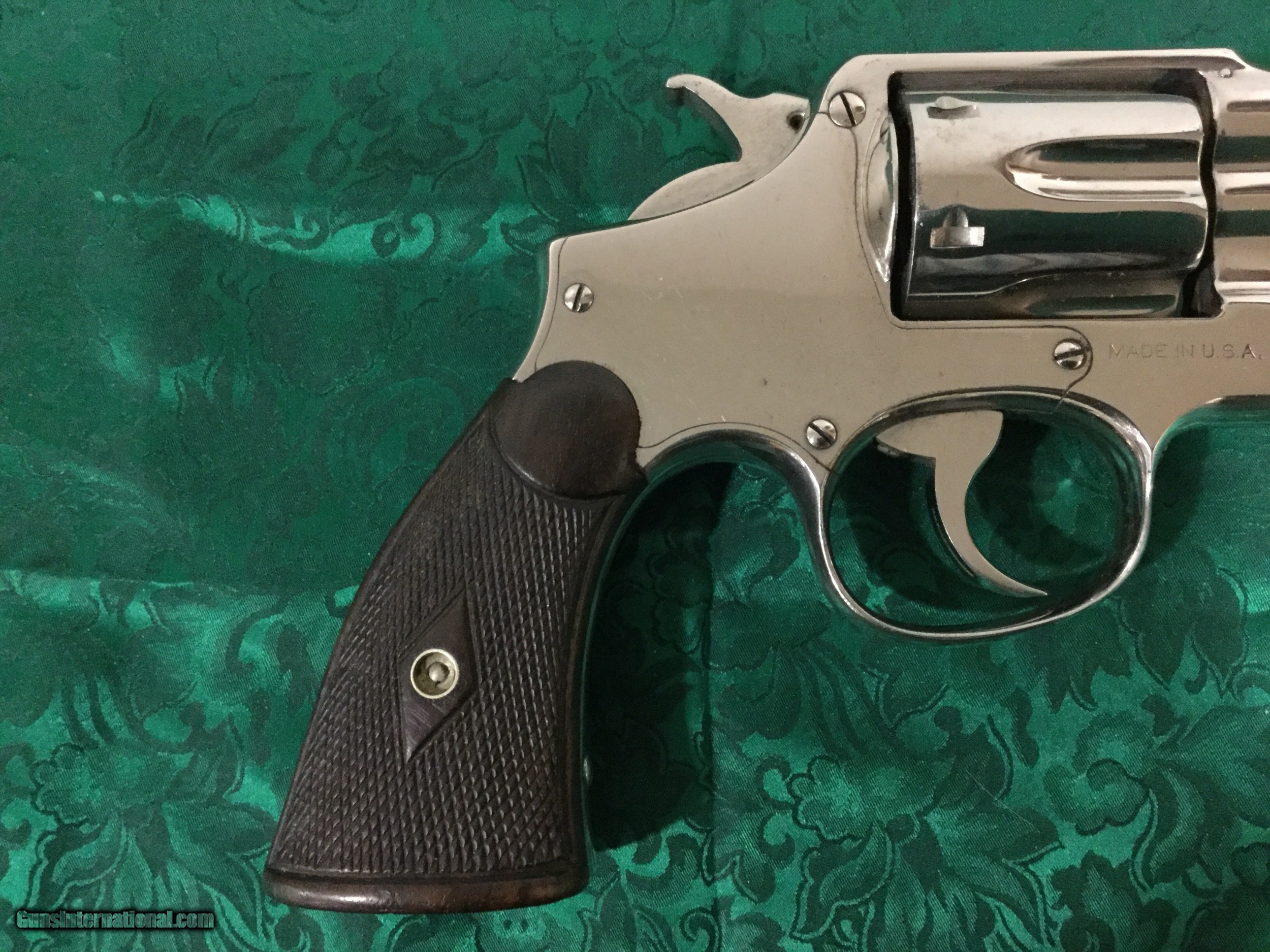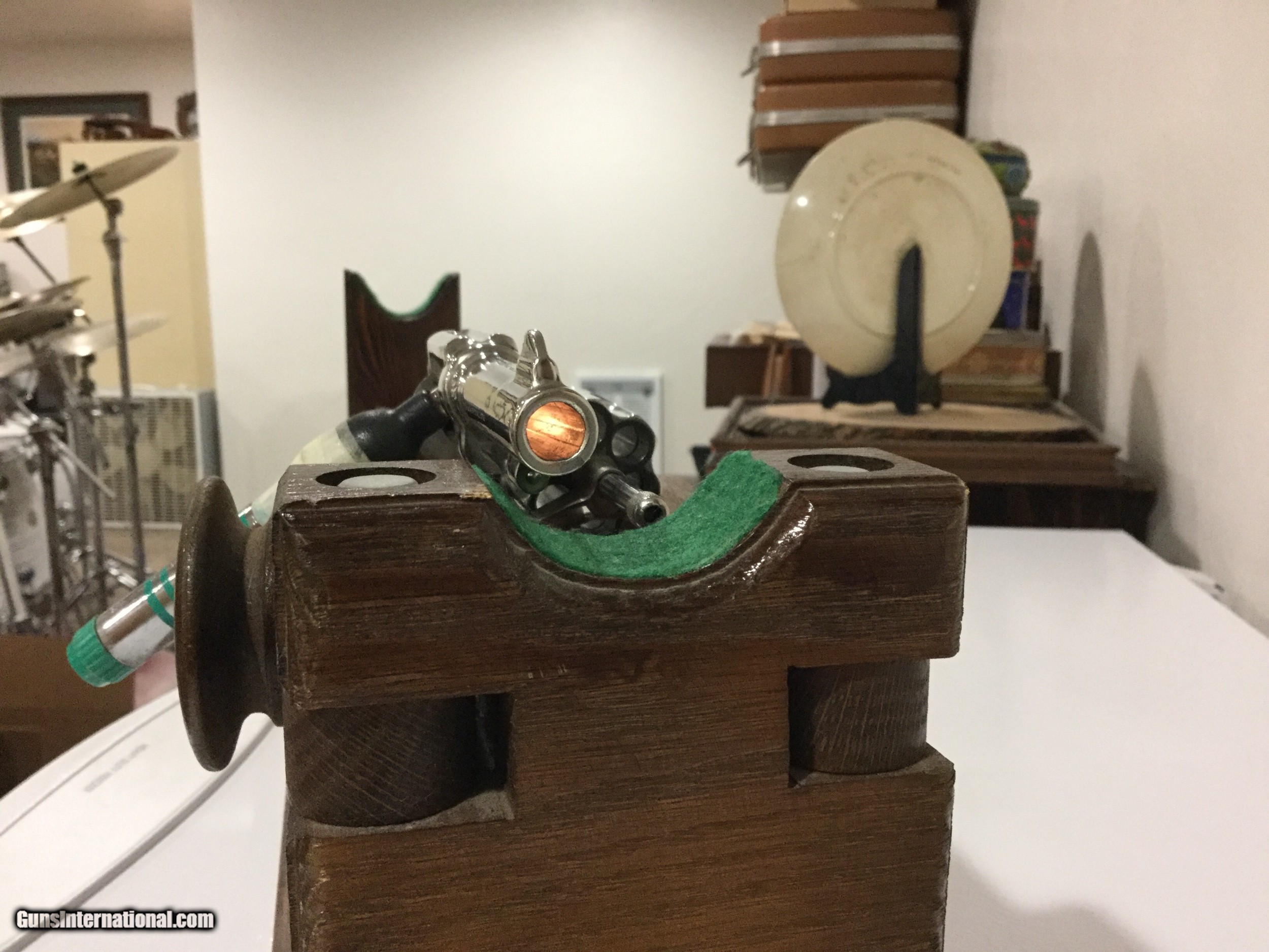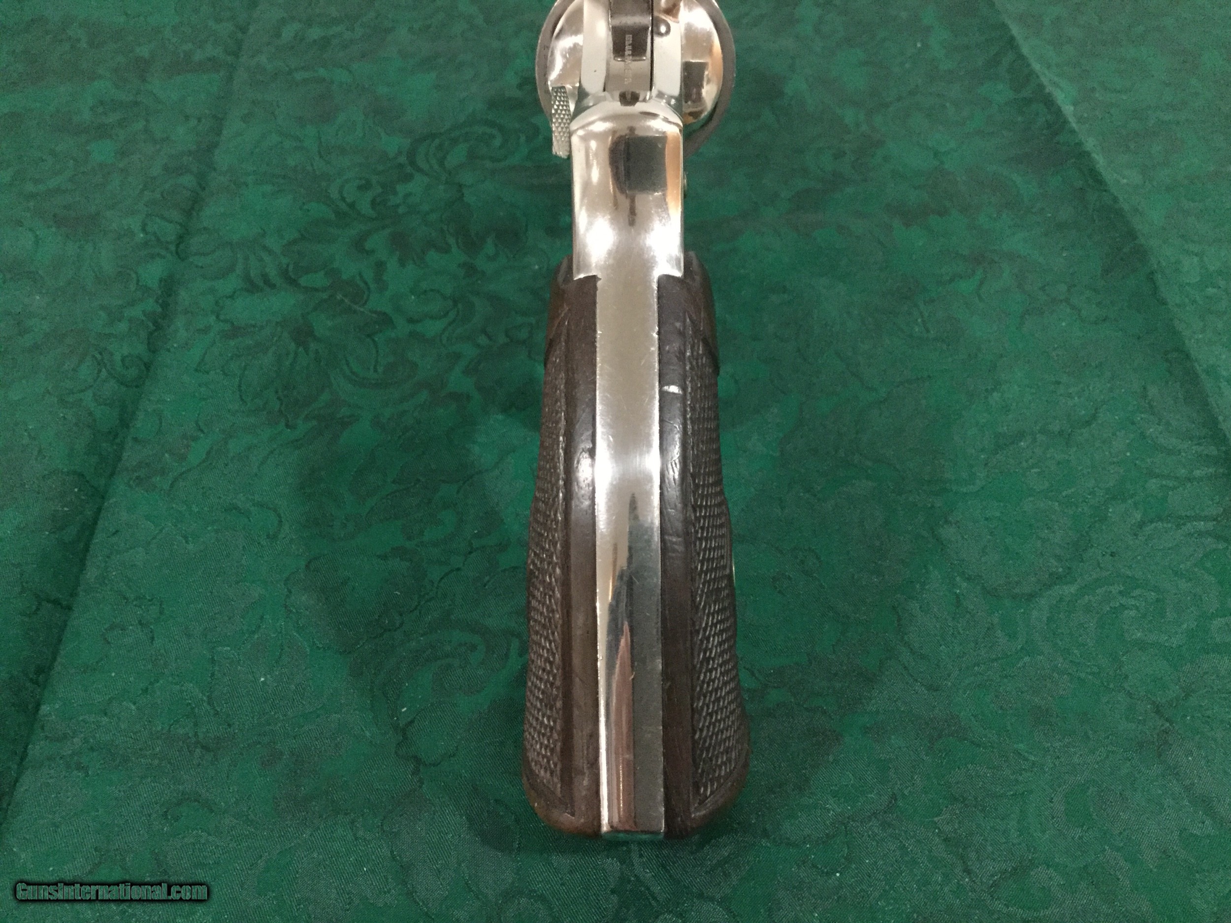 Description: Smith and Wesson M&P 1905 fourth change .38 spl, 4" barrel, 5 screw, nickel plated finish, checkered wood grips, lock up and timing are correct, shiny barrel, excellent lands and grooves, shiny cylinder chambers. The nickel finish and wood grips are in good condition. It was manufactured between 1915 and 1942. Shipping will be $25.00 which includes insurance from our FFL to your FFL. SOLD Manufacturer: Smith and Wesson Serial Number: 601867 Caliber Info: .38 spl Condition: Good Metal Condition: Good Wood Condition: Good Bore Condition: Excellent Action: Single/Double Finish: Nickel Sights: Fixed Manufacture Date: 1915-1942 |
