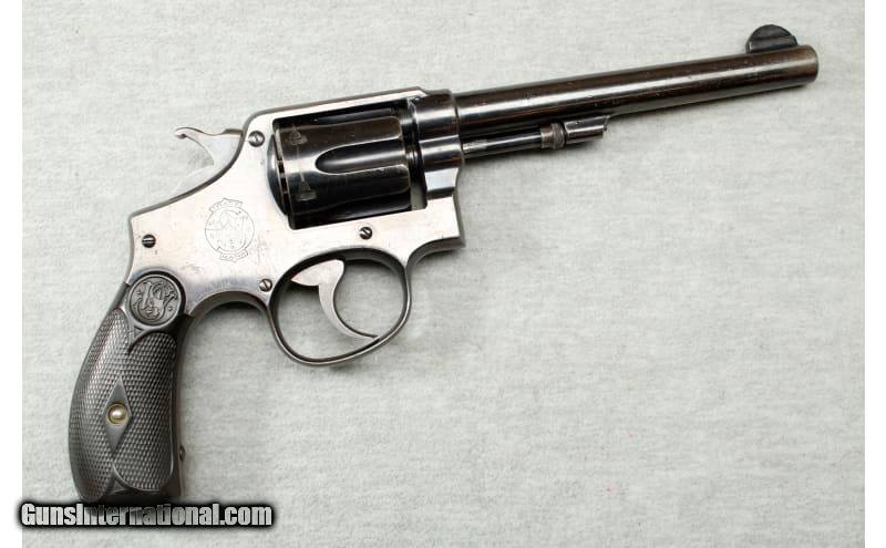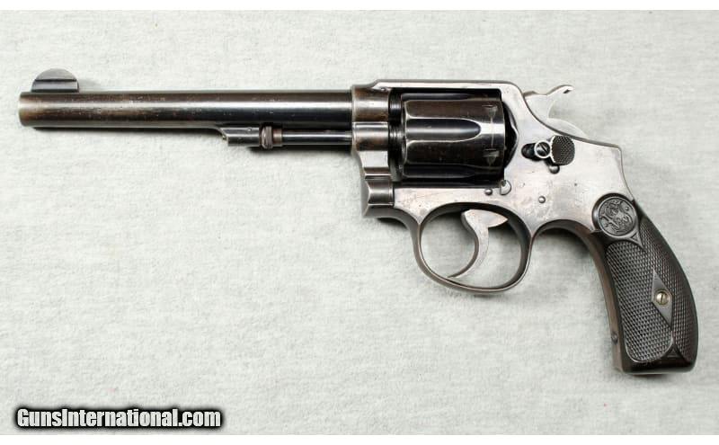 Description: S&W .38 Military & Police Model of 1902 Revolver. Manufactured circa 1903. 6 inch pinned barrel, 6 round fluted cylinder, hard rubber grips. Good overall with original finish, scattered spotting/oxidation, some handling marks present, minor cylinder drag line. Mechanically very good. .38 S&W Special SOLD Metal Condition: good Bore Condition: The bore is frosted with crisp rifling. Barrels: 6 inch pinned round Triggers: SA/DA Butt Pad: hard rubber grips Weight: 1 lb. 14 oz. Sights: factory sights Item Location: La Vista, NE |