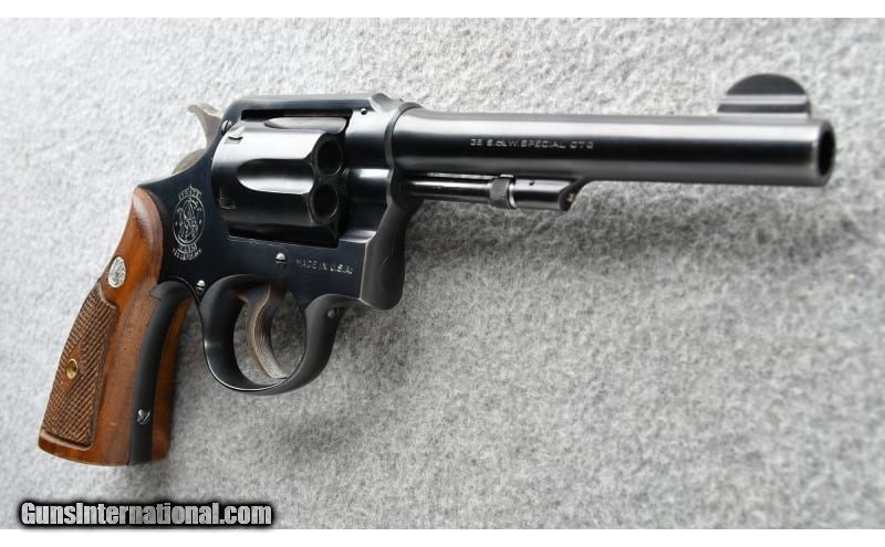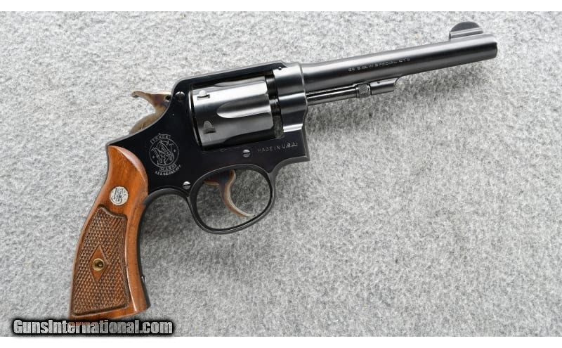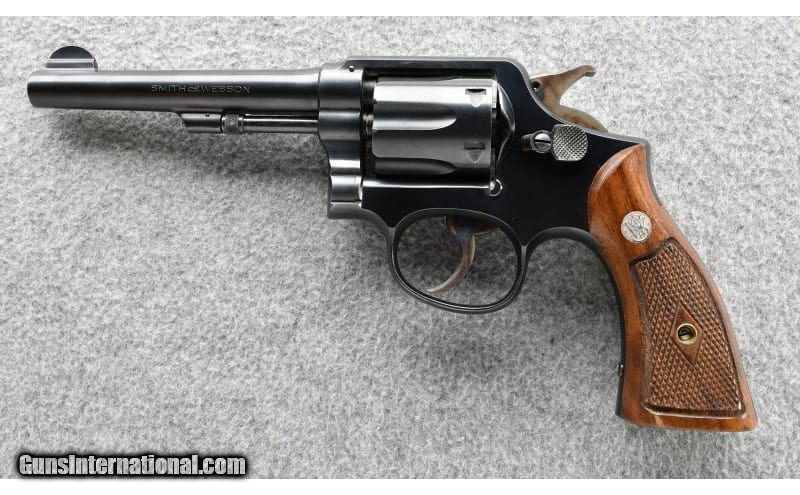 Description: The Smith & Wesson 'K' frame M&P 38 Pre Model 10 with 'S' prefix was produced after WWII until 1948 when the serial numbers were preceded by a 'C'. This revolver is in excellent condition. .38 S&W Special SOLD Chambers: .38 Smith & Wesson Special in a six round revolver Metal Condition: "Very good, appears in near new condition Wood Condition: Grips appear in excellent condition with one small dent on the left panel Bore Condition: Sharp and bright Barrels: 5" pinned Triggers: Single/Double action Weight: 32 oz. Sights: "Fixed blade front, Notched frame rear Item Location: Grand Junction, CO |