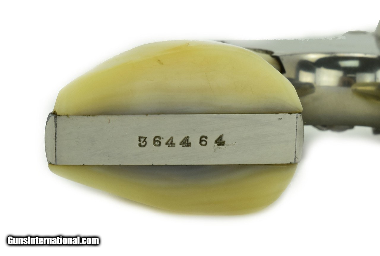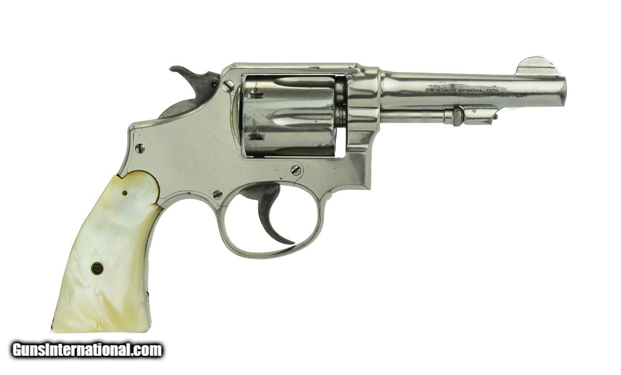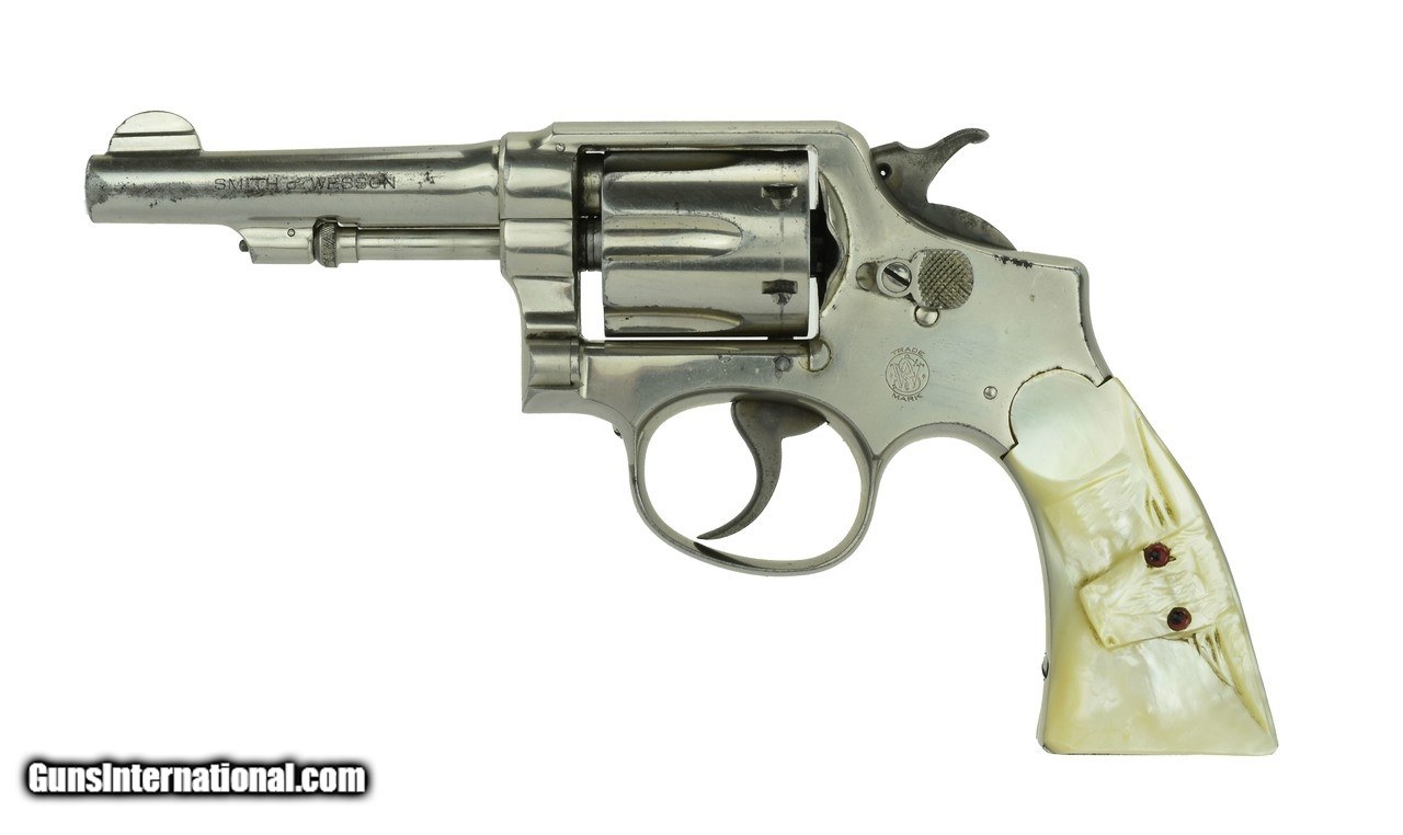 Description: Guns Listing ID: 548014 SN: 364464. Smith & Wesson M&P .38 Special caliber revolver. Pre-war 4" model with nickel finish and carved steer head pearl grips. Shows some light wear, has about 95% finish. Bore is very good. A great looking vintage wheel gun. (PR39980) SOLD Manufacturer: SMITH & WESSON Model: M&P Caliber Info: .38 SPL Condition: Used - Non-Certified Barrels: 4 BARREL Action: REVOLVER Finish: nickel |