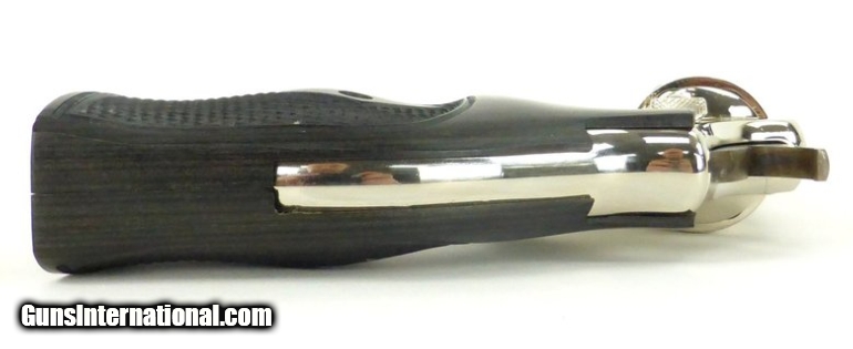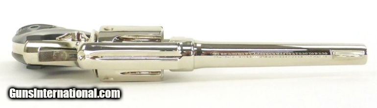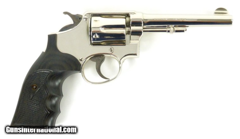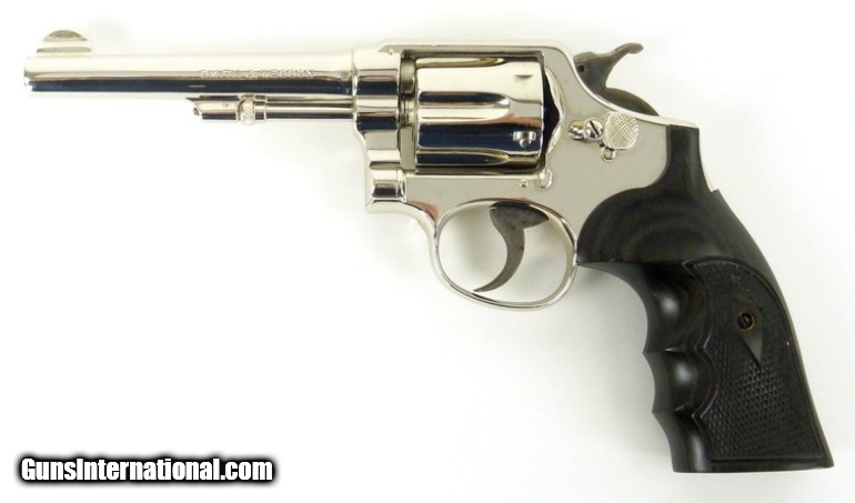Description: Smith & Wesson Military and Police .38 Special caliber revolver. Pre-war 5” model with custom bright nickel finish and custom wood grips in excellent condition. SOLD |
