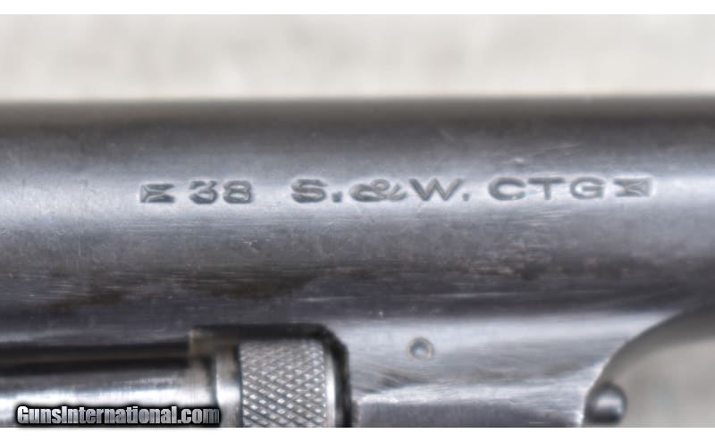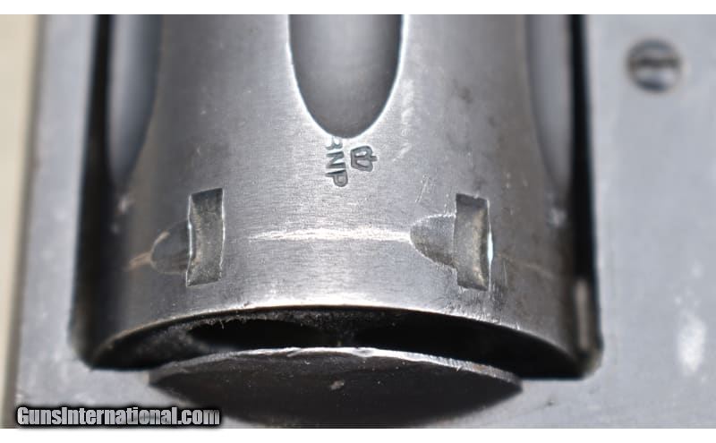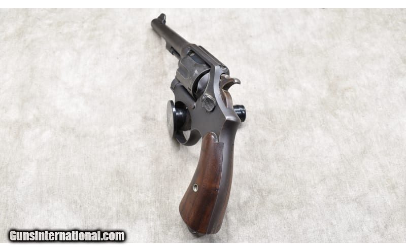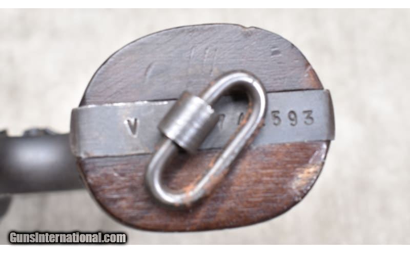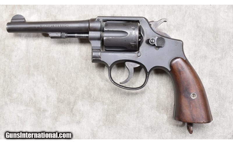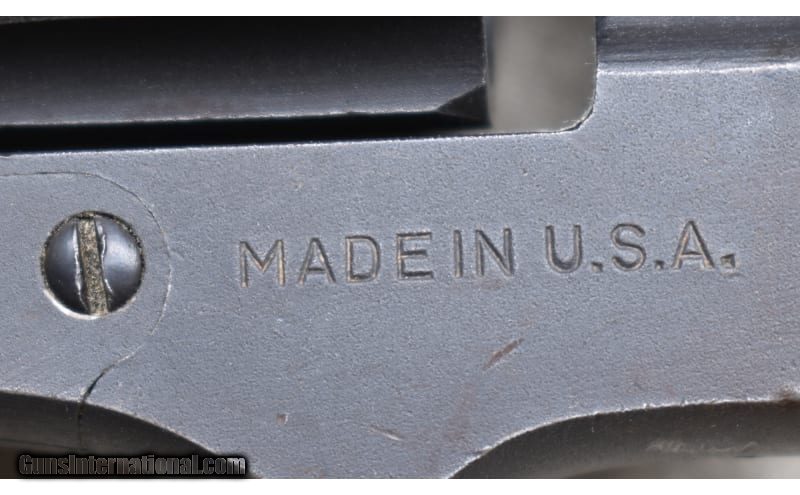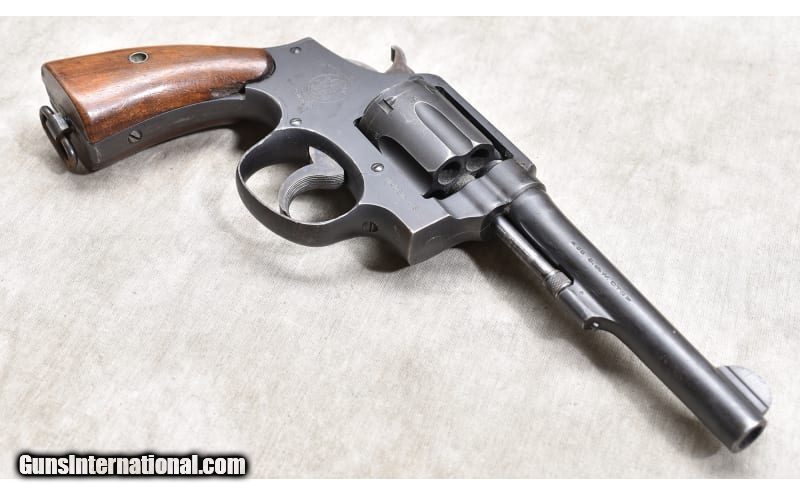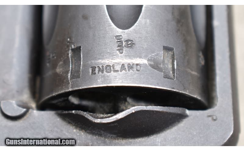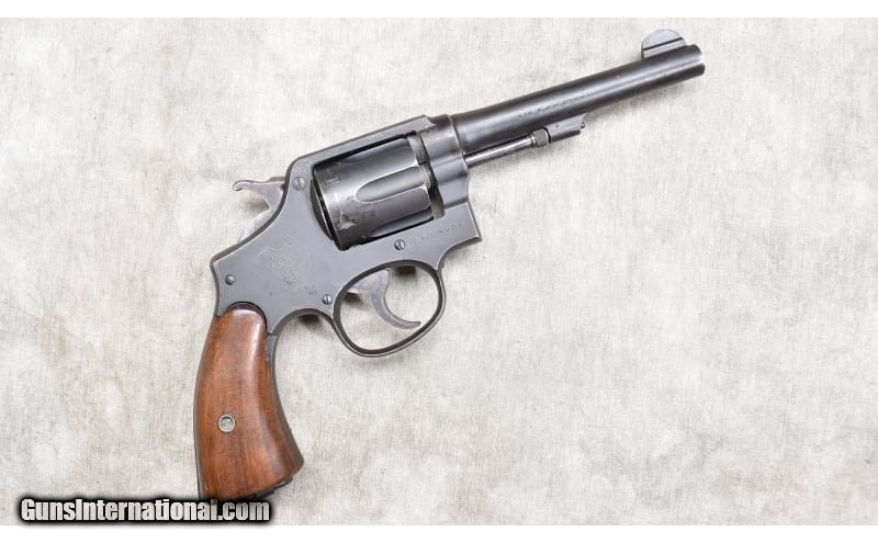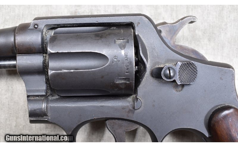 Description: This Victory Model features clear British proof marks. lt is in good shape with only the expected kind of military wear. The cylinder locks up reasonably tight. .38 S&W SOLD Chambers: 6 Metal Condition: "Good. Finish wear at the edges and high points, turn line, and some fine scratches. Wood Condition: Good. Shows it was handled with light scratches and some small chipping at the bottom. Bore Condition: Shiny but a little dark. Rifling is a little thin but sharp. Barrels: 5-inch Triggers: Factory double and single action trigger. Butt Pad: Smooth walnut. Weight: 31 oz Sights: Blade and top-strap notch Item Location: Rogers |