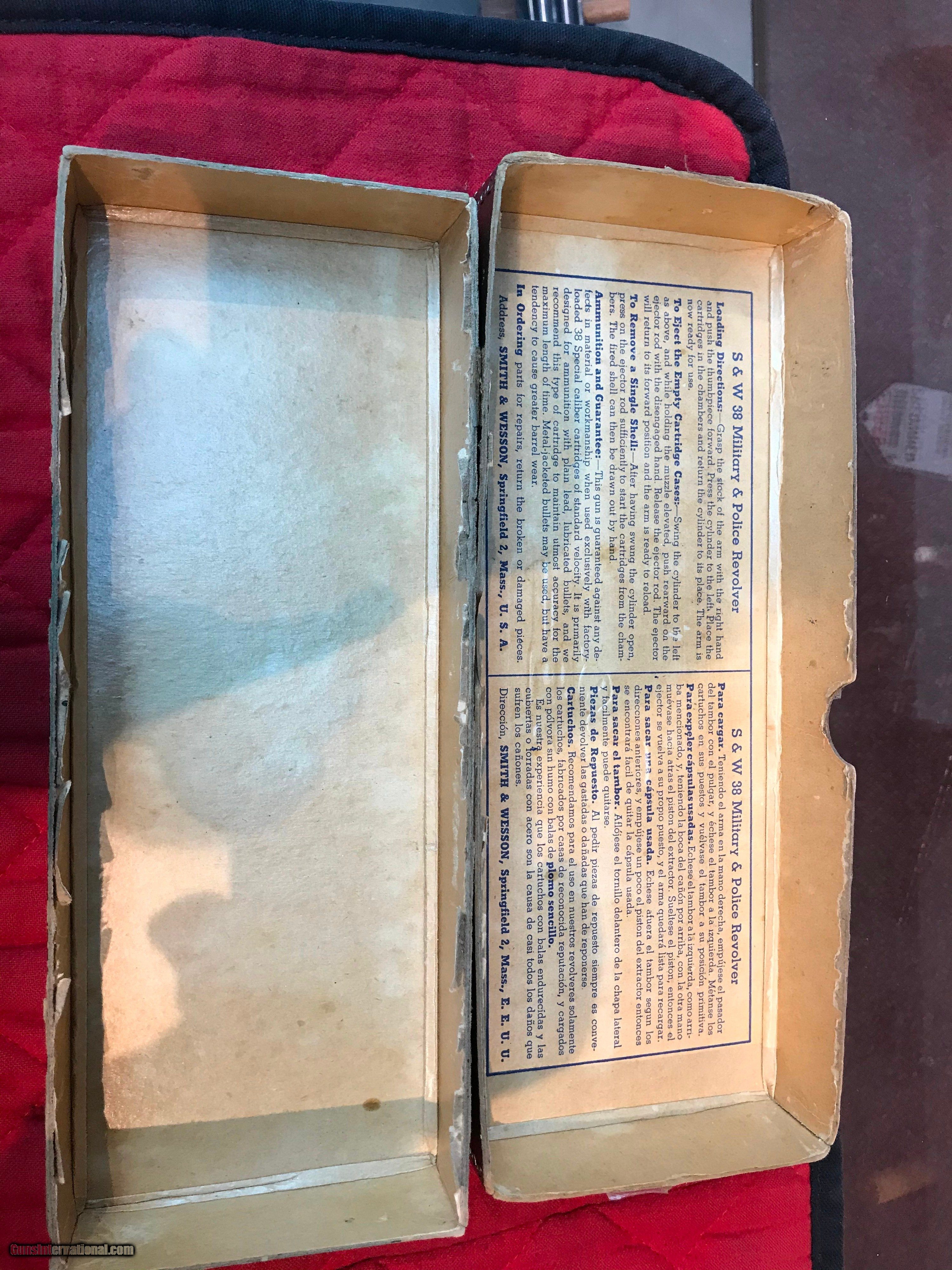 Description: Original box for series , the gun has a 4" barrel but box is for a 5" of the same model SOLD Handgun Caliber: .38 Special Manufacturer: Smith & Wesson Model: Military & Police Model 1905 4th change Serial Number: 607740 Barrel Length: 4 |