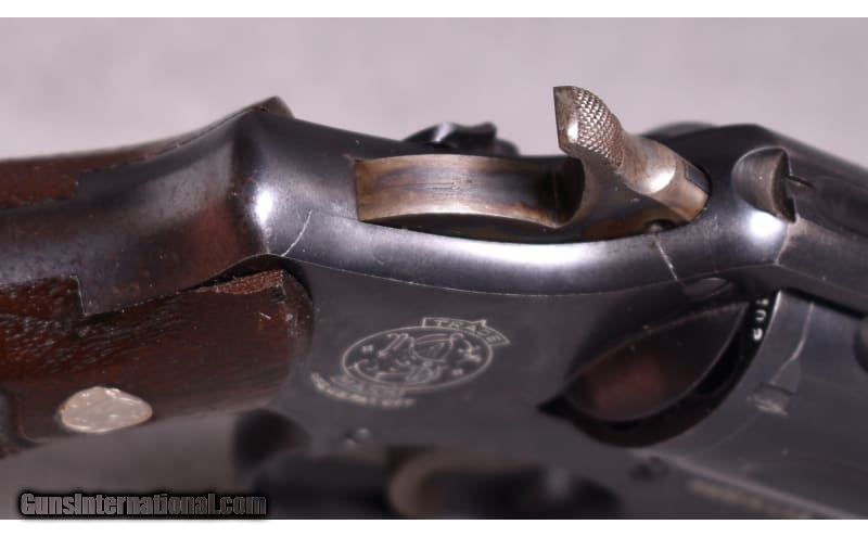Description: This Smith & Wesson Military & Police revolver was made in 1945 and is in excellent condition. There is a small chip out of the right grip panel (see photo). This iconic Smith & Wesson is in excellent condition. .38 S&W Special SOLD Metal Condition: Excellent Wood Condition: Very good Bore Condition: Excellent Barrels: 4 Weight: 2 lbs Sights: Blade front sight Item Location: Boise, ID |