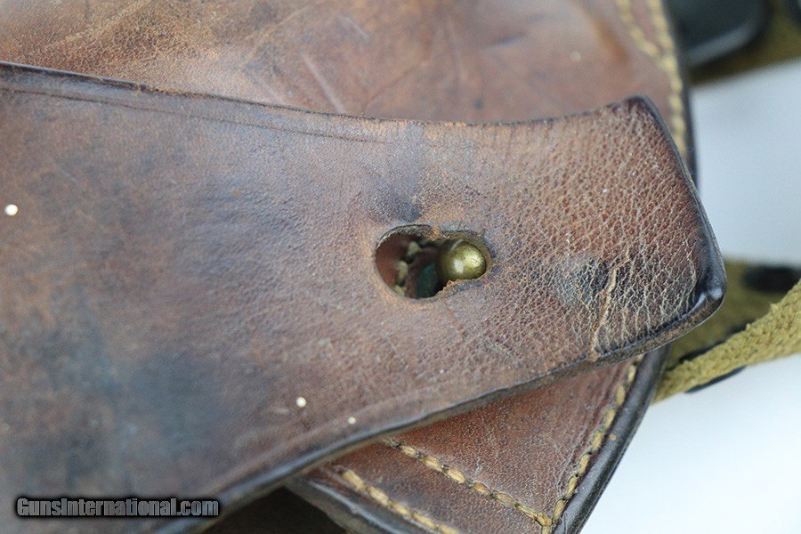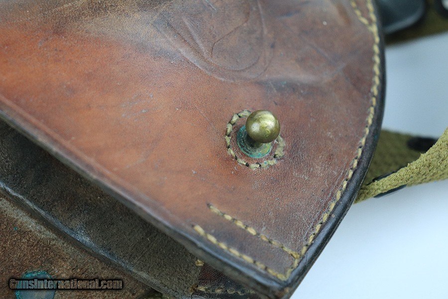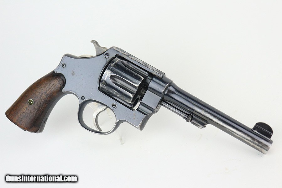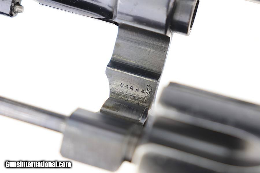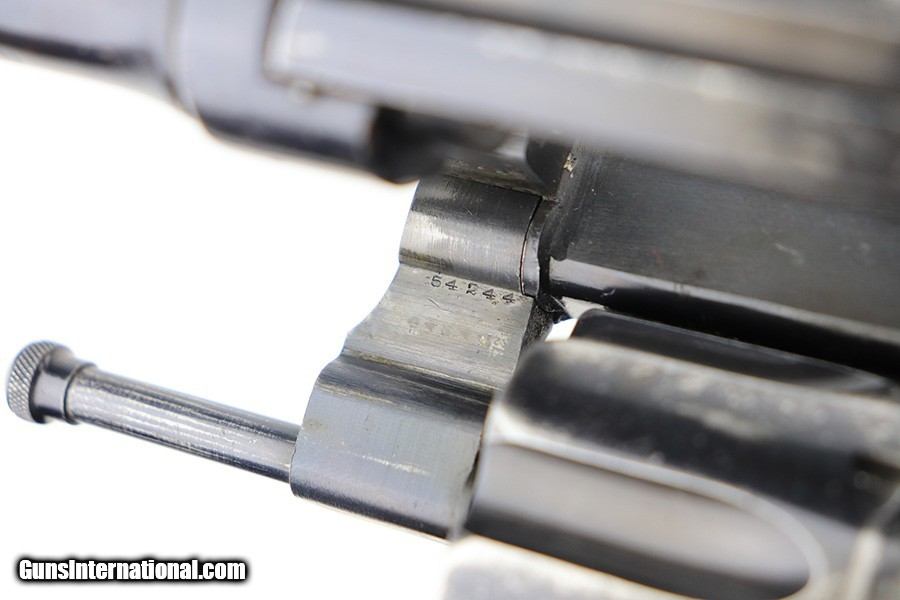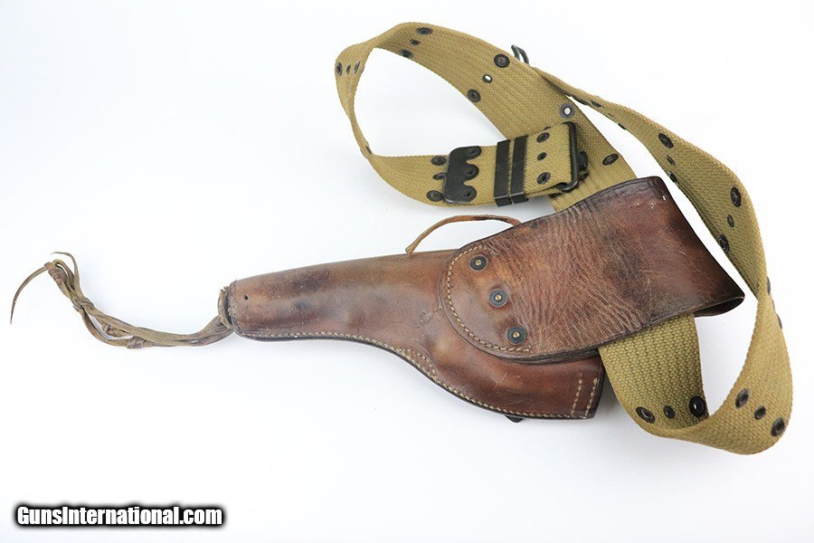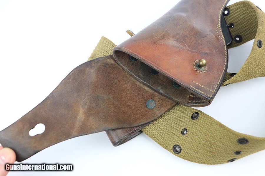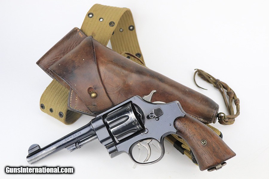 Description: This is a nice example of a Smith & Wesson Model 1917 revolver issued to the US military in 1918. It is all matching, has a "United States Property" marking on the underside of the barrel, and has the proper flaming bomb and "Eagle Head" military acceptance proofs. The gun comes as a full rig with a nice 1942-dated Textan leather holster and a 1942-dated canvas belt. The gun fits into the holster like a glove. The gun has retained roughly 85% of its original high polish bluing. The majority of the finish loss comes in the form of scratchy wear on both sides of the barrel. There is also spotty wear on the top strap, high edges of the cylinder, and on the underside of the trigger guard. Scratchy wear on both grip straps. There are light scratches and handling marks on most surfaces of the gun. A noticeable ding on the trigger guard. Roll mark on the cylinder. The cylinder is tight, and the action is smooth. Comes with period-correct wood grips that are not numbered. There is a chip in the bottom corner of the right panel and a tiny chip at the top of the left panel. The rifling in the bore is a little worn with pin-pricking throughout and one area of freckling. SOLD Handgun Caliber: .45 ACP (.45 Auto) Bore: 7.5/10 Condition: ~85% |