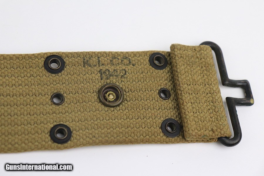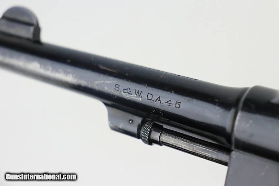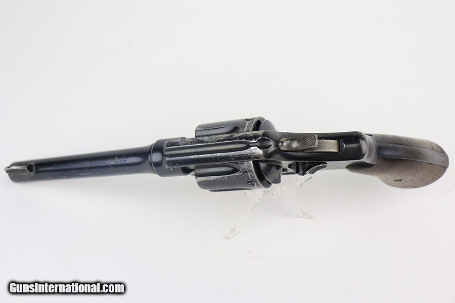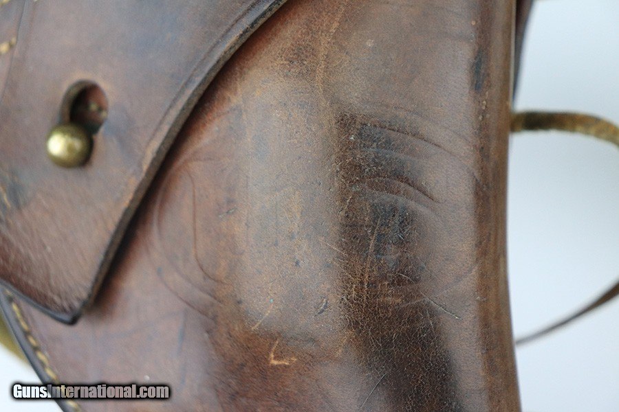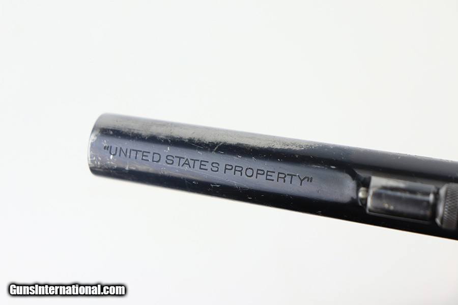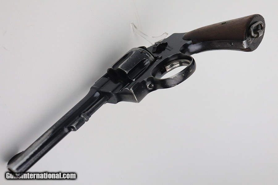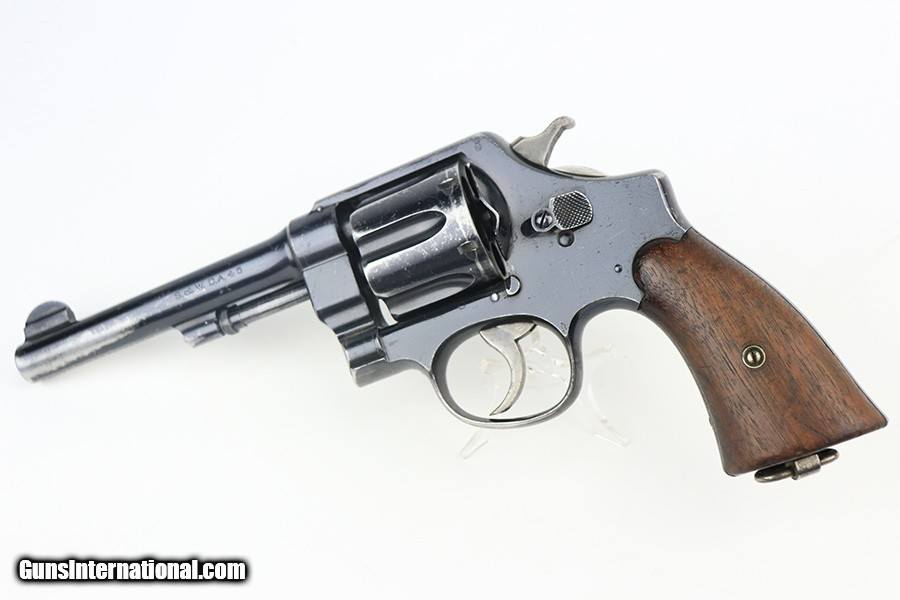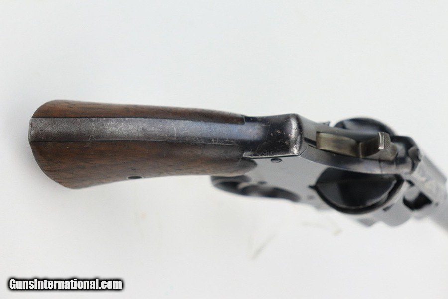 Description: This is a nice example of a Smith & Wesson Model 1917 revolver issued to the US military in 1918. It is all matching, has a "United States Property" marking on the underside of the barrel, and has the proper flaming bomb and "Eagle Head" military acceptance proofs. The gun comes as a full rig with a nice 1942-dated Textan leather holster and a 1942-dated canvas belt. The gun fits into the holster like a glove. The gun has retained roughly 85% of its original high polish bluing. The majority of the finish loss comes in the form of scratchy wear on both sides of the barrel. There is also spotty wear on the top strap, high edges of the cylinder, and on the underside of the trigger guard. Scratchy wear on both grip straps. There are light scratches and handling marks on most surfaces of the gun. A noticeable ding on the trigger guard. Roll mark on the cylinder. The cylinder is tight, and the action is smooth. Comes with period-correct wood grips that are not numbered. There is a chip in the bottom corner of the right panel and a tiny chip at the top of the left panel. The rifling in the bore is a little worn with pin-pricking throughout and one area of freckling. SOLD Handgun Caliber: .45 ACP (.45 Auto) Bore: 7.5/10 Condition: ~85% |