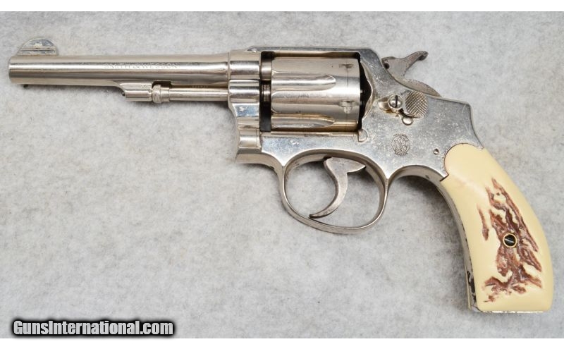 Description: Includes letter of provenance. SOLD Manufacturer: 1923 Caliber Info: .38 Spl. Metal Condition: Good with all of the nickel finish remaining and some freckling. Bore Condition: Shiny with strong rifling. Barrels: 6 Stock: Imitation stag plastic grips. Weight: 29-ozs. Sights: Front blade, rear notch. Item Location: Fort Worth, TX |