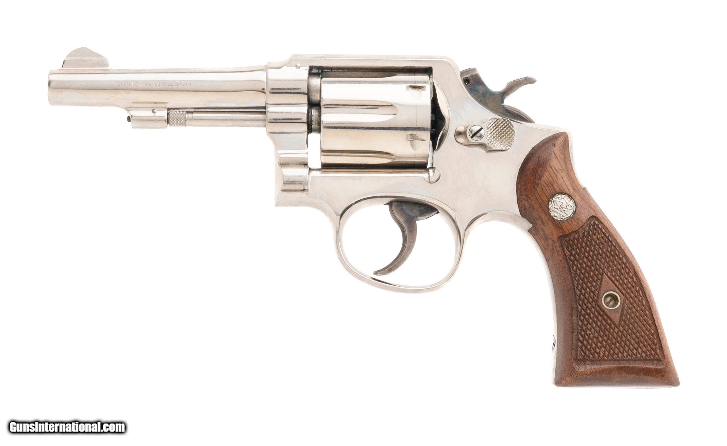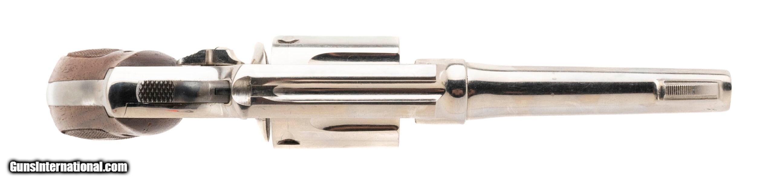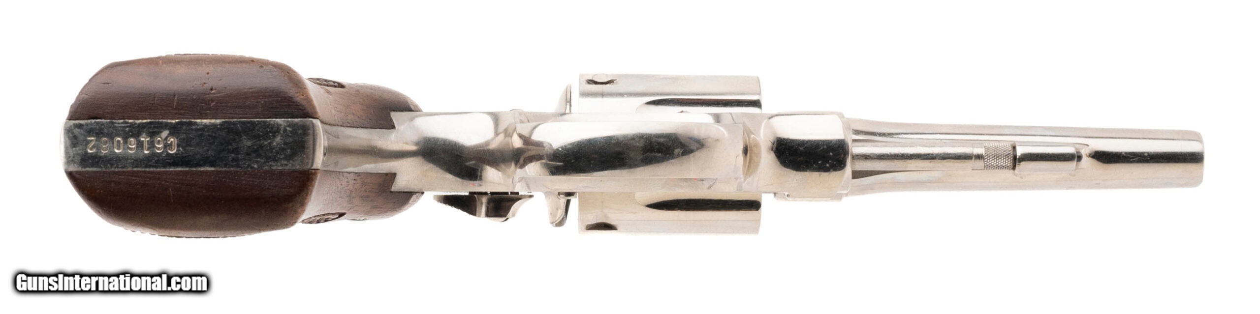 Description: "SN: C616082. 1960’s vintage 38 Special with a 4" barrel. K-frame service revolver. Has about 97% original nickel finish with some scuffs and wear. The diamond grips are very good with light wear. Overall very good condition. SOLD |