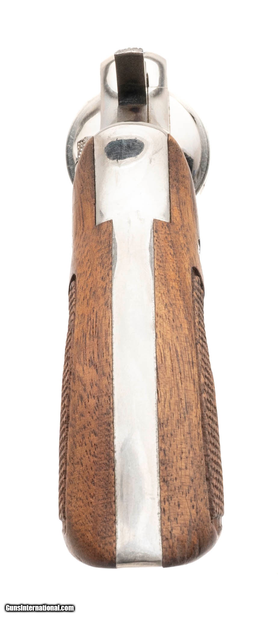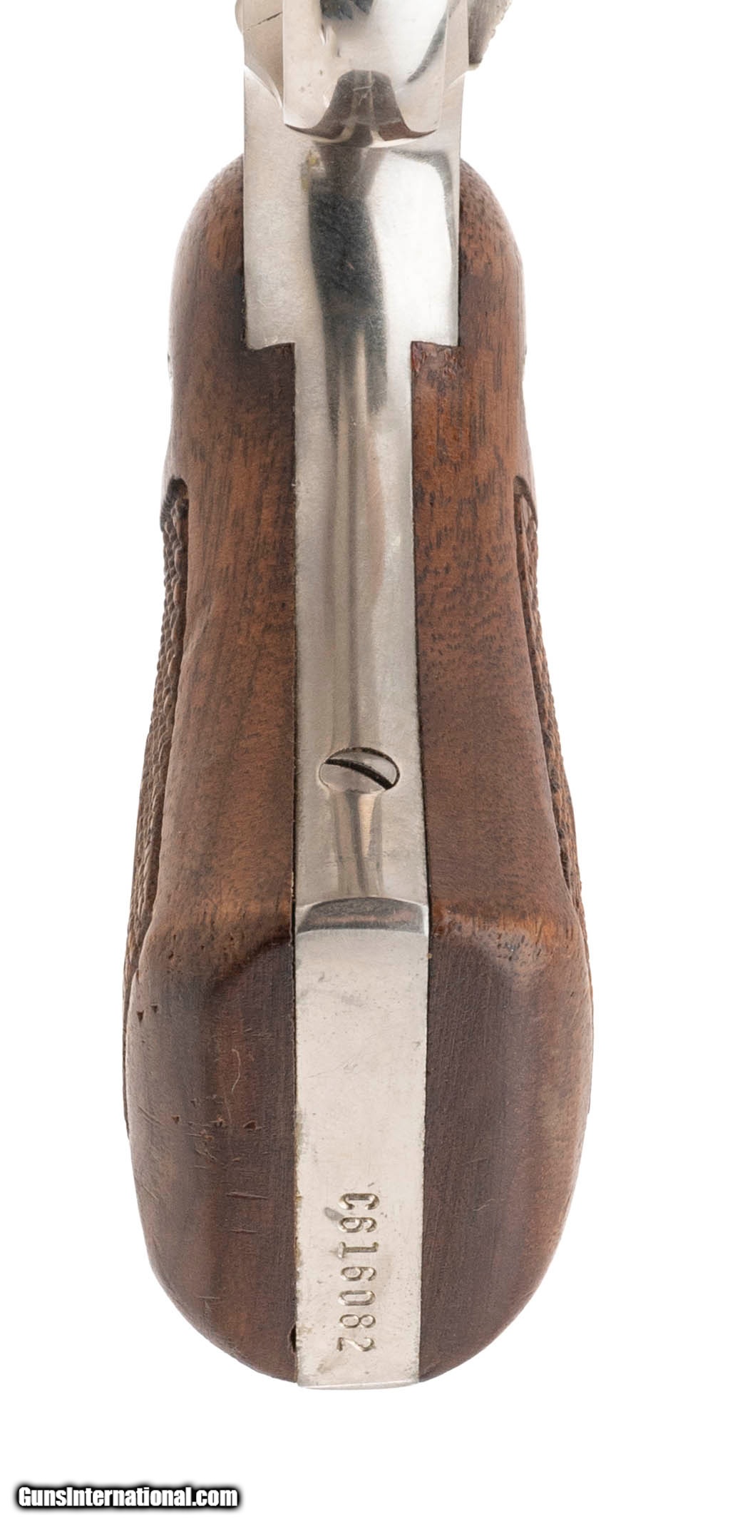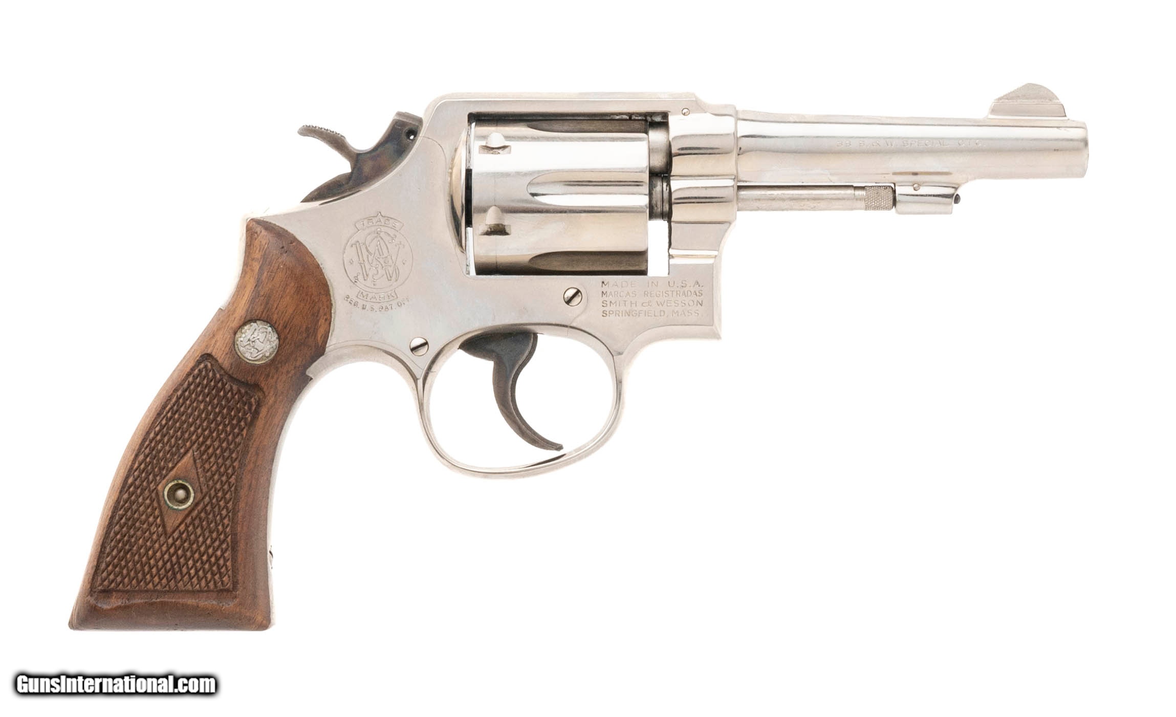 Description: "SN: C616082. 1960’s vintage 38 Special with a 4" barrel. K-frame service revolver. Has about 97% original nickel finish with some scuffs and wear. The diamond grips are very good with light wear. Overall very good condition. SOLD |