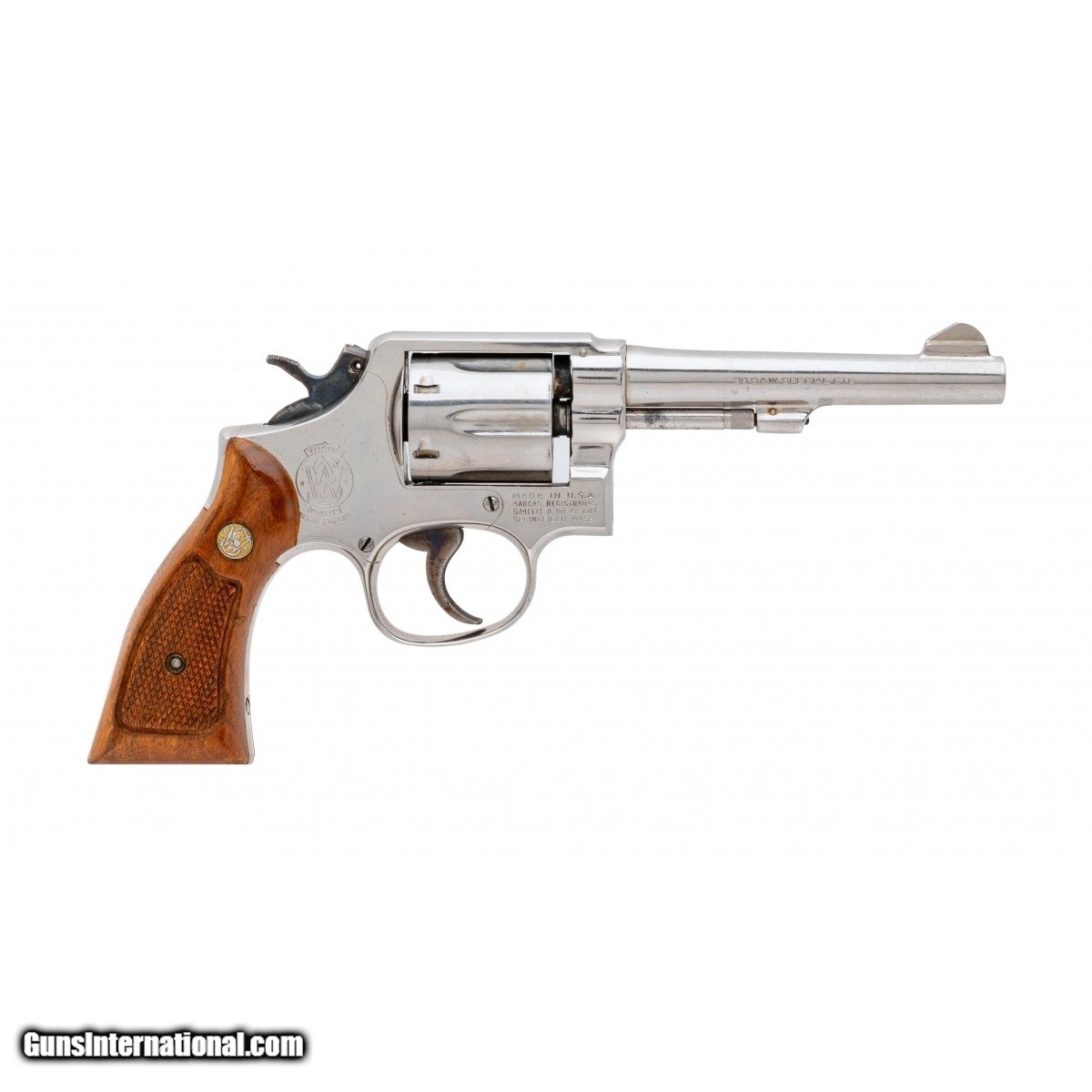 Description: " SN: 4D73037. 1970's vintage .38 Special with a 5"" barrel. Bore is excellent. K-frame revolver with nickel finish and wood grips. Has 98% nickel with light wear. The grips are excellent. Overall very good condition. SOLD |