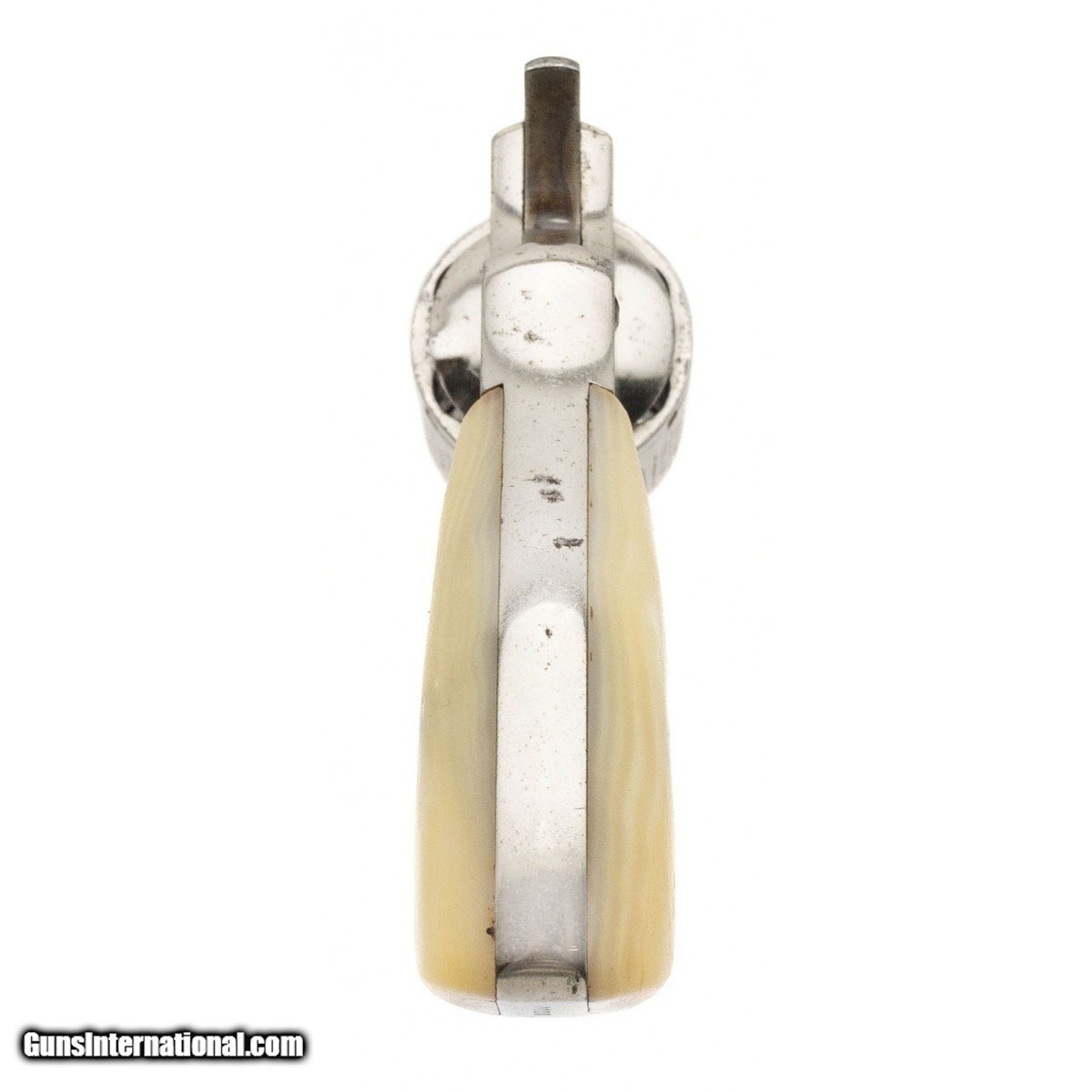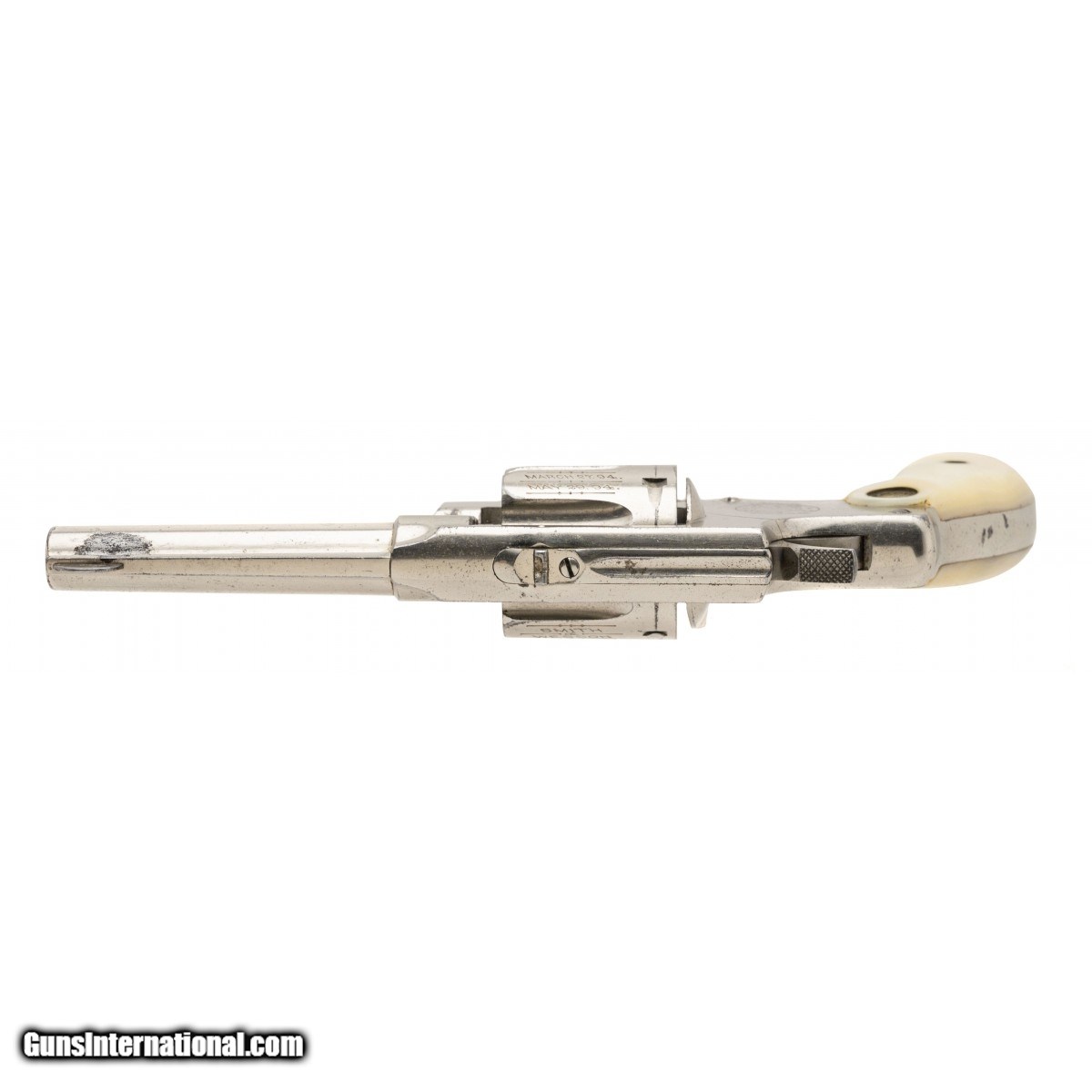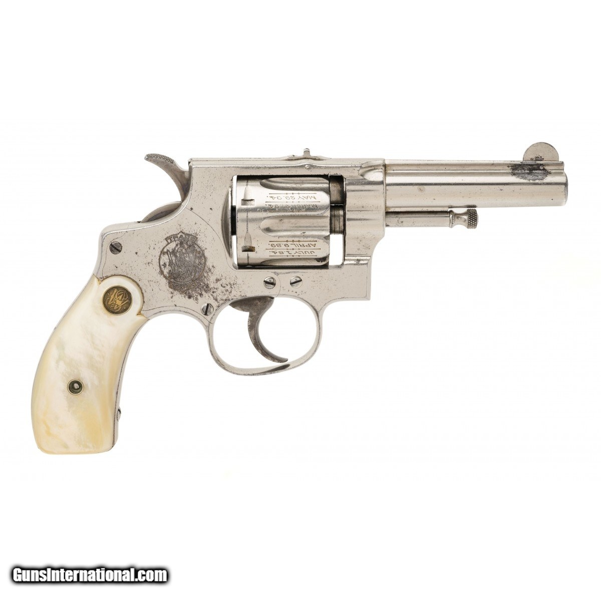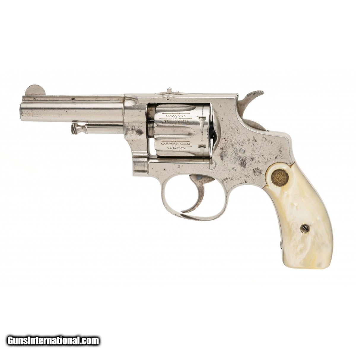 Description: " SN: 7700. Late 1890s .32 S&W Long with a 3.25"" barrel. Bore is good, sharp rifling with some pitting. Scarce 1st model Hand Ejector revolver. Has about 90% of the original nickel finish and medallion pearl grips. The action works correctly. A fine S&W revolver, in overall very good condition. SOLD |