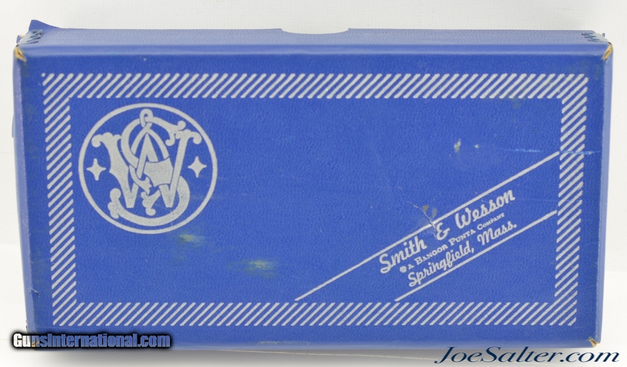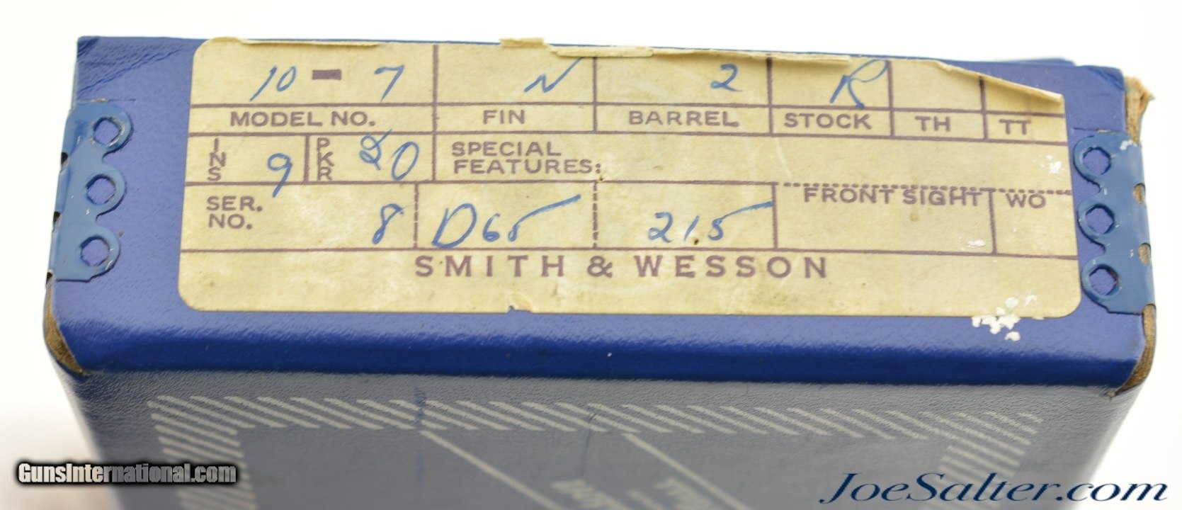 Description: Serial #8D65215, .38 Special, 2 inch pinned barrel with a bright, excellent bore. This is the model 10-7 Military & Police revolver manufactured by Smith & Wesson in 1977. The metal surfaces retain 99% plus original nickel plate with a very light turn ring on the cylinder. The service trigger and hammer retain bold case-hardened colors with light operational wear. The checkered walnut round butt factory Magna grips are numbered to the gun, they feature silver S&W medallions, and rate near excellent the left panel shows a very fine crack running with the grain from the top of the medallion to edge of the upper "ear" that at this point has not seemed to have affected the panels integrity. This gun features fixed sights, and it correctly times and locks up. It comes in a blue Bangor Punta box correctly end labeled to the gun. Also included is a spare set of service style black pearlite grips with fiber board backing and no manufacture marking possibly Ajax brand, in addition to a cleaning kit, manual, and paperwork. An excellent example of the desirable nickel plated model 10's. FFL SOLD |