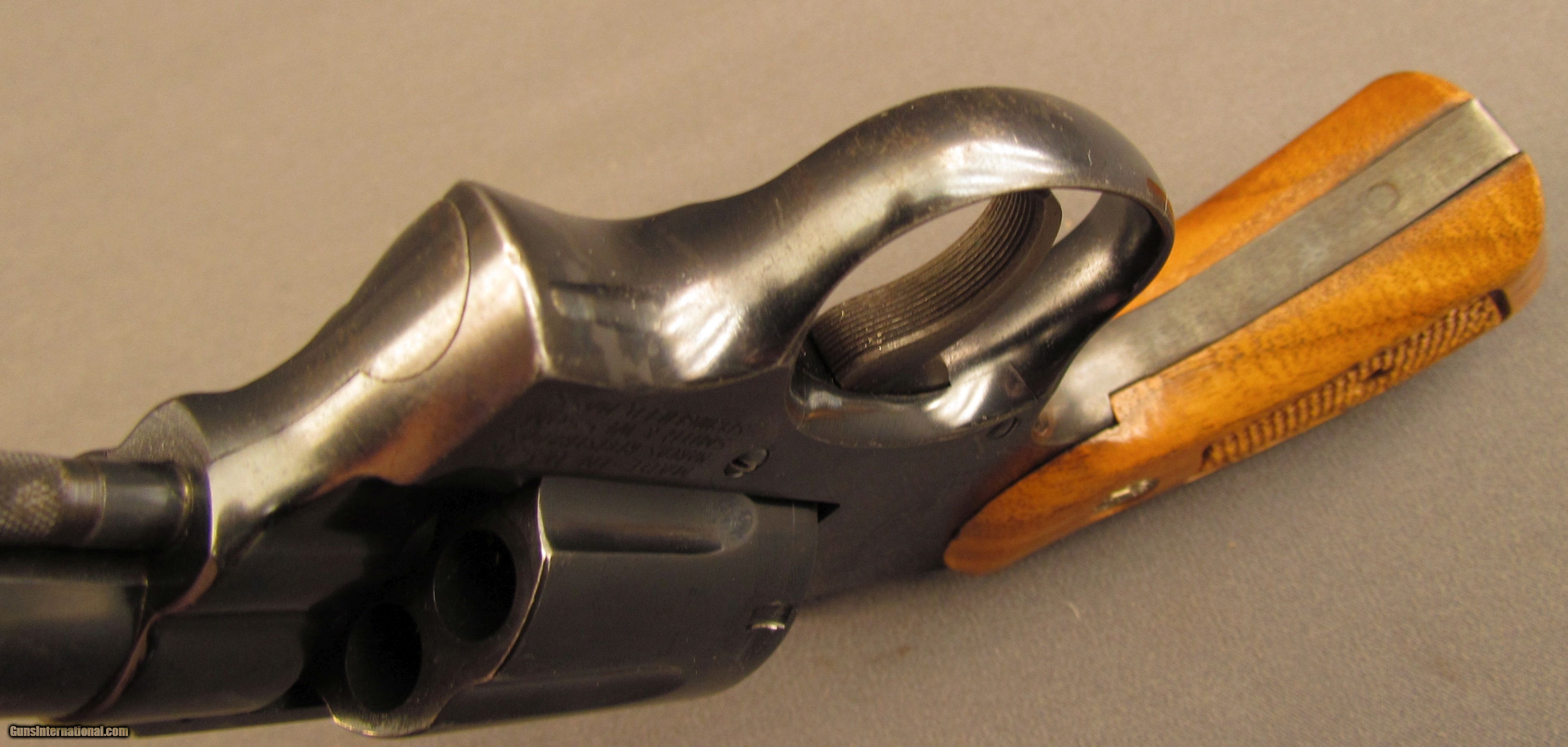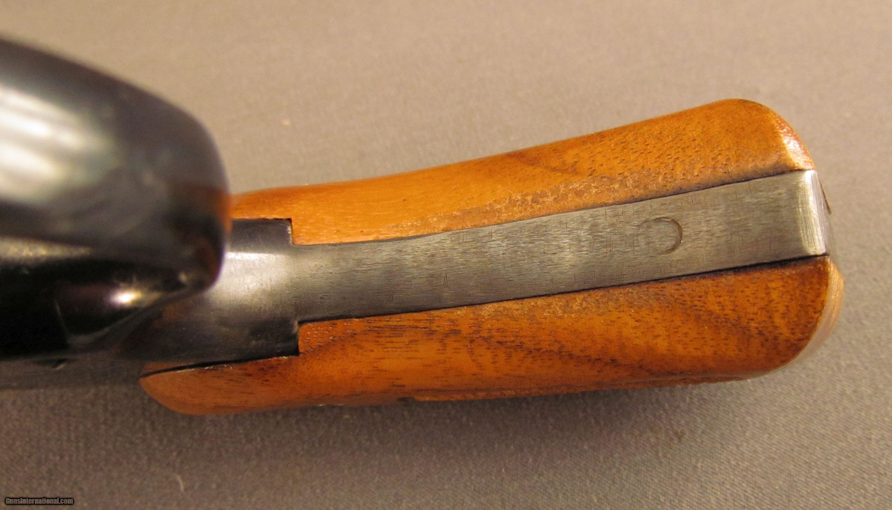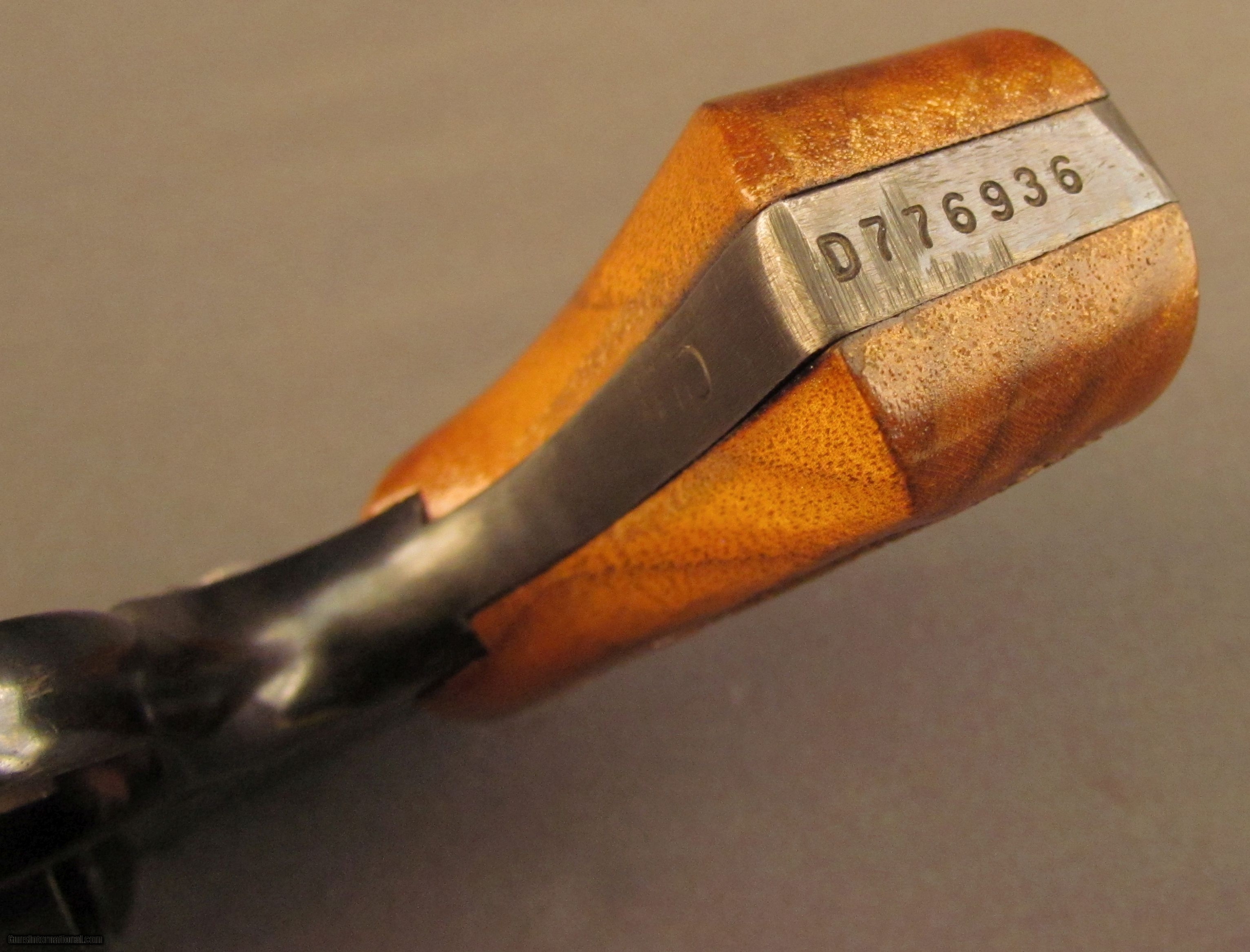 Description: Serial #D776936, .38 Special, 2” barrel with an excellent, bright bore. This is a very nice, pinned barrel revolver whose metal surfaces retain 90-92% original blue with some silvering at the muzzle, on the cylinder flutes, and some darker discoloration and tool marks on the gripstrap at the butt. There are some other minor handling marks, as well as a light turn-ring and minor surface scratches on the cylinder. The color case-hardening is still strong on the hammer and trigger with only some trace gray fading along the edges. The checkered walnut grips with S&W medallions are in fine condition overall, with only a few light handling marks and a little mild flattening of the of the points on either side. The lock-up is still tight, and this is a very nice Model 10 “Snub Nose” in fine-near excellent condition. FFL SOLD Manufacturer: S&W Model: 10 Serial Number: D776936 Caliber Info: .38 Spl Gauge Info: .38 Spl |