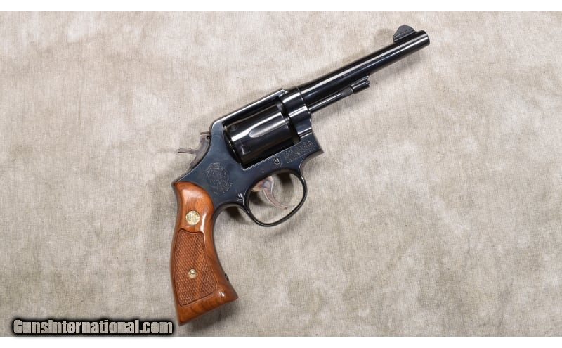 Description: This Military and Police revolver, Model 10-5 is in excellent condition and if fired it doesn't show. The case colored trigger and hammer are knurled. The sights are fixed. Nice little pistol. .38 S&W Special SOLD Chambers: 6 rounds Metal Condition: Excellent. Wood Condition: Excellent. Bore Condition: Shiny and bright with good rifling. Barrels: 5-inch Triggers: Factory double and single action trigger. Butt Pad: Checkered walnut with S&W medallions. Weight: 31 oz Sights: Serrated post and notch fixed sights. Item Location: Rogers |