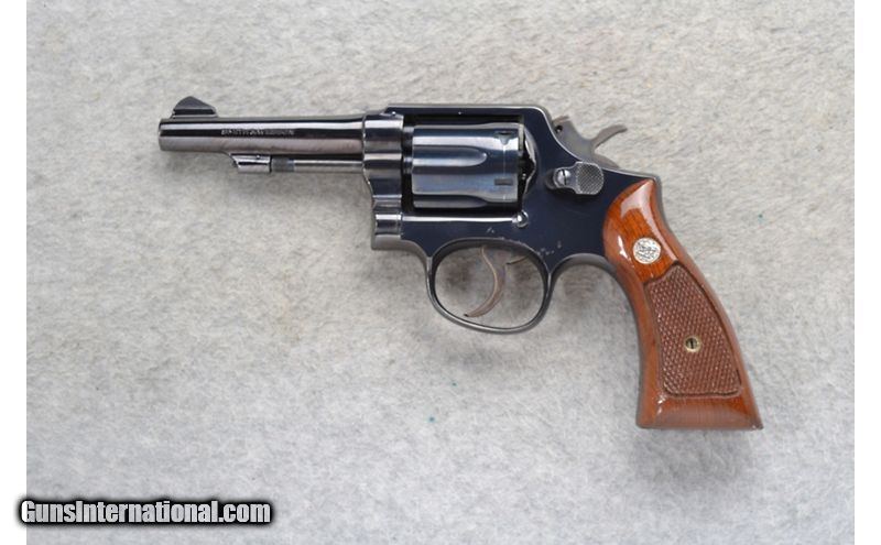 Description: This Smith & Wesson Model 10-5 is a 6 shot double action K-frame revolver in .38 Special Cal. It has a 4 inch barrel. A blade front sight and integral notch rear sight. The grip is a checkered walnut with silver S&W medallions and smooth front and back straps. The trigger is grooved. .38 Special SOLD Chambers: 6 shot. Metal Condition: Fair. Has some light rust spots and surface finish blemish right side. Wood Condition: Good. A couple of handling marks. Bore Condition: Very good. Barrels: 4 inch. Triggers: Double Action. Weight: 30 Oz. Sights: Blade front. Integral notch rear. Item Location: Richfield, WI |