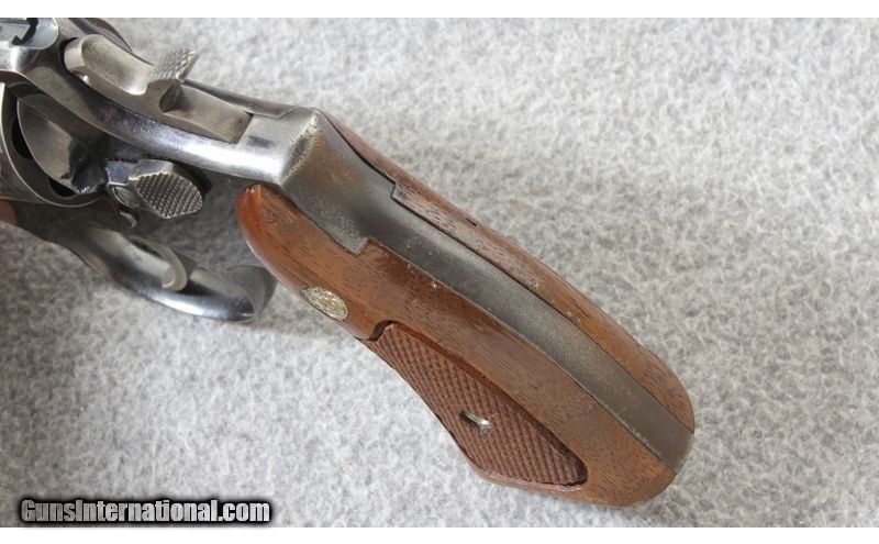 Description: This Smith & Wesson Model 10-5 Military & Police .38 Special has seen plenty of time in the holster. This Model was very popular with police forces all over the world. The action on this revolver is well timed. There is some end shake play in the cylinder. The grips are not the original and are serial numbered to a later model 10. It still has plenty of life and would make a good personal defense handgun. Manufactured 1966/67. .38 Special SOLD Metal Condition: Fair, holster wear on the barrel and cylinder with finish loss on the backstrap, some scattered fine pitting Wood Condition: Poor, poorly refinished, flattened checkering, chip out of left panel, scratches and dents Bore Condition: Very good, sharp and bright Barrels: 4 inch pinned barrel Triggers: Standard serrated trigger Weight: 32 oz. Sights: Fixed square notch rear sight with serrated blade front Item Location: Lehi, UT |