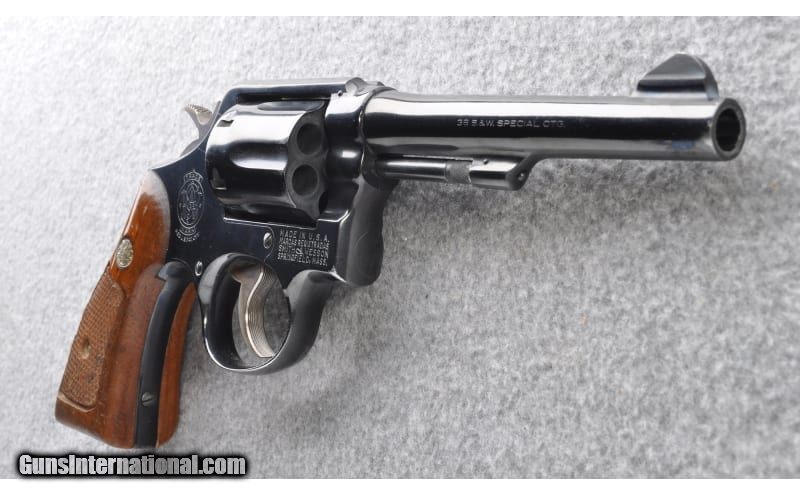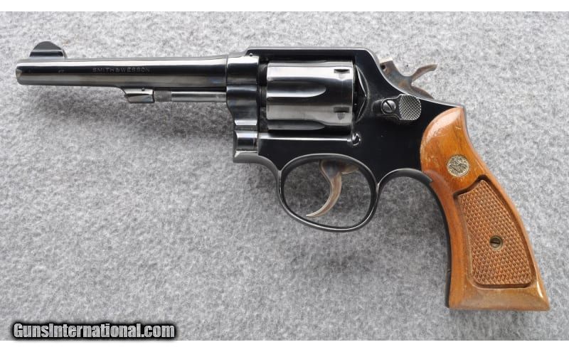 Description: The Smith & Wesson Model 10 was previously known as the Hand Ejector Model, Military & Police or the Victory Model. Introduced in 1899 and still in production as the most popular handgun of the 20th Century. .38 S&W Special SOLD Chambers: .38 S&W Special in a six round revolving cylinder Metal Condition: "Very good, showing light blue wear at the muzzle and bottom of the crane Wood Condition: Grips are very good with few marks Bore Condition: Sharp & bright Barrels: 5 Triggers: Single/Double Action Weight: 32 oz. Sights: Fixed blade front with notched frame rear Item Location: Grand Junction, CO |