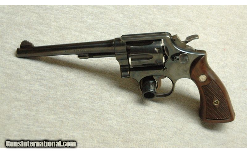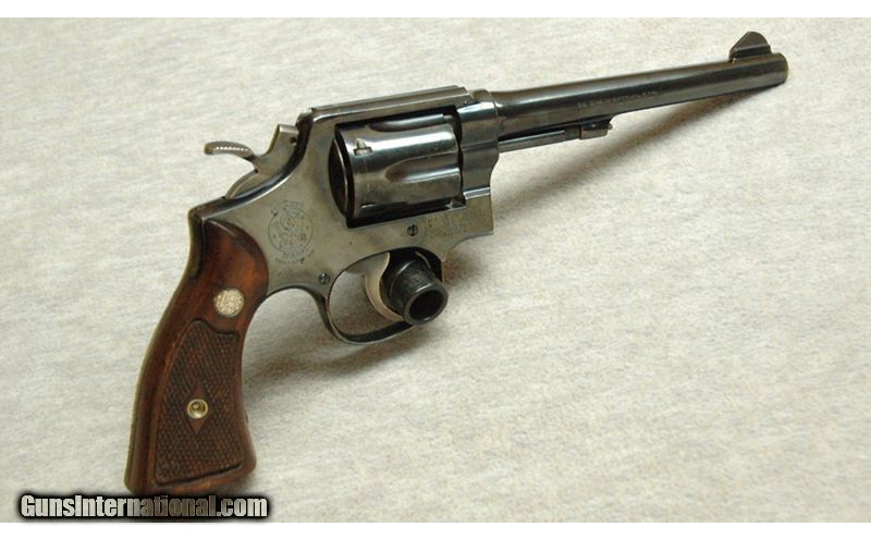 Description: Excellent, light wear marks, few nicks and scratches. S&W .38 Special revolver with 6" barrel and factory wood grips. Manufactured from 1954 to 1956. .38 S&W SOLD Curio/Relic: Yes Chambers: Revolver Metal Condition: Excellent Wood Condition: Grips are excellent Bore Condition: Bright Barrels: 6 Triggers: Double and single action Butt Pad: Wood grips Sights: Fixed sights Item Location: La Vista, NE |