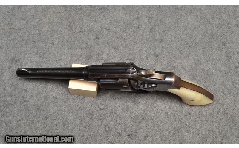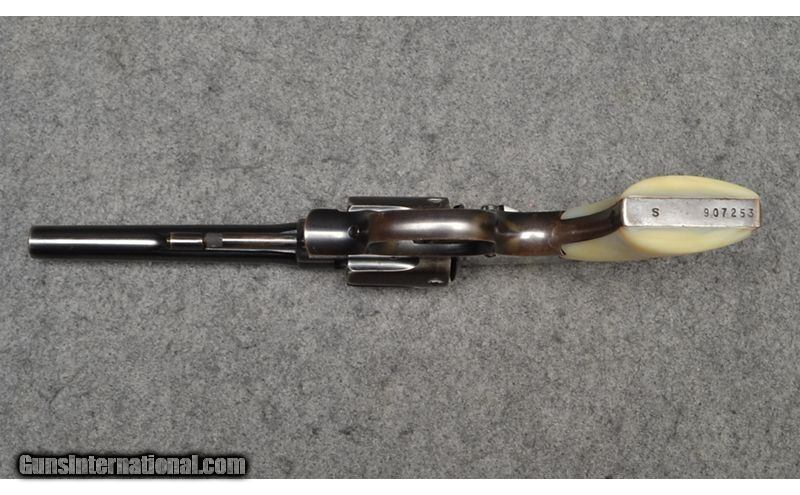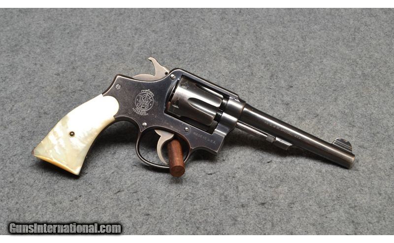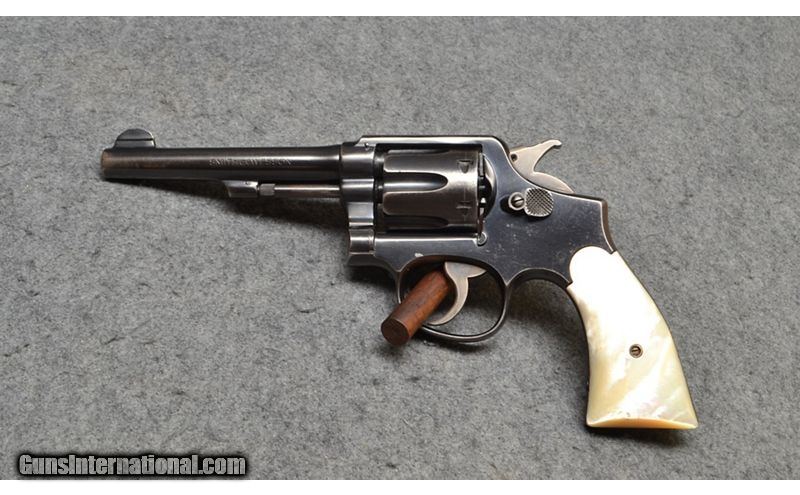 Description: This revolver is a Smith & Wesson .38 Military and Police, also known as a "Pre Model 10" chambered in .38 S&W Special. It has mother-of-pearl grips, five inch tapered barrel, and pinned barrel. This firearm is in good condition overall, with finish wear and light scratches. It comes with a soft case. .38 S&W Special SOLD Metal Condition: "Good, some light finish wear on high contact areas, especially around the grip and muzzle, some small scratches and scuffs, stampings still very crisp Wood Condition: "Grip condition is good, small chip on right grip near butt Bore Condition: Bright and shiny with visible rifling Barrels: 5" tapered Fore End: Smooth mother-of-pearl grips Weight: 2lbs 2oz Sights: "Blade front sight, grooved rear Item Location: Wichita, KS |