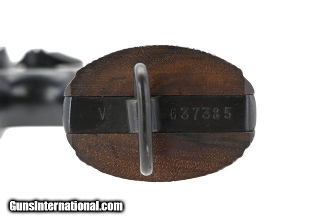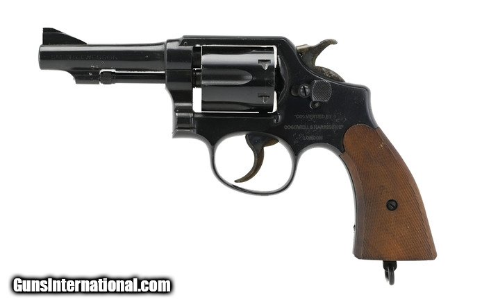 Description: Smith & Wesson Victory .38 Special caliber revolver. U.S. Victory model converted to .38 Special in England and “sporterized” with a ramp sight, blue finish and wood grips. Very good condition.