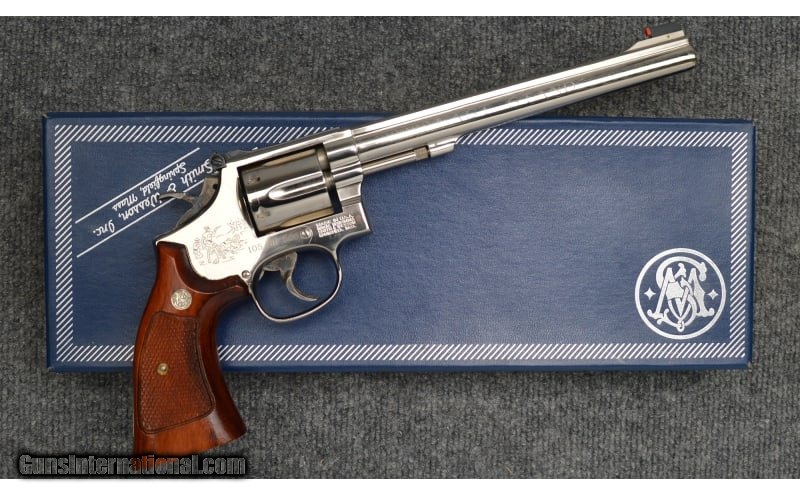Description: For your consideration, a Smith & Wesson model 14-5 chambered in .38 Special. This piece is part of a complete set of S&W's 1990 "Twelve Revolvers" which was a subscription-based gun-of-the-month limited edition set exclusive to the distributor, Ellett Brothers of Chapin, SC. Note: this revolver and it's 11 companions are being sold as a set and WILL NOT be subdivided. The price for the entire set is $15,999.99. Please DO NOT inquire with offers of individual purchase, as they will not be entertained. The sideplates of each constituent revolver feature a miniature rendition of art from a classic S&W advertisement rendered via S&W's Lasersmith process. Original artwork can be viewed in the accompanying book. 500 such sets were to be made, but the business relationship between S&W and Ellett Bros. parted before completion; thereby making the number of complete sets, while unknown, lower than the intended issuance. Furthermore, the number of sets never originally purchased in full or since broken up makes this complete set quite scarce and desirable. This set is numbered 105 of 500. Each of the guns in the set appear to be unfired and include their factory box. .38 Special SOLD Chambers: 6 Metal Condition: Excellent Wood Condition: Excellent Bore Condition: Excellent Barrels: 8 3/8 Triggers: Serrated Weight: 2.5 lbs Sights: Iron Sights Item Location: Hamburg, PA |