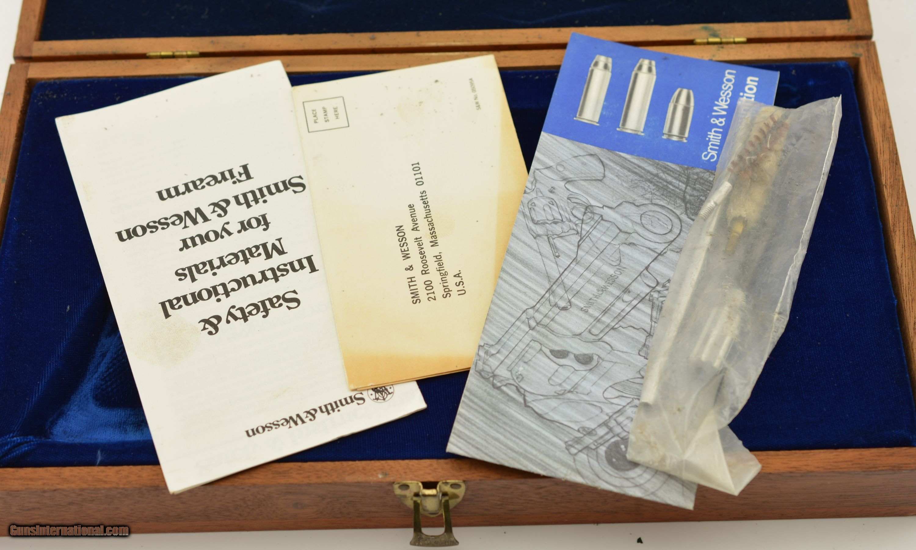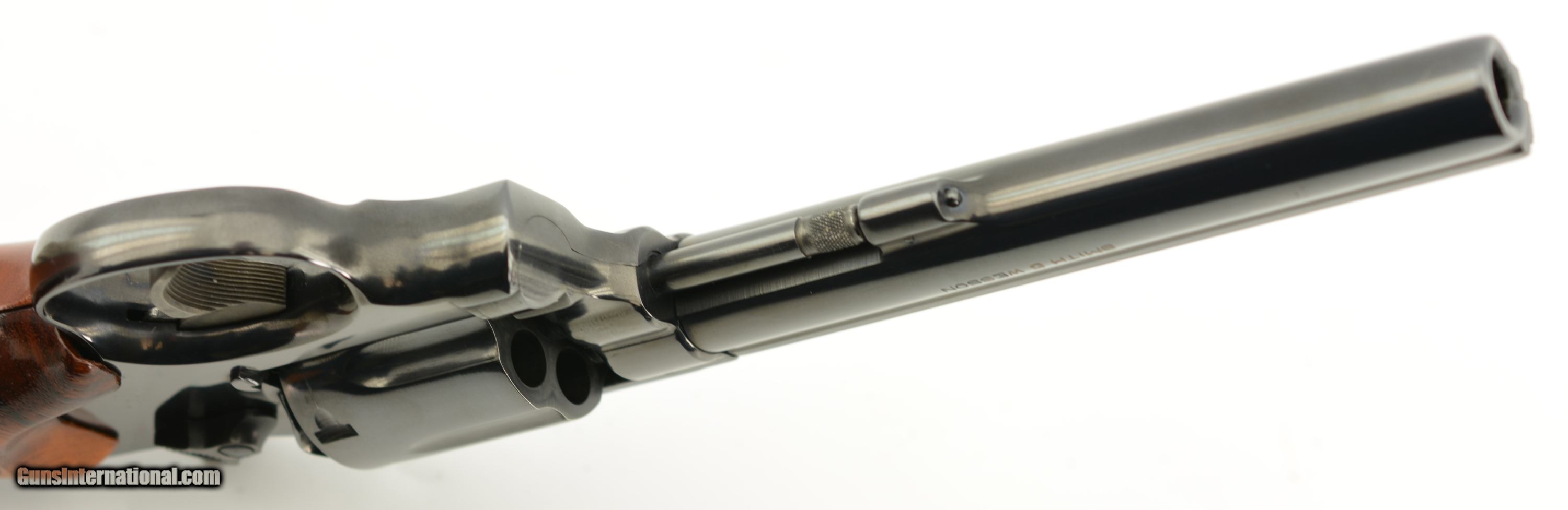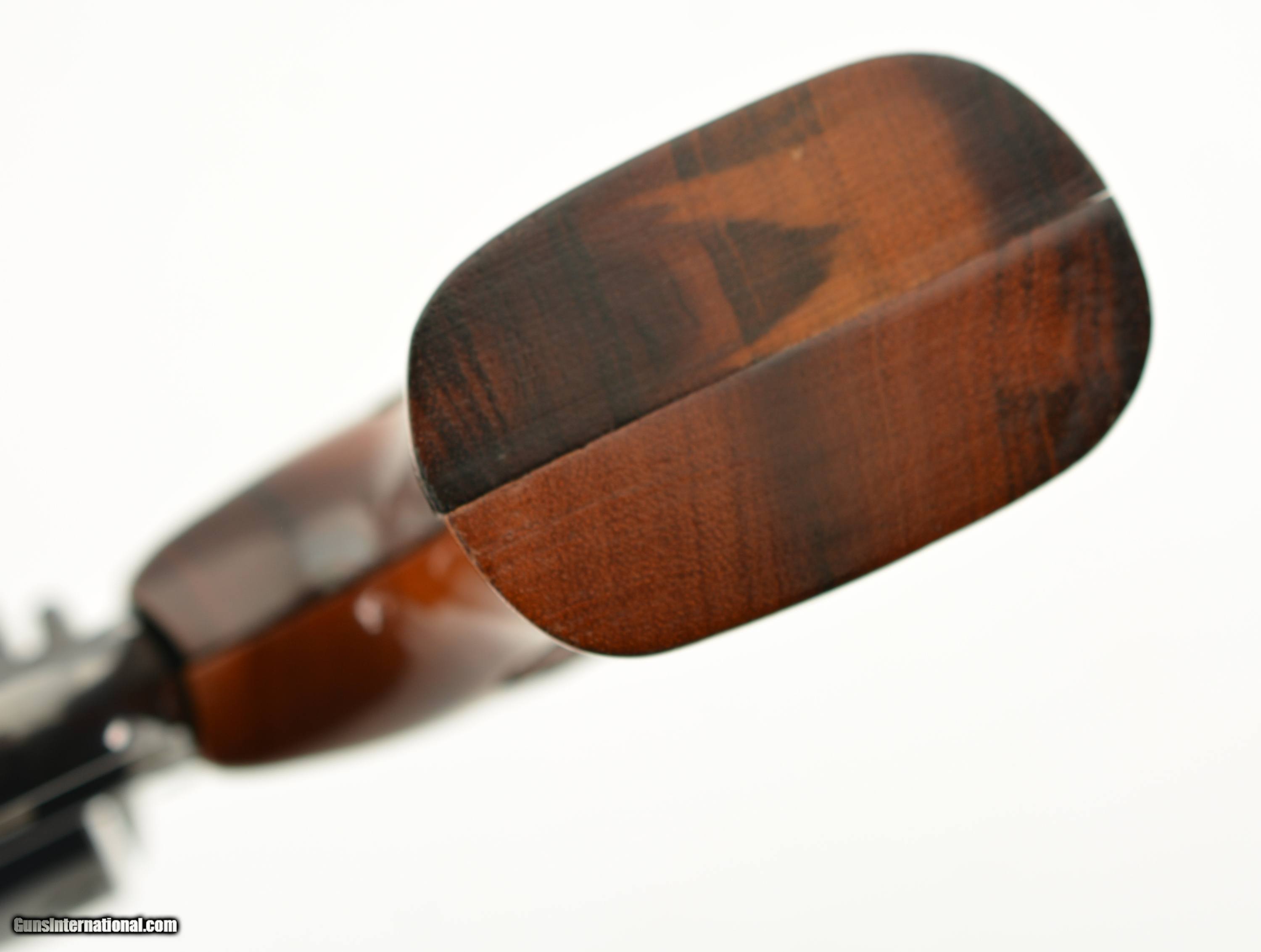 Description: Serial #8K199840, .38 Special, 6" barrel with an excellent, bright bore. This is a handsome revolver, made ca. 1967, and retains 98-99% of the original blue finish with only a mild turn-ring on the hammer, and some minor fading on the yoke hinge indicating any use. The target hammer and trigger are likewise in excellent condition with brilliant original color case-hardening remaining. The revolver is fitted with a Patridge front sight, painted white on the rear, and the Goncalo Alves target stocks are in excellent condition with .38 Special case rim inserts at the butt on either side. The grip screw is stripped and will not tighten. The revolver is housed in a relined S&W wooden presentation case with paper and tool kit. This is an excellent example of a desirable K-Frame .38. FFL or C&R SOLD Manufacturer: S&W Model: 14 Serial Number: 8K199840 Caliber Info: .38 Spl Gauge Info: .38 Spl |