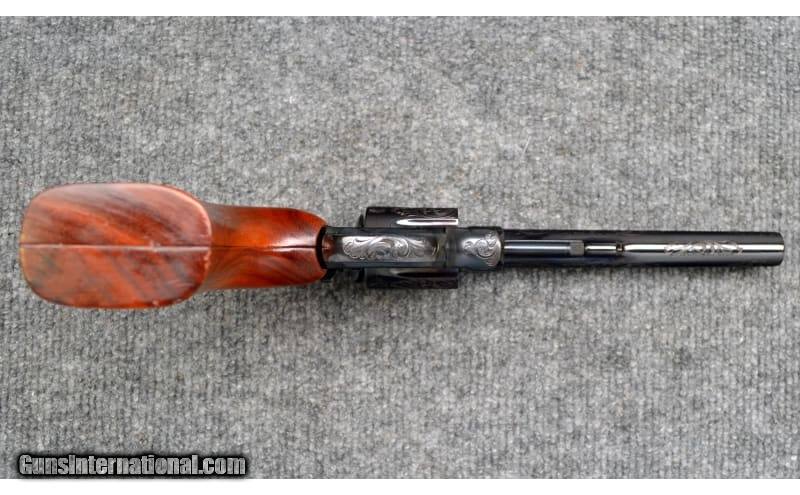 Description: For your consideration, a Smith & Wesson model 14-4 chambered in .38 Special. This piece features B coverage acanthus scroll work on barrel, frame, and cylinder. .38 Special SOLD Chambers: 6 Metal Condition: Excellent Wood Condition: Excellent Bore Condition: Excellent Barrels: 6 Triggers: Serrated Face Weight: 2.25 lbs Sights: Iron Sights Item Location: Hamburg, PA |